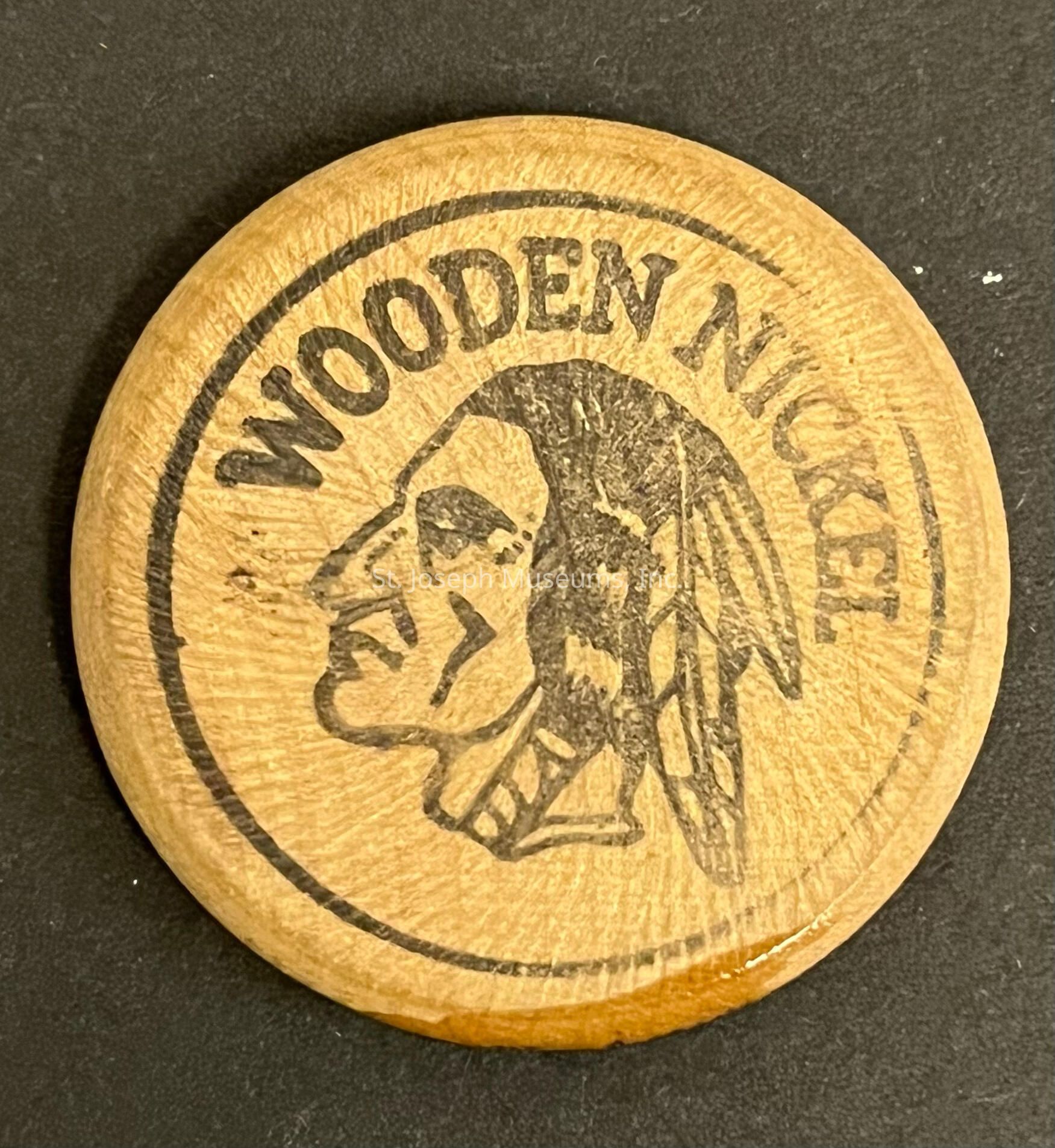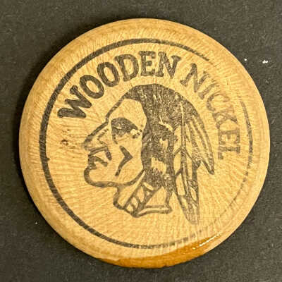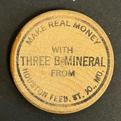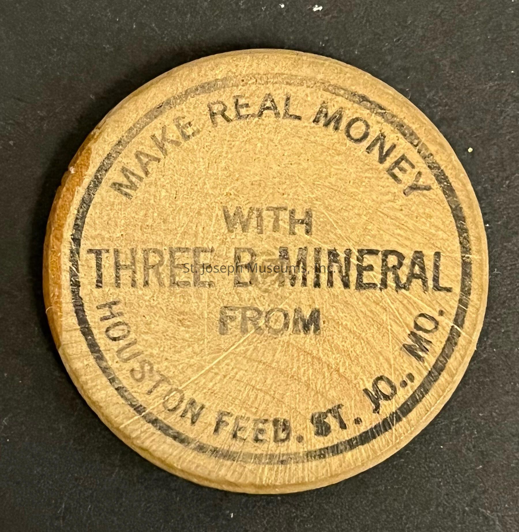 Wooden Nickel/Tan/picture of a Native American Head/Black Printing "Wooden Nickel Make Real Money With Three B Mineral From Houston Feed. St. Jo., MO."/1.25" disc.