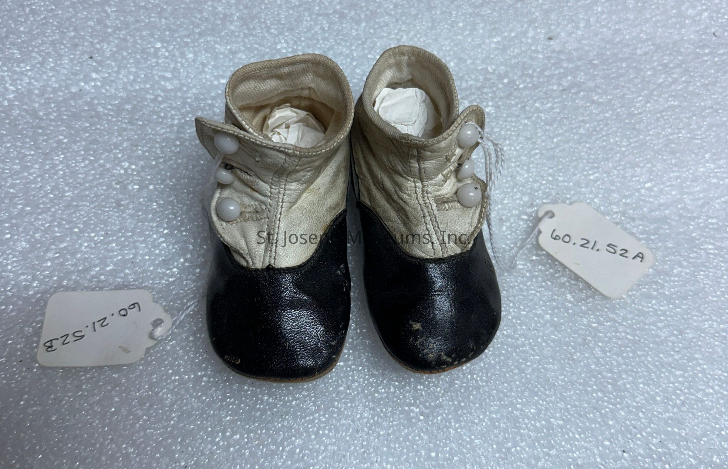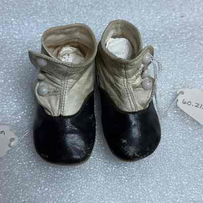 The image displays a pair of baby shoes, showcasing a classic design with black leather toes and white uppers, fastened by white buttons.
