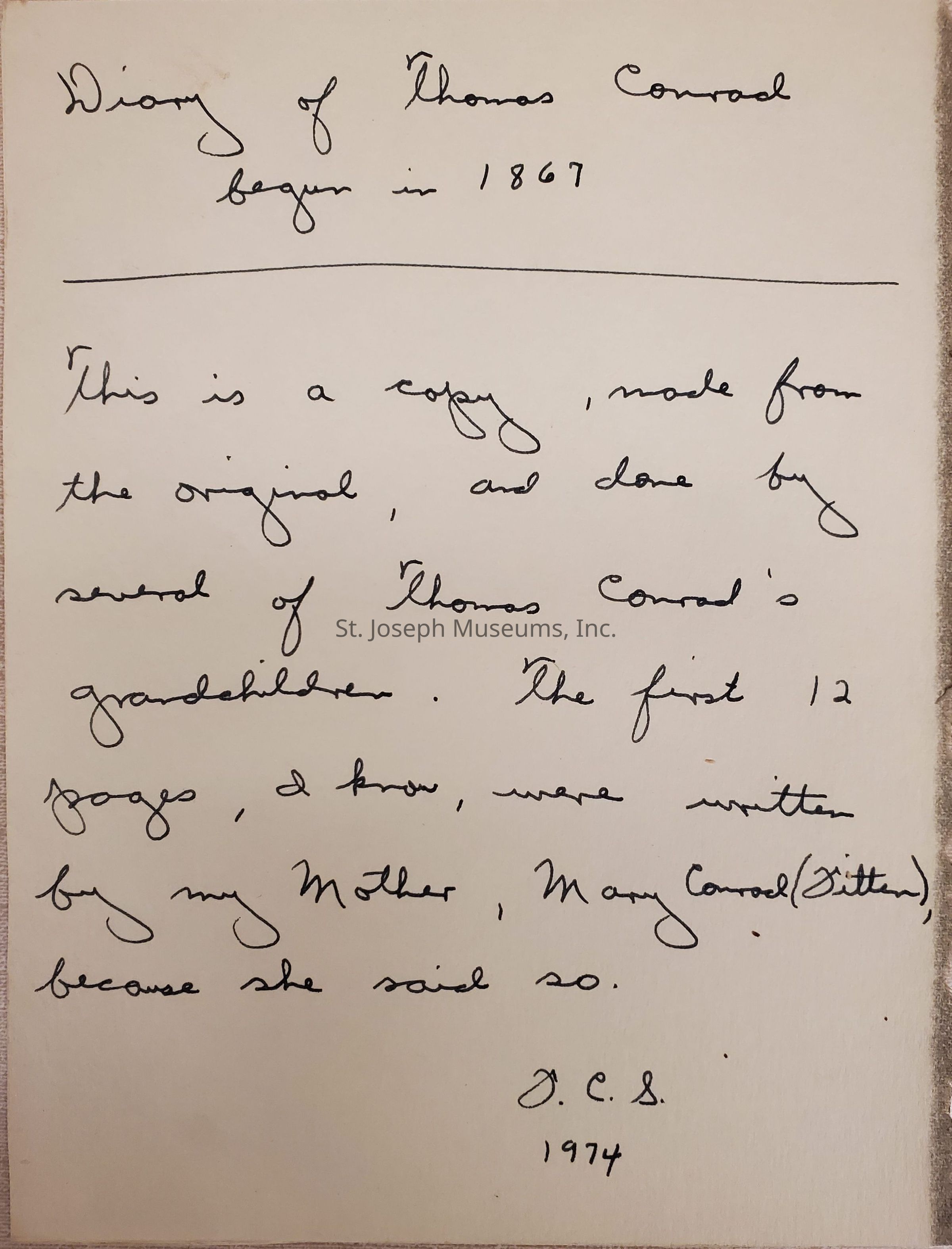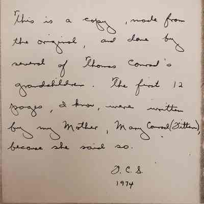 This is a copy, made from the original, and done by several of Thomas Conrad's grandchildren. The first 23 pages, I know, were written by my Mother, Mary Conrad (Fitten) because she said so. F.C.S. 1974"Collection