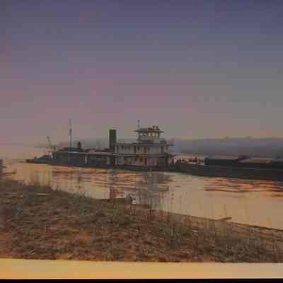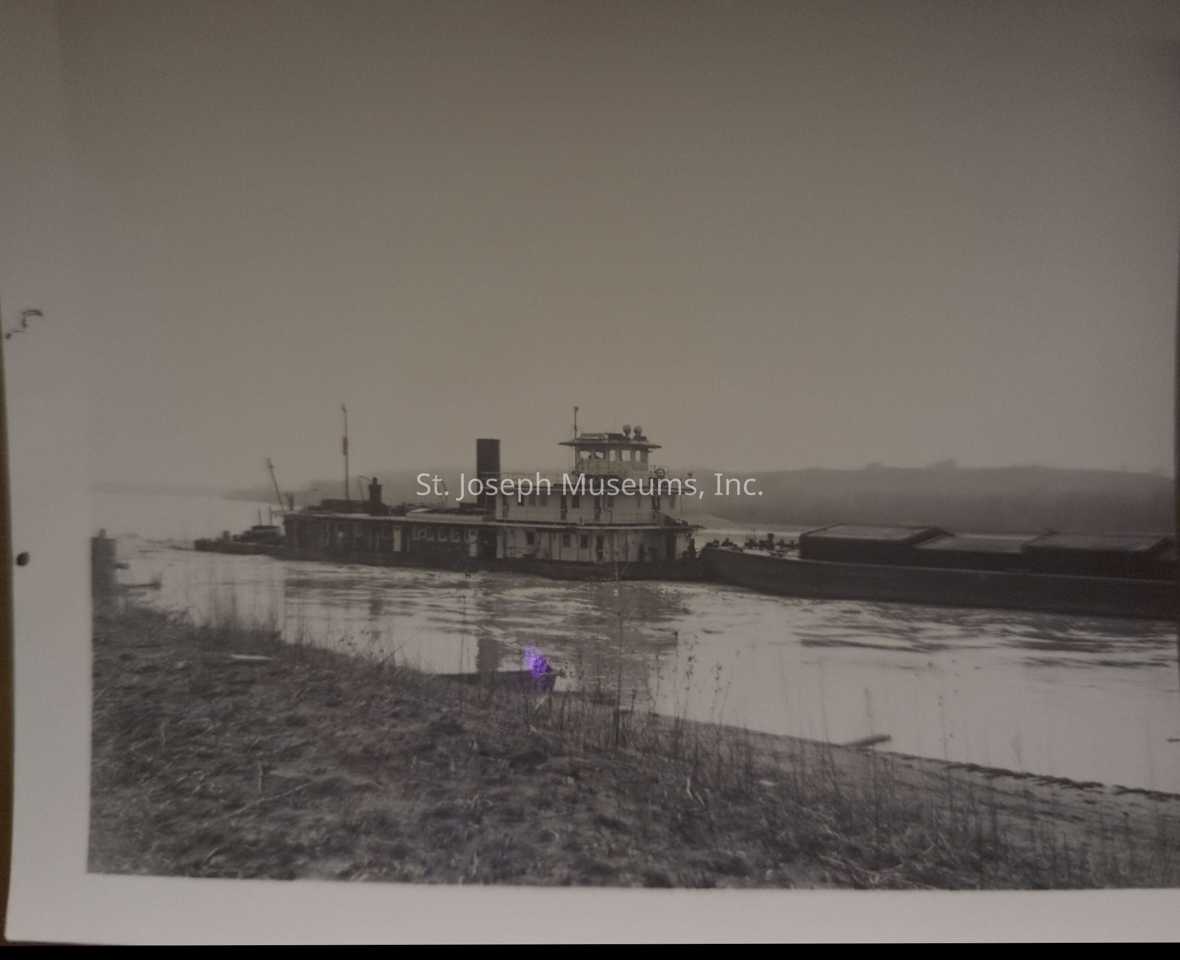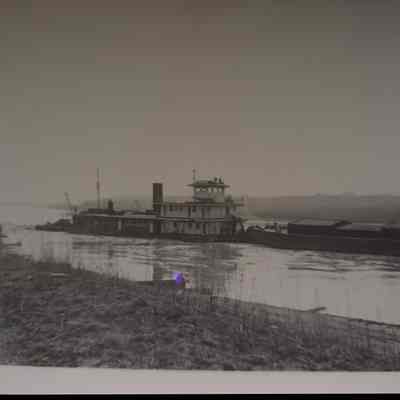 Black-and-white photograph of a barge navigating along the Missouri River, as a bridge connects the land on either side. The barge, with a flat structure and numerous sections, glides smoothly over the water. The foreground shows a riverbank strewn with logs and driftwood.
