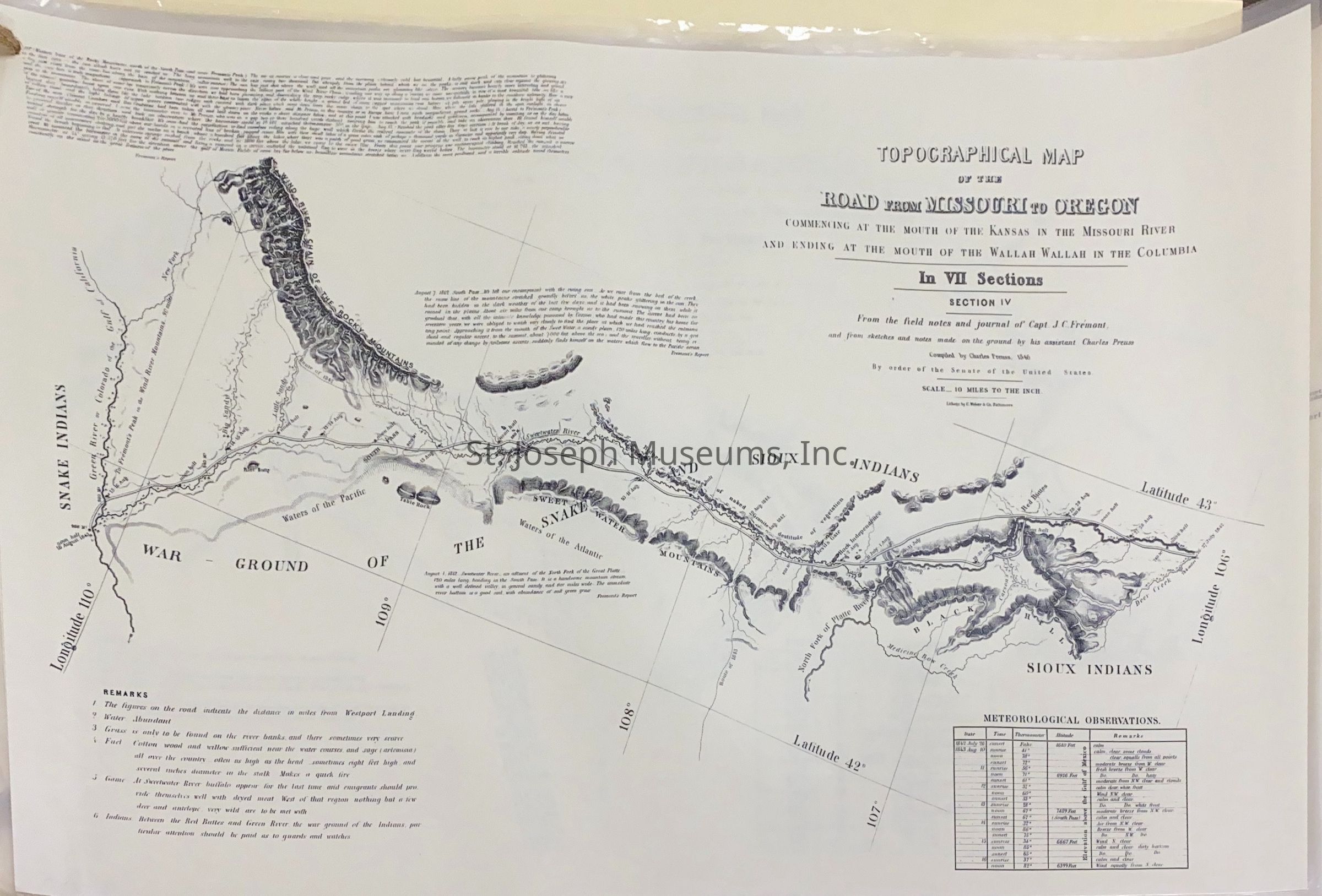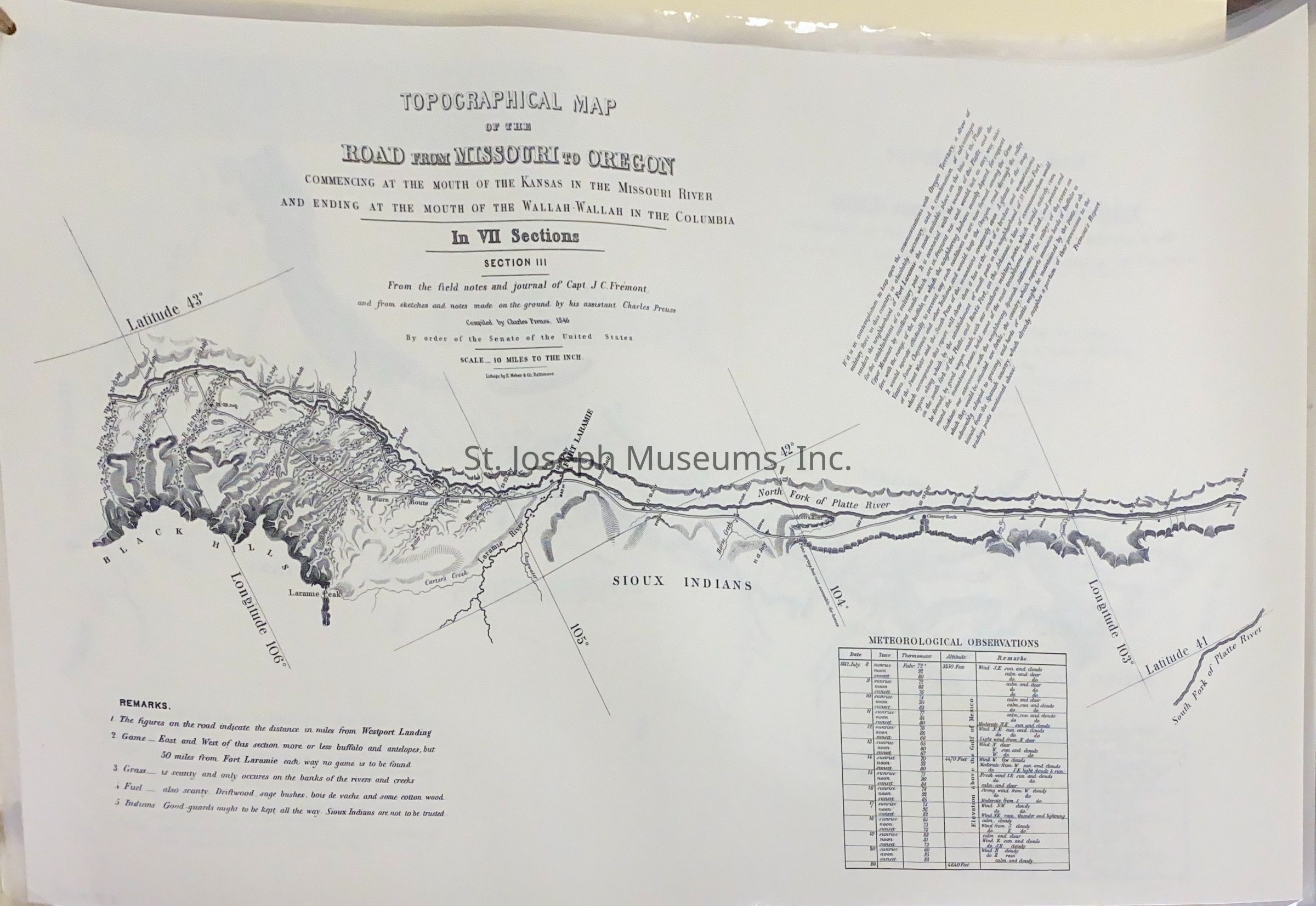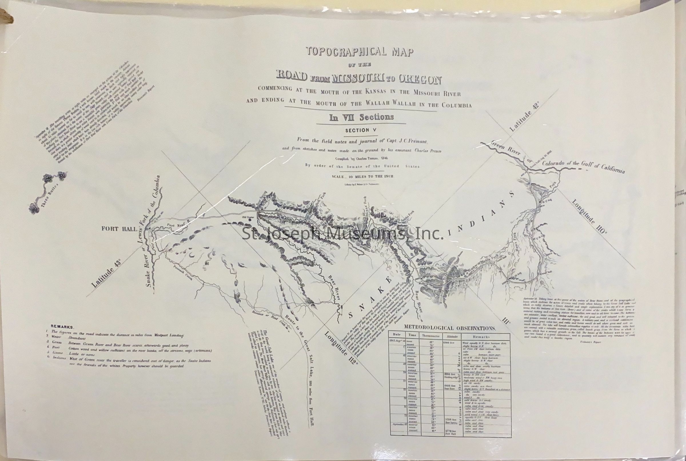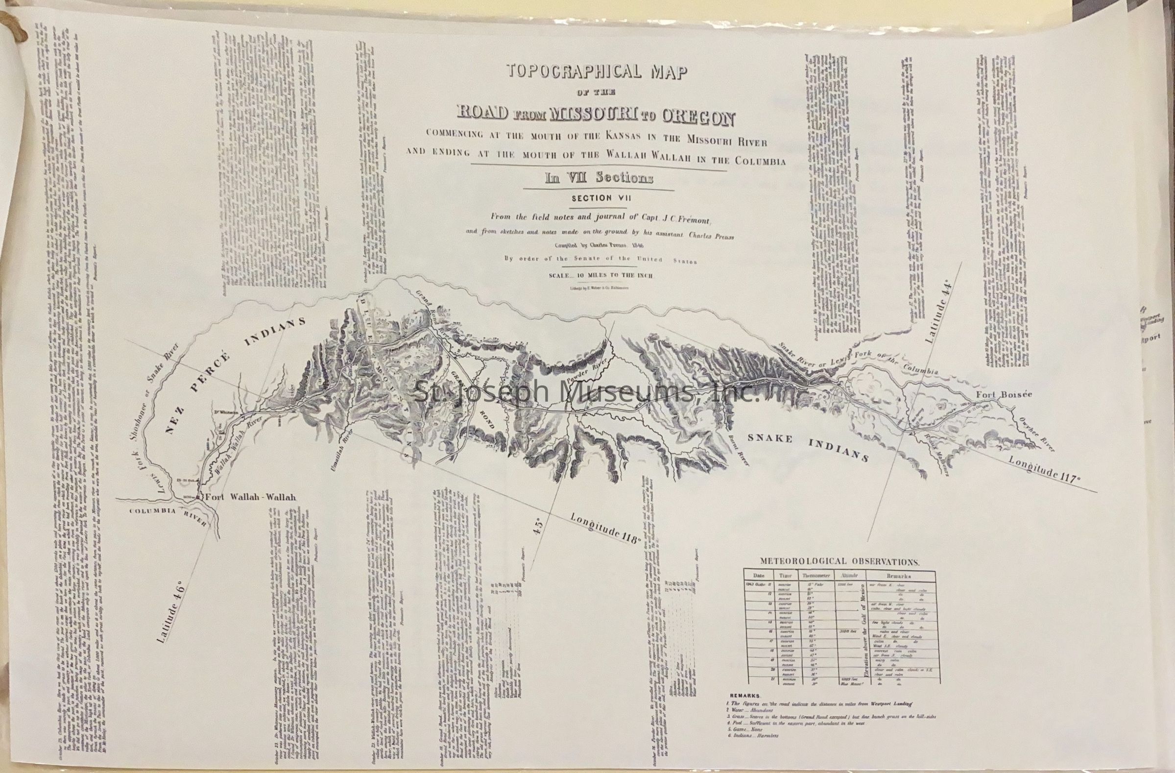 Road from Missouri to Oregon, Fremont's Topographical Map, 1946. "Topographical Map of the Road from Missouri to Oregon, commencing at the Mouth of the Kansas in the Missouri River and Ending at the Mouth of the Wallah Wallah in the Columbia. In VII Sections, From the field notes and journal of Capt. J.C. Fremont and from sketches and notes made on the ground by his assistant, Charles Preuss. compiled by Charles Preuss, 1846, by order of the Senate of the United States."