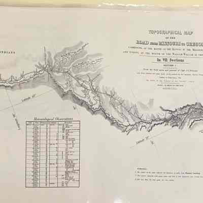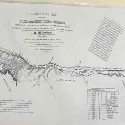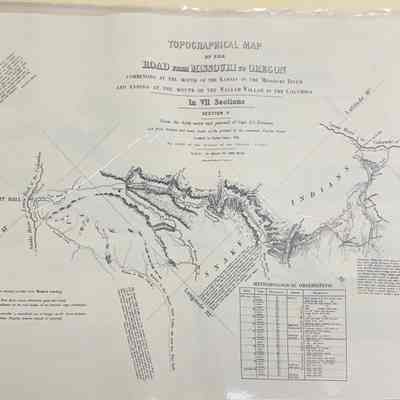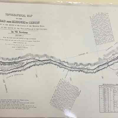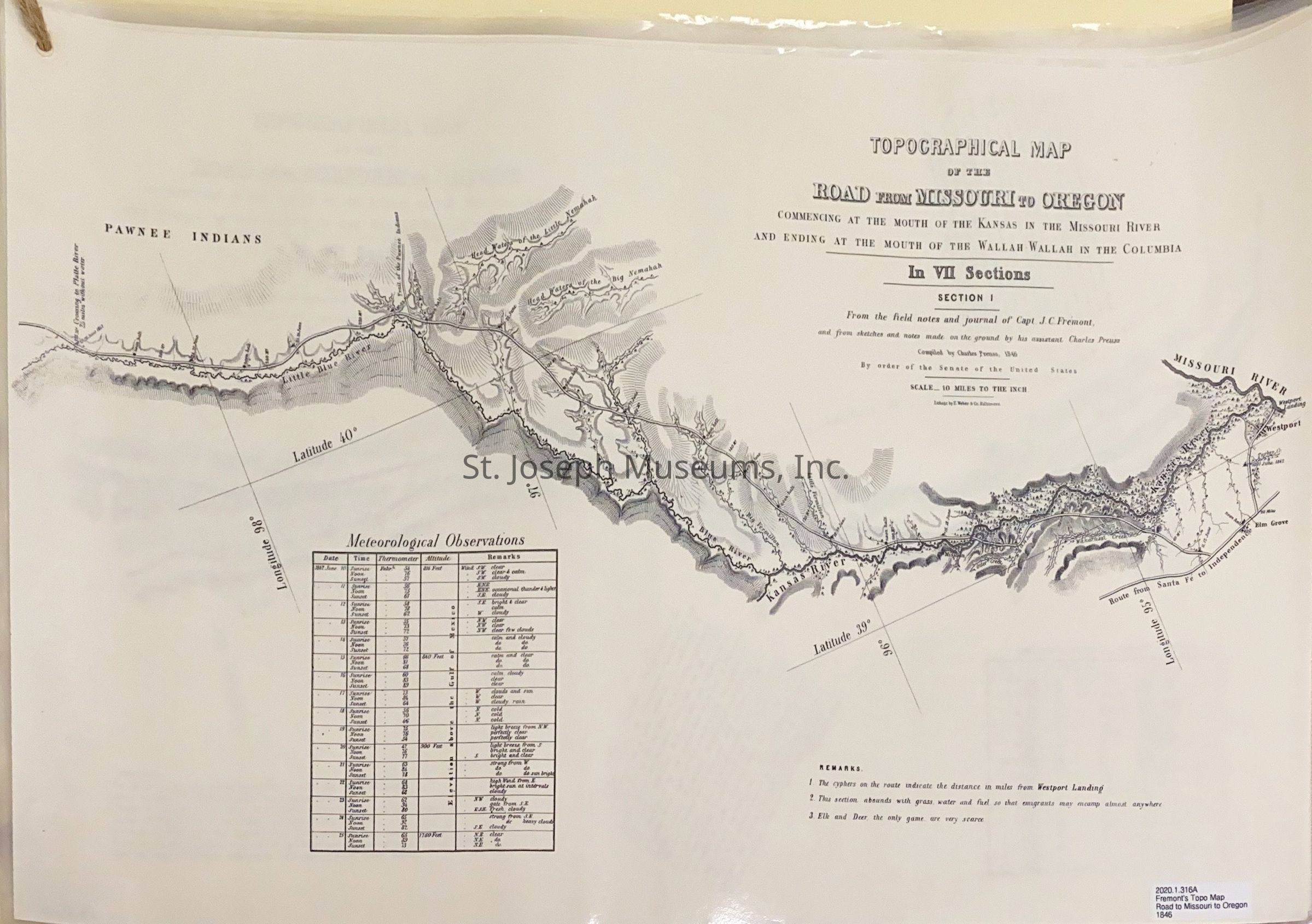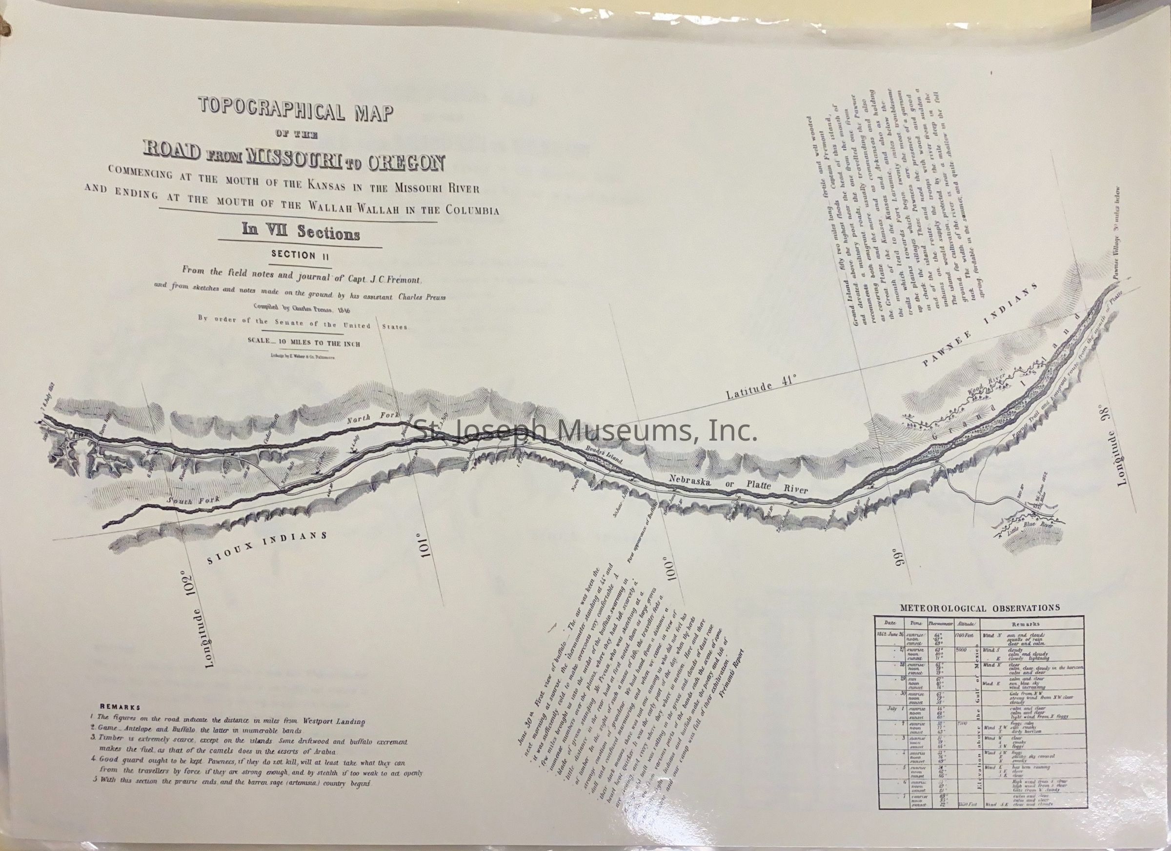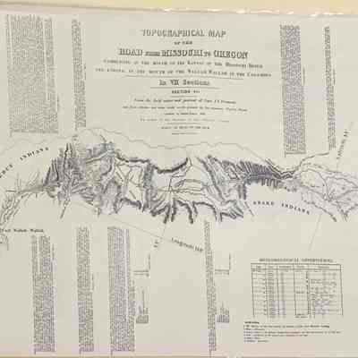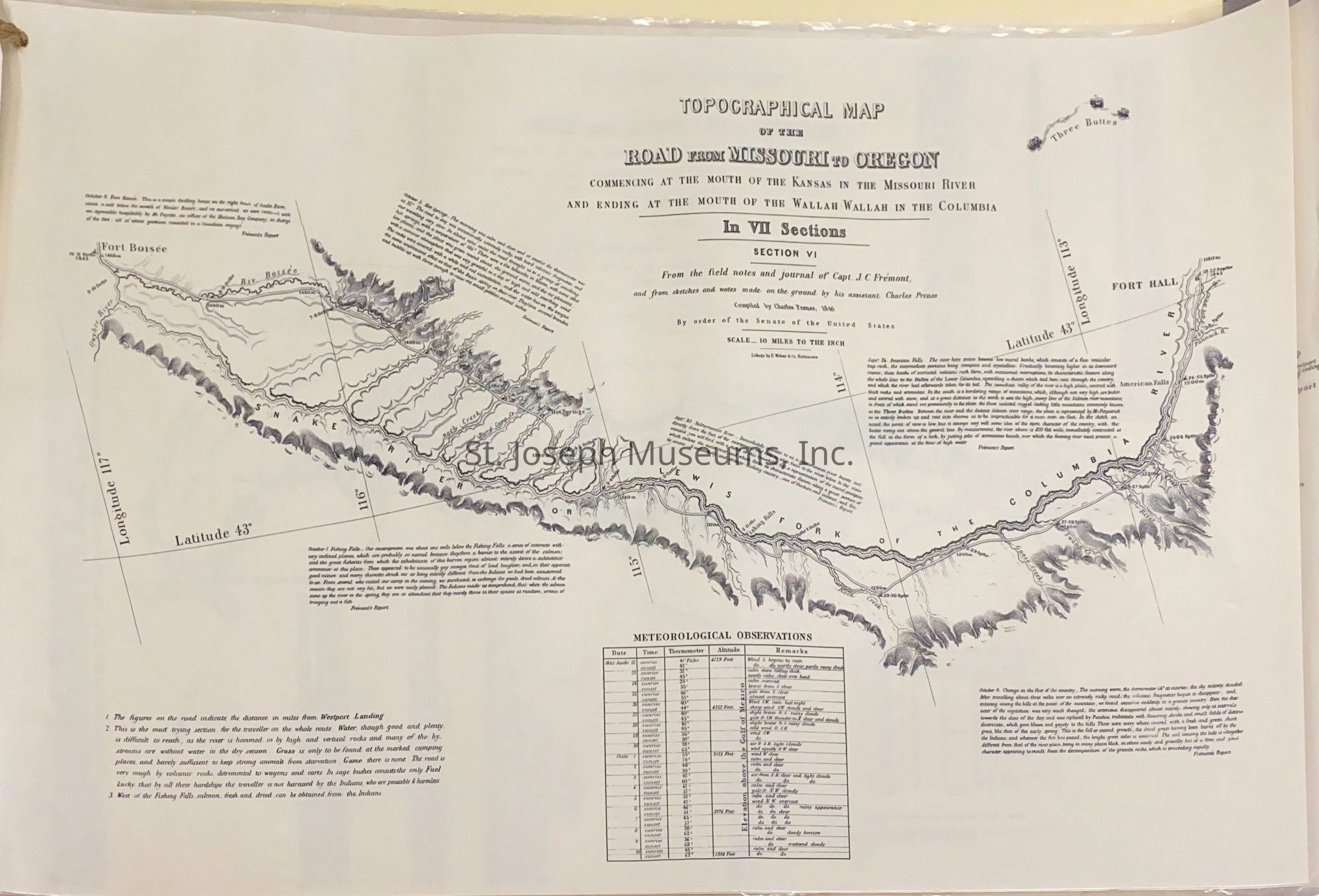 Road from Missouri to Oregon, Fremont's Topographical Map, 1946. "Topographical Map of the Road from Missouri to Oregon, commencing at the Mouth of the Kansas in the Missouri River and Ending at the Mouth of the Wallah Wallah in the Columbia. In VII Sections, From the field notes and journal of Capt. J.C. Fremont and from sketches and notes made on the ground by his assistant, Charles Preuss. compiled by Charles Preuss, 1846, by order of the Senate of the United States."