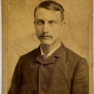 Graham Artistic Photographer Photo of Man, c. 1900. Studio portrait, bust view, of young man, 20-30 age range. He is wearing a check patterned suit jacked buttoned at top button, striped tie, collar turned down. He has medium color hair and mustache. He has piercing eyes. Unidentified. Sepia, 4¼" x 6½" on cardboard backing.Made/Created