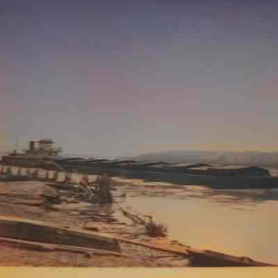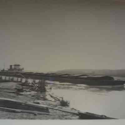 Black-and-white photograph of a barge navigating along the Missouri River, as a bridge connects the land on either side. The barge, with a flat structure and numerous sections, glides smoothly over the water. The foreground shows a riverbank strewn with logs and driftwood.