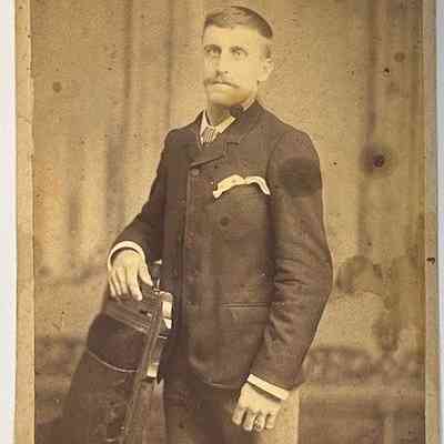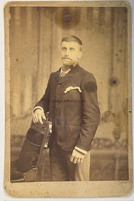 Graham Artistic Photographer Photo of Man with Pocket Handkerchief, c. 1885. Studio portrait, ¾ view, of young man, c. age 25, standing slightly sideways with arm on chair back. He has short hair and mustache, wearing dark suit jacket, buttoned at top, white shirt with striped tie. White handkerchief hangs lazily from jacket pocket. Lighter trousers. Similar to but different man than xxxx.1.79. Unidentified. Sepia, 4¼" x 6½" on cardboard backing.Made/Created