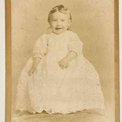 Hutchings Photographer Photo of Baby, c. 1900. Studio portrait of baby, about age 9 months, wearing long white gown with eyelet trim. She has light-colored hair, and a big smile. Unidentified. Sepia, 4¼" x 6½" on cardboard backing.Made/Created