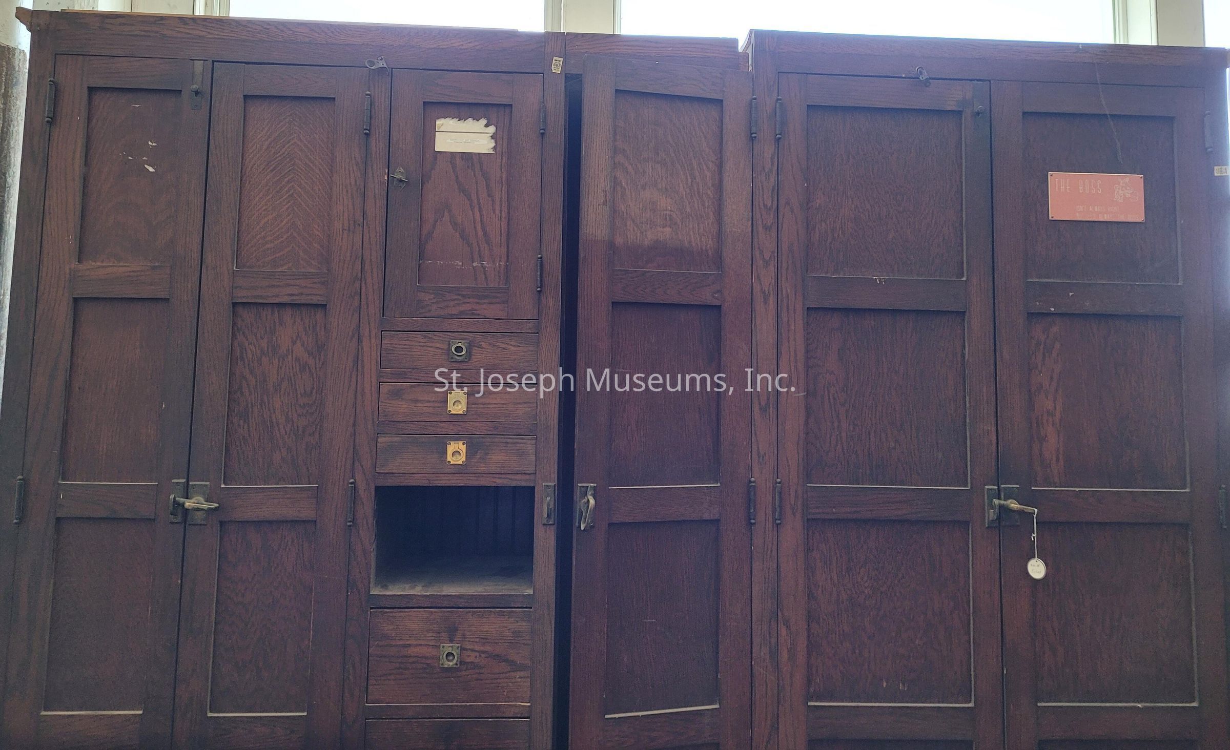 Wooden cabinet with plaque saying: "THE BOSS isn't always right but he's always the boss"