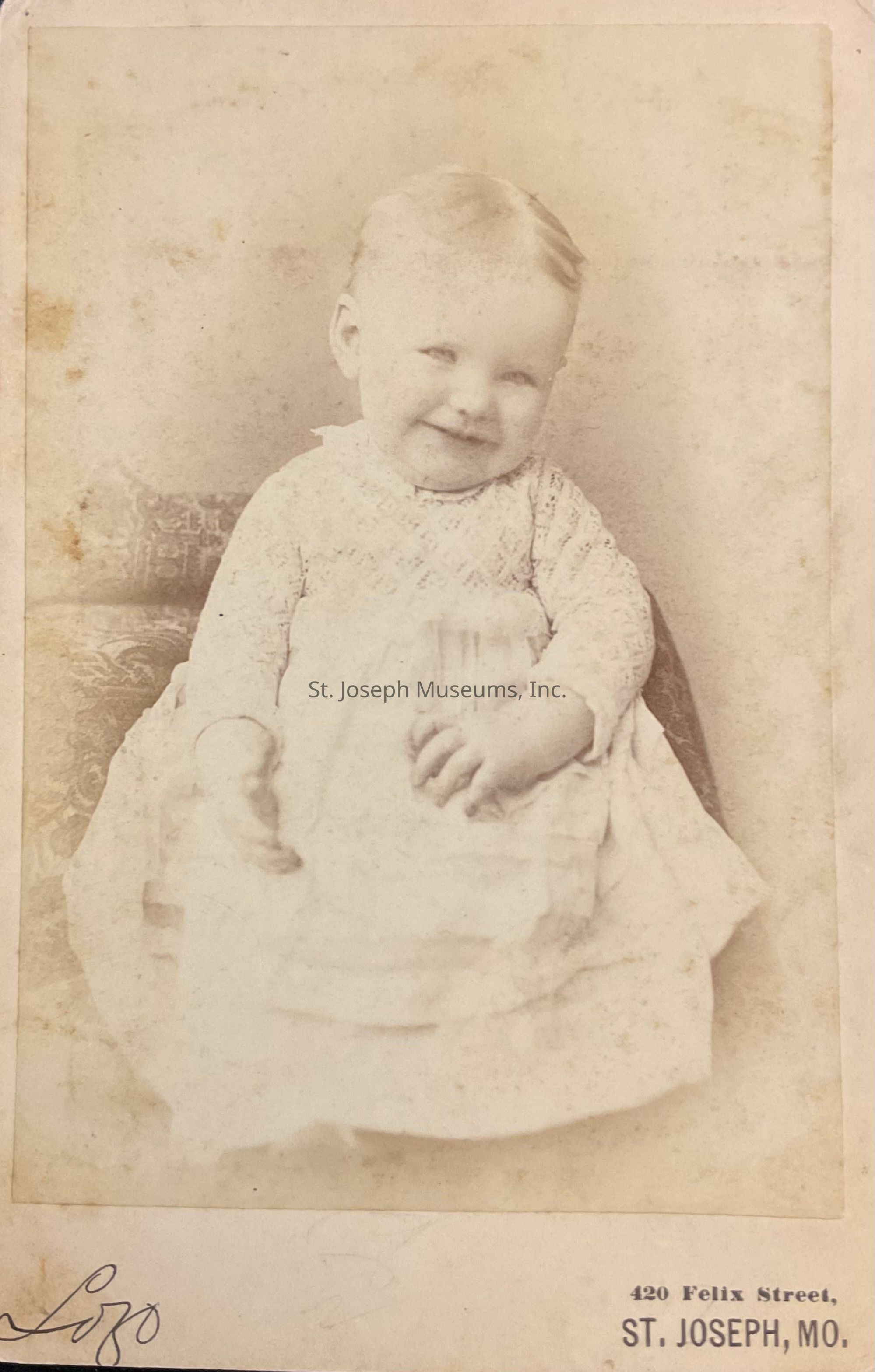 Alex Lozo Photographic Gallery of Art Photo of Baby, c. 1880. Studio portrait of baby, c. age 6 months. Baby has light hair and a very big smile. The baby is wearing a white gown with lace bodice. Unidentified. Sepia, 4¼" x 6½" on cardboard backing.Made/Created