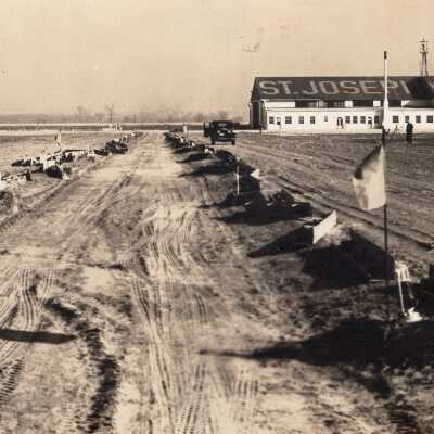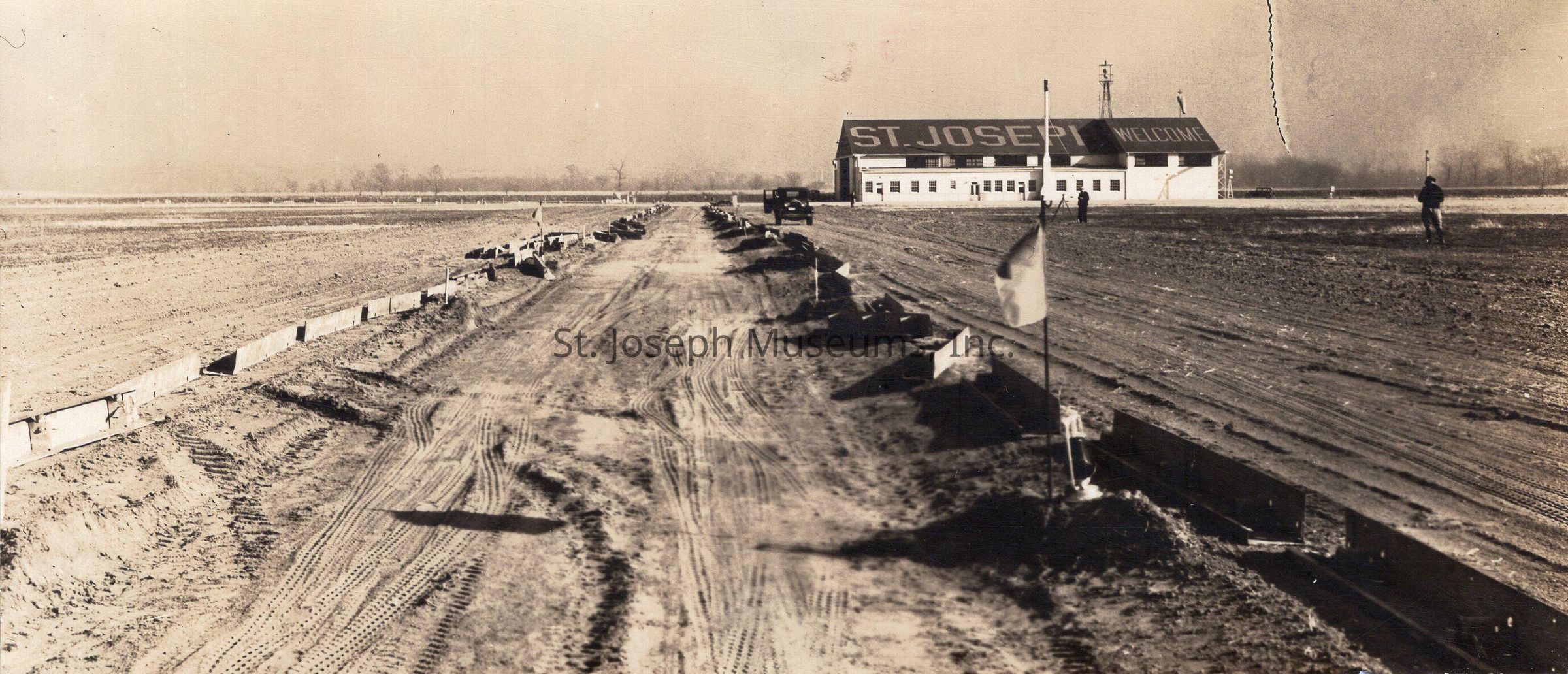 Airport on Belt Highway Photo by Shady, c. 1940s. b/w. Small photo of straight dirt "lane" lined on either side with some type of boards. St. Joseph, Welcome is painted in large letters on the roof of the white hangar on right in background. Handwritten on back: "Airport on Belt Hwy, east side, up from corner of Belt & Frederick."Collection