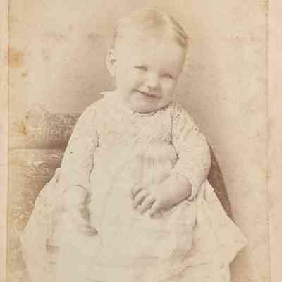 Alex Lozo Photographic Gallery of Art Photo of Baby, c. 1880. Studio portrait of baby, c. age 6 months. Baby has light hair and a very big smile. The baby is wearing a white gown with lace bodice. Unidentified. Sepia, 4¼" x 6½" on cardboard backing.Made/Created