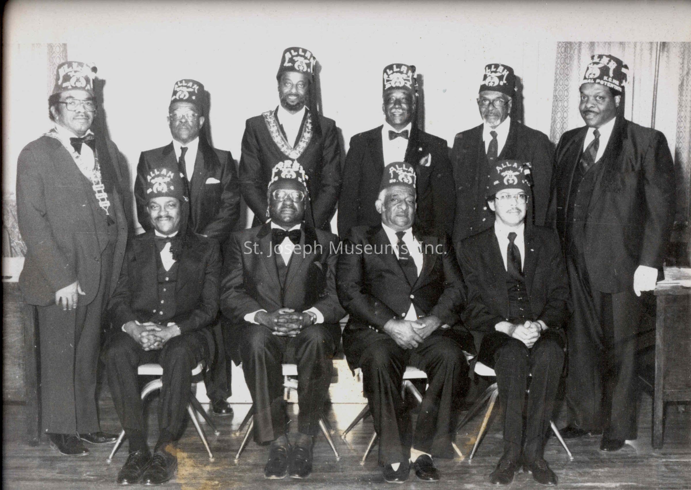 Allah Lodge, Black Moila Lodge Group Photo, c. 1980. Digital image of black/white photo. 10 men dressed in 3 piece suits and wearing fez hats with ALLAH and "Moila" crescent symbol. Back Row: Lawrence Johnson, KC (Standing) Thomas J. Cooper, Forrest Thomas, KC, Garcia Taylor, Carl Harris,