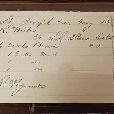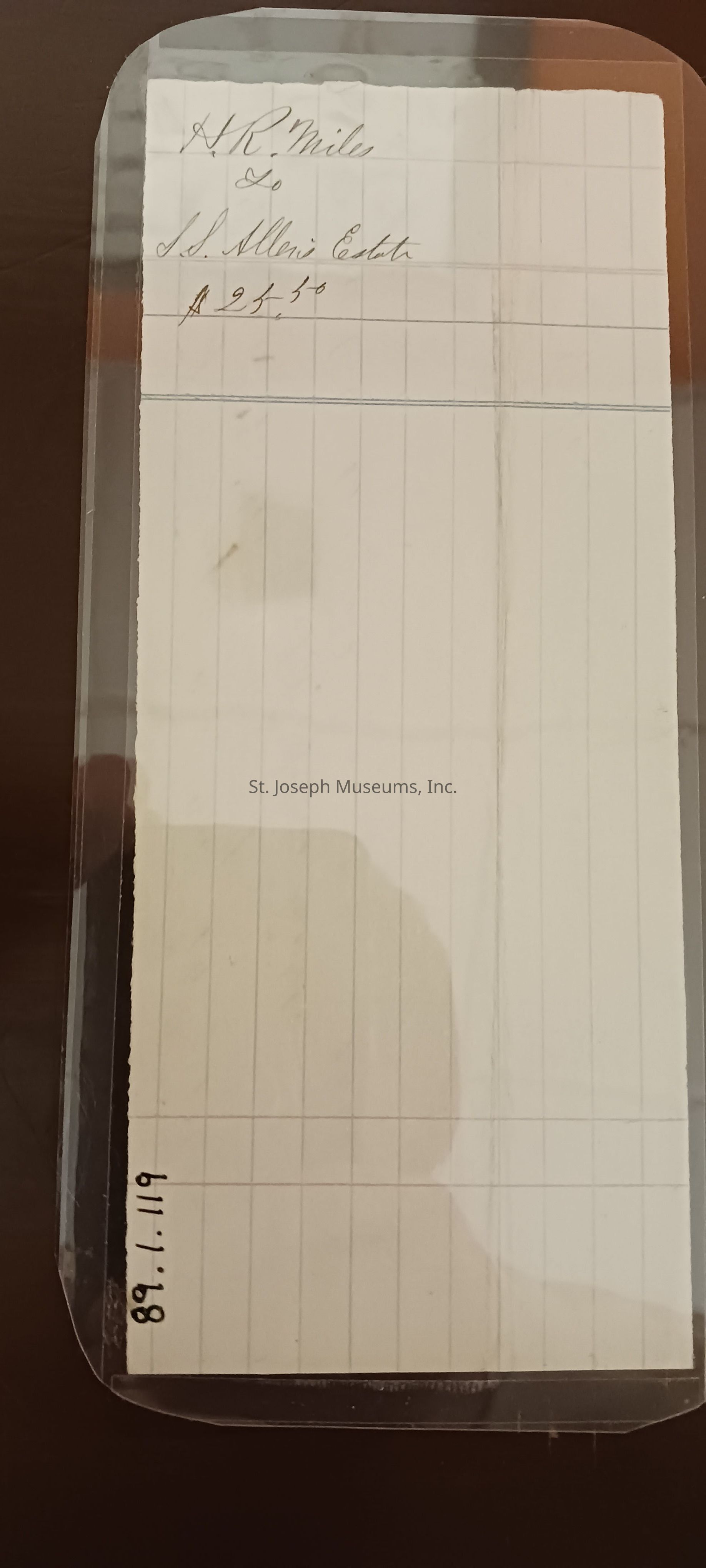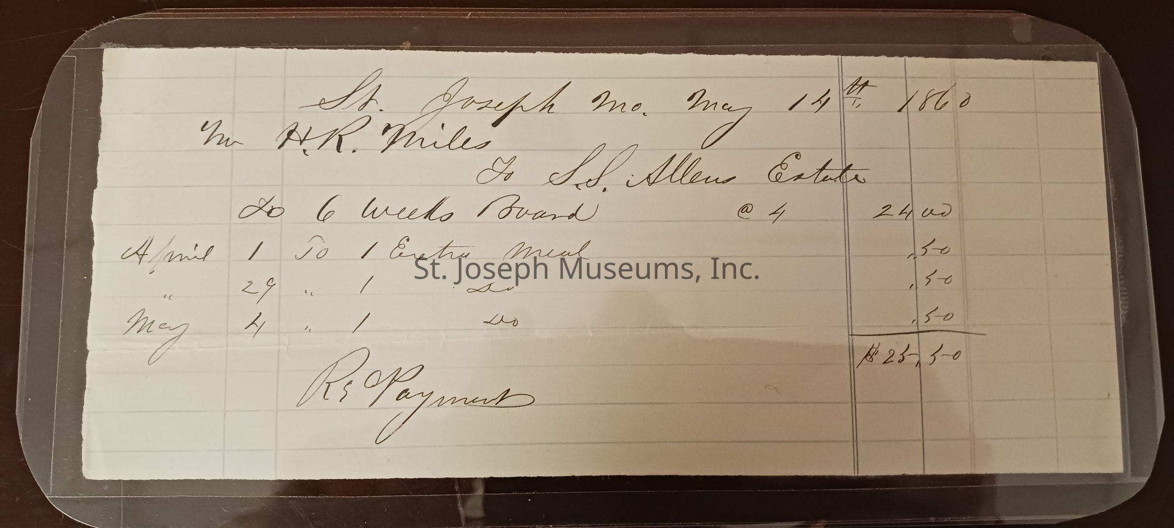 Allen, S. S. Estate Bill to H. R. Miles, 1860. The bill was for $25.50 for Mr. Miles 6 weeks board and one extra meal. Dated April 1-May4, 1860. The estate received payment.