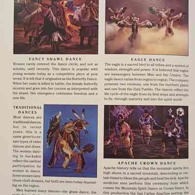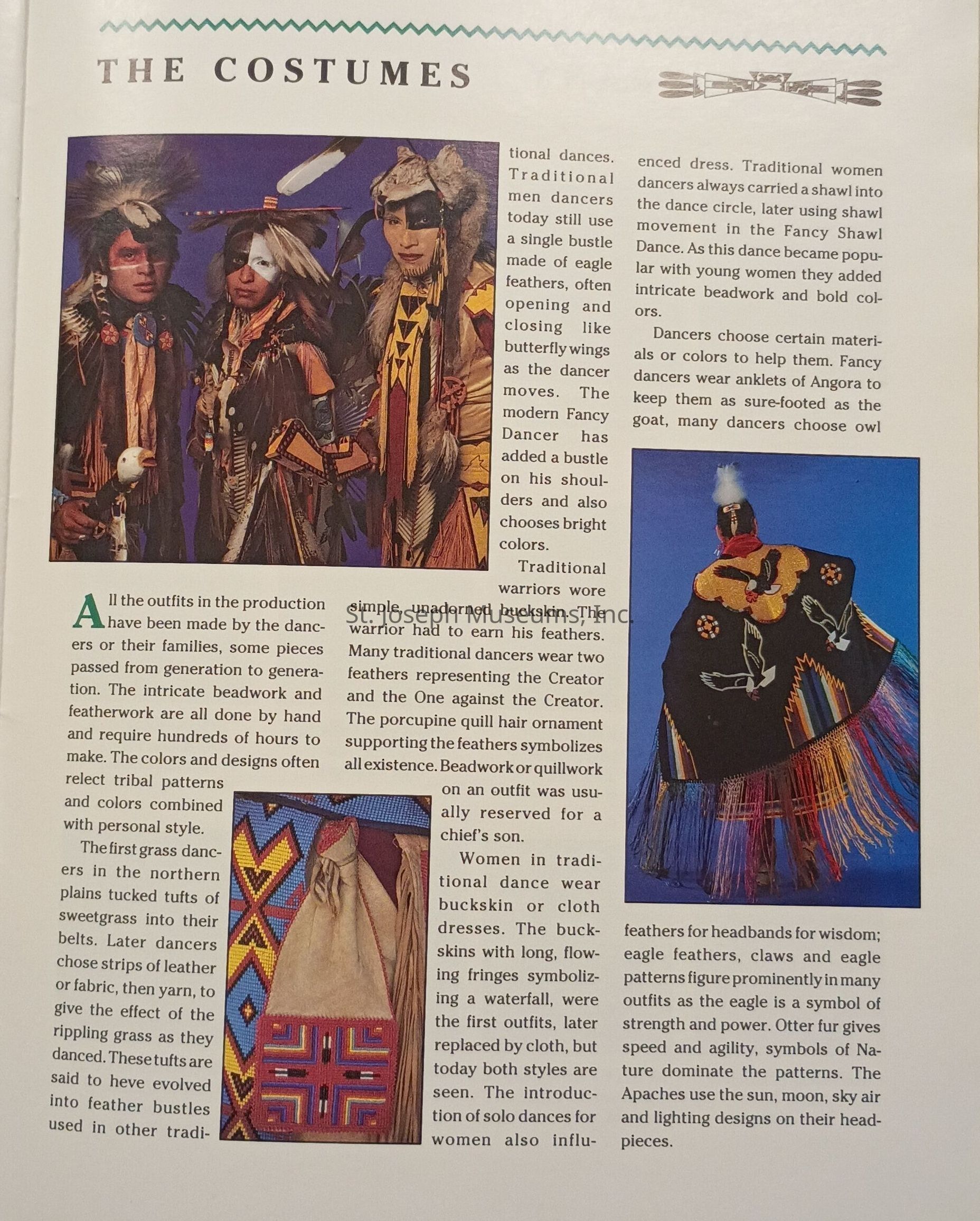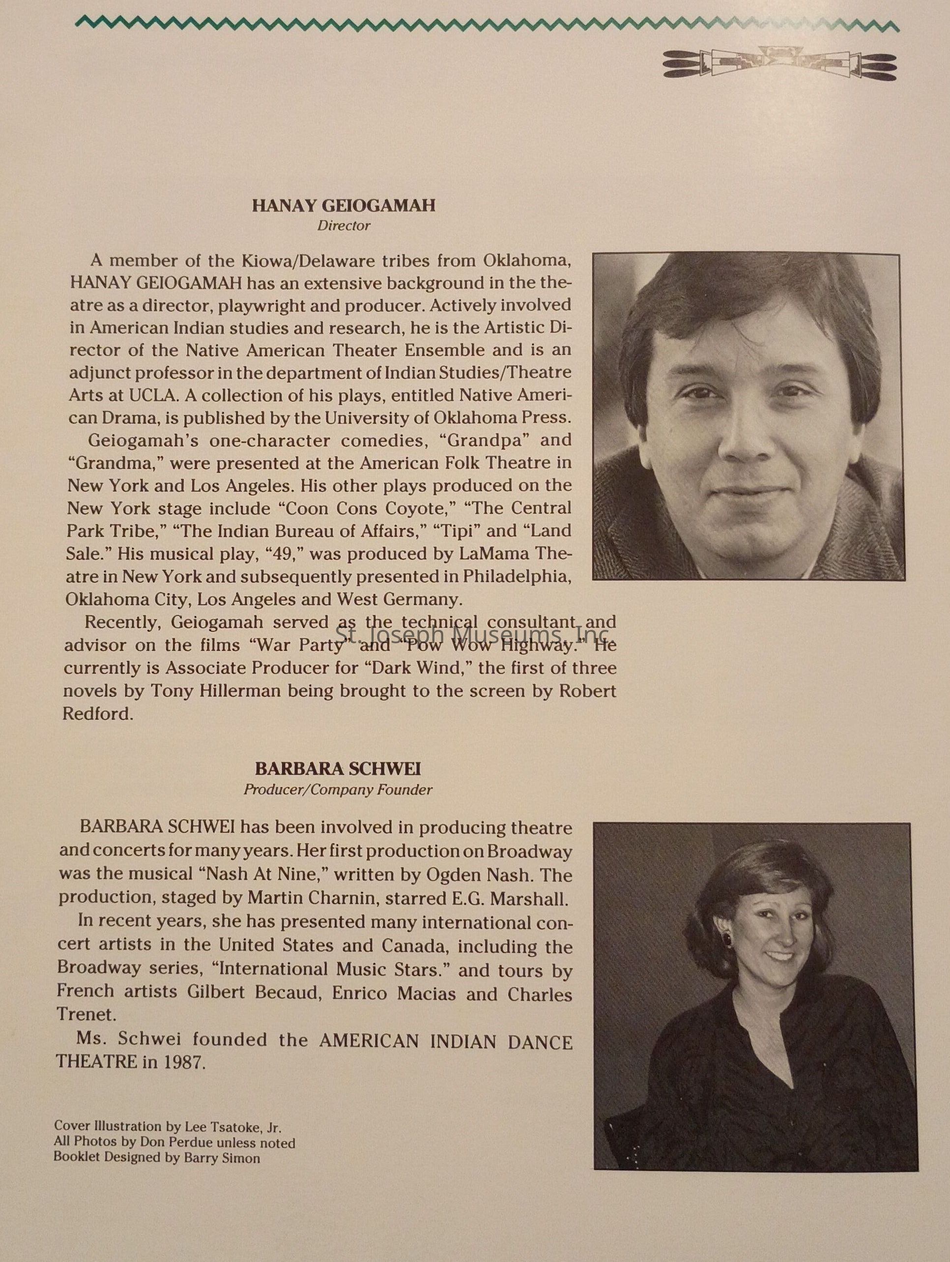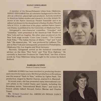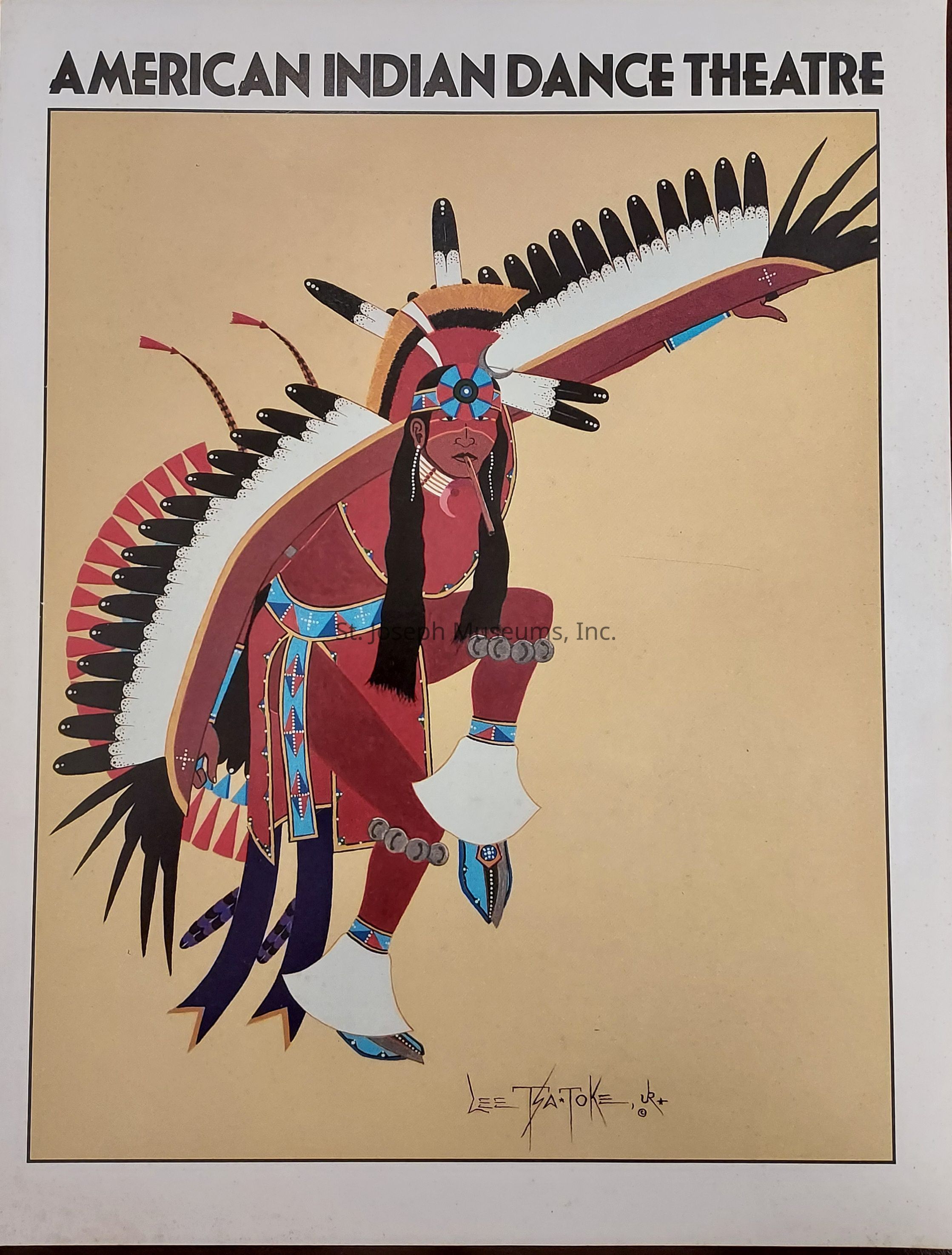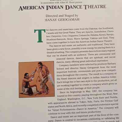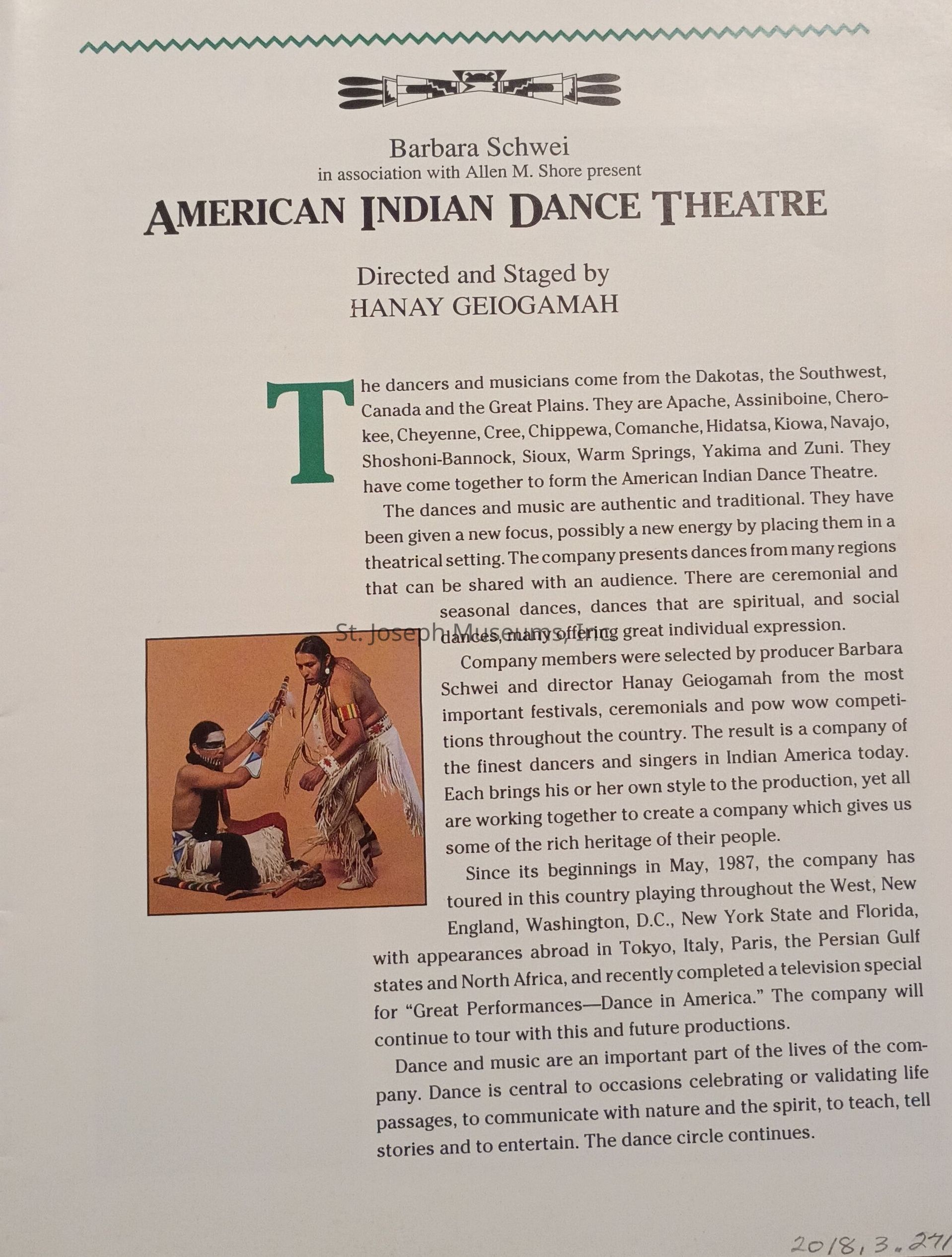 American Indian Dance Theatre Playbill, undated, but dance troupe originated in 1987. Directed and staged by Hanay Geiogamah. Dancers and musicians of many Native America nations provide dance and music. Color photographs of customs and dances.