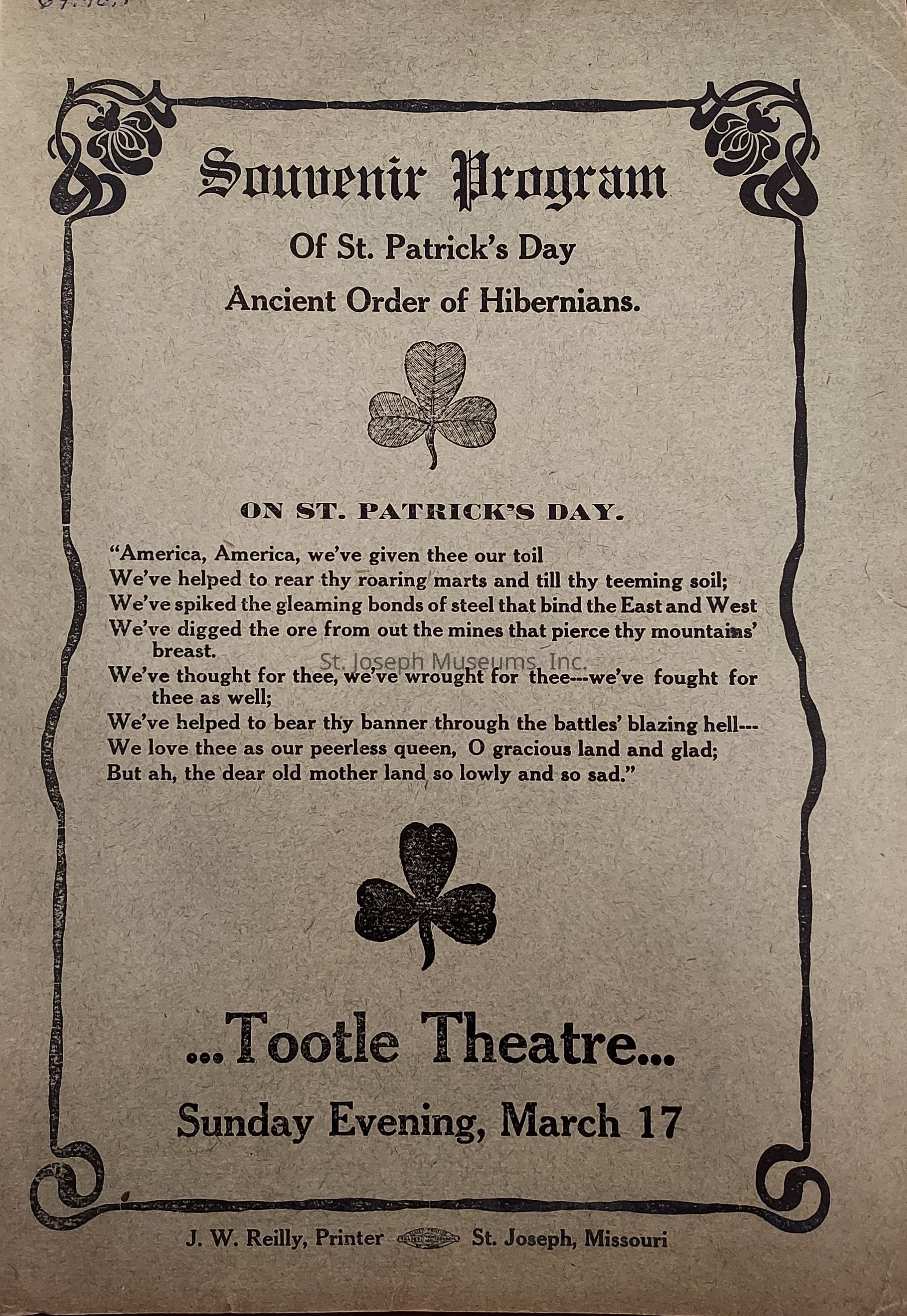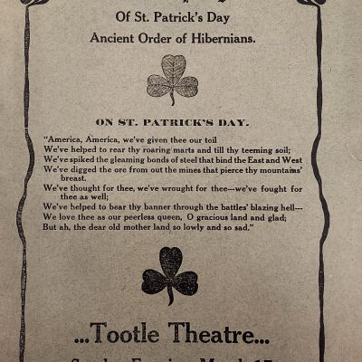 St. Patricks Day Celebrations 1912, Ancient Order of Hibernians, J.W. Reilly Printers, Social Clubs, Tootle Theater