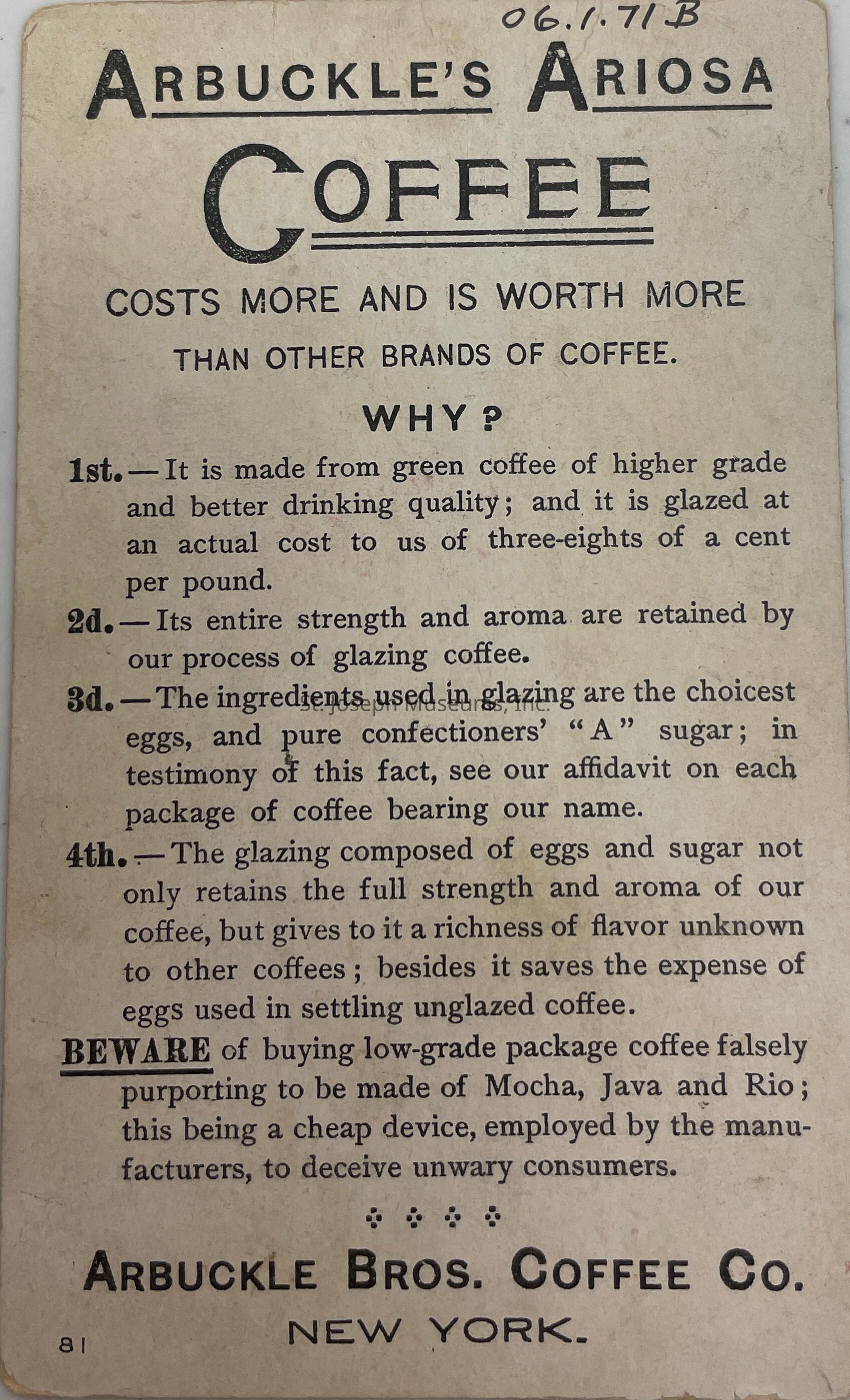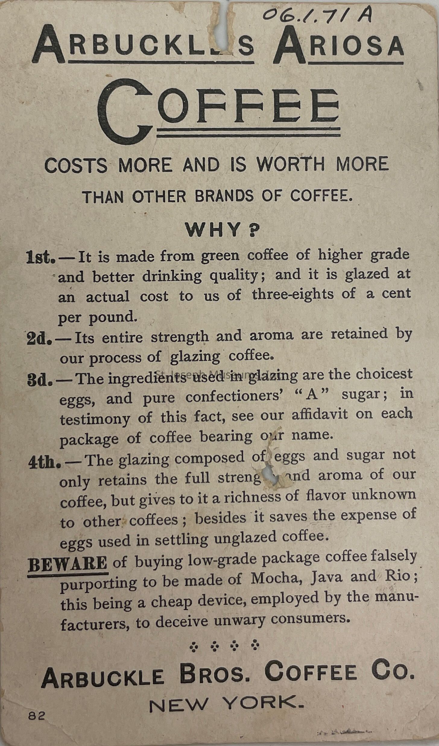Arbuckle Ariosa Coffee, Black Stereotype Illustration Trade Card, c. 1910Entry/Object ID