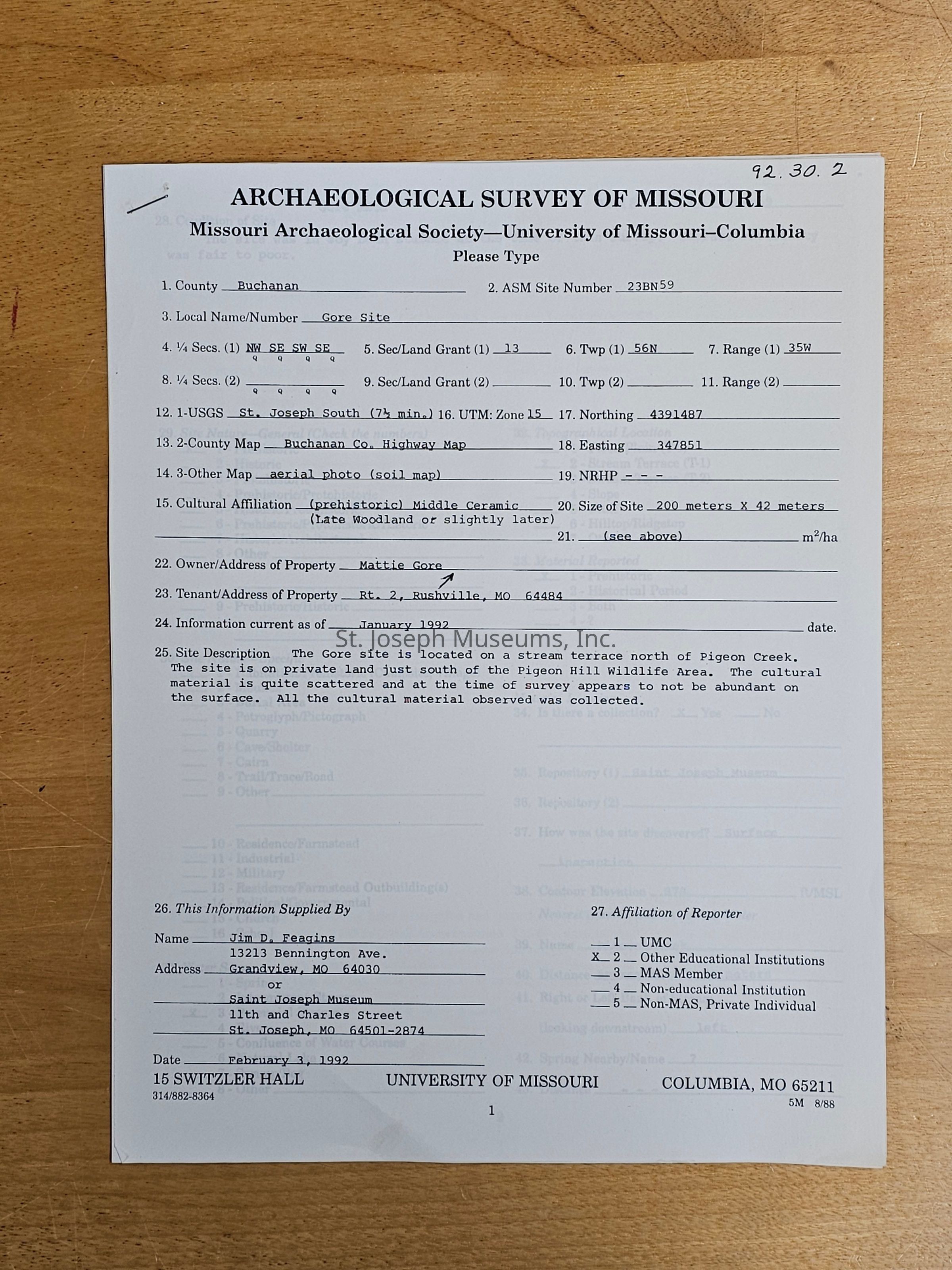 Copy of the archaeological survey form of 23BN59 (Gore Site)