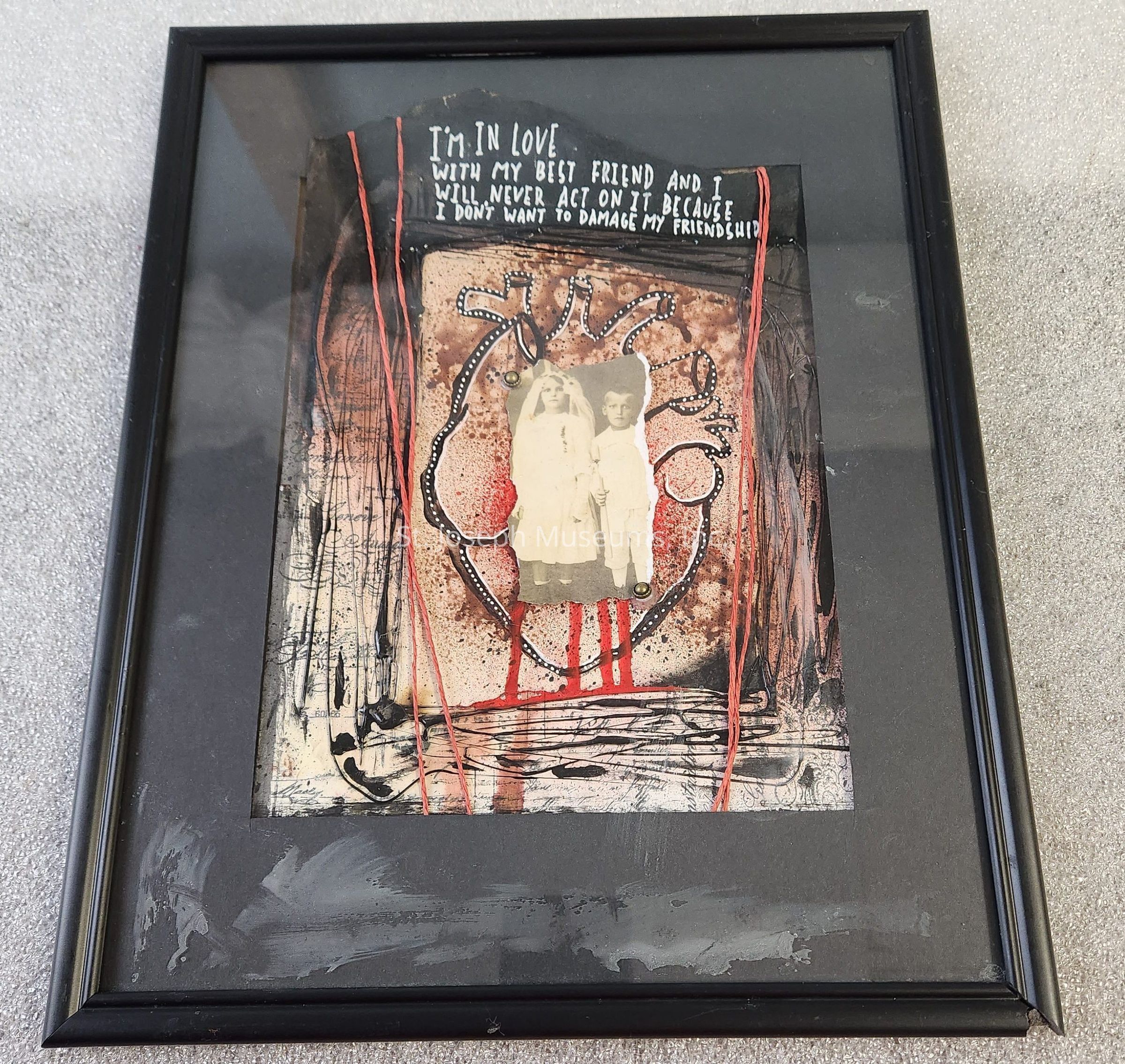 Art/framed image of two children over a heart/twine, paint and glue/ "I'm in love with my best friend and I will never act on it because I don't want to damage my friendship"/15"x12"x0.5"Collection