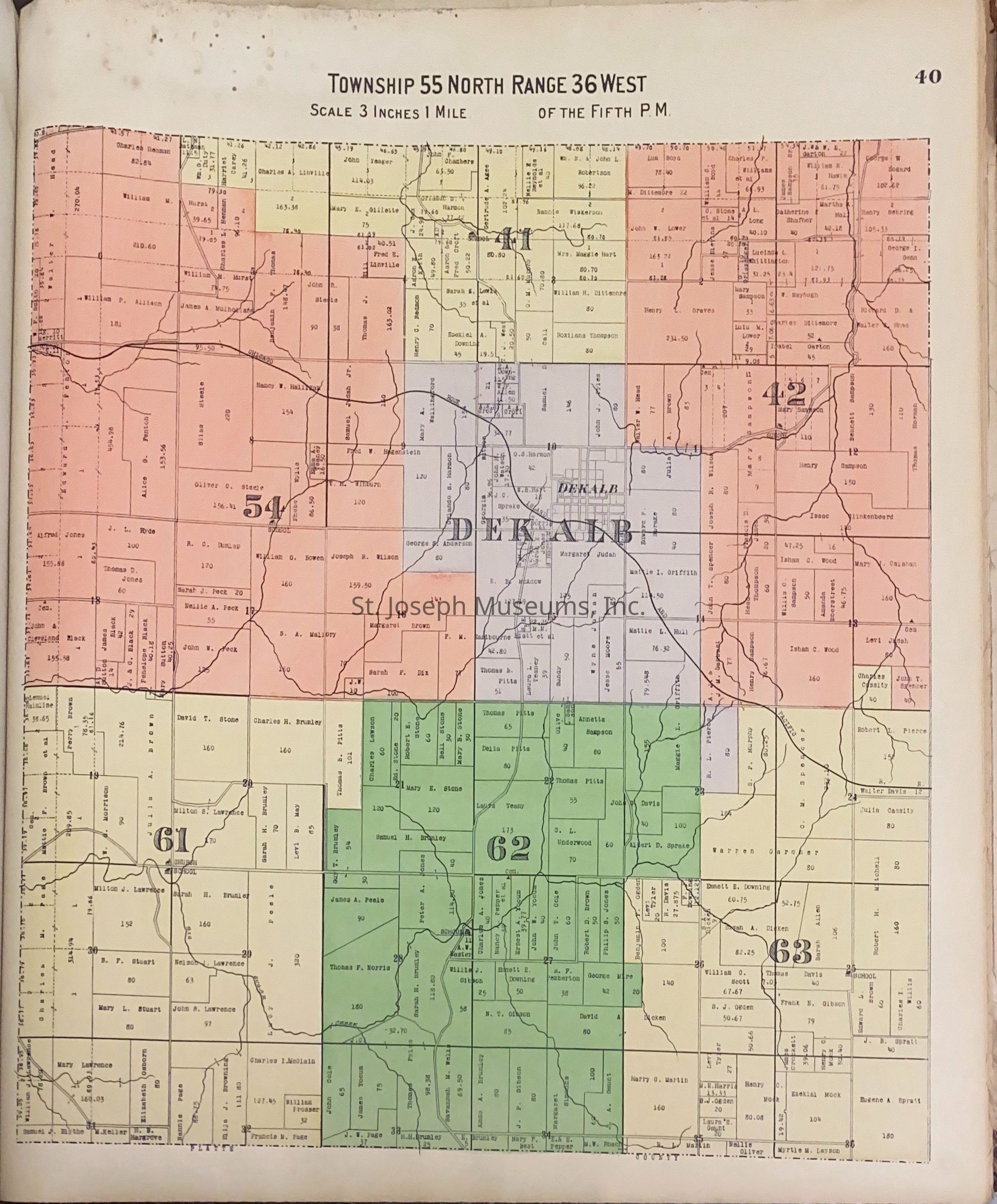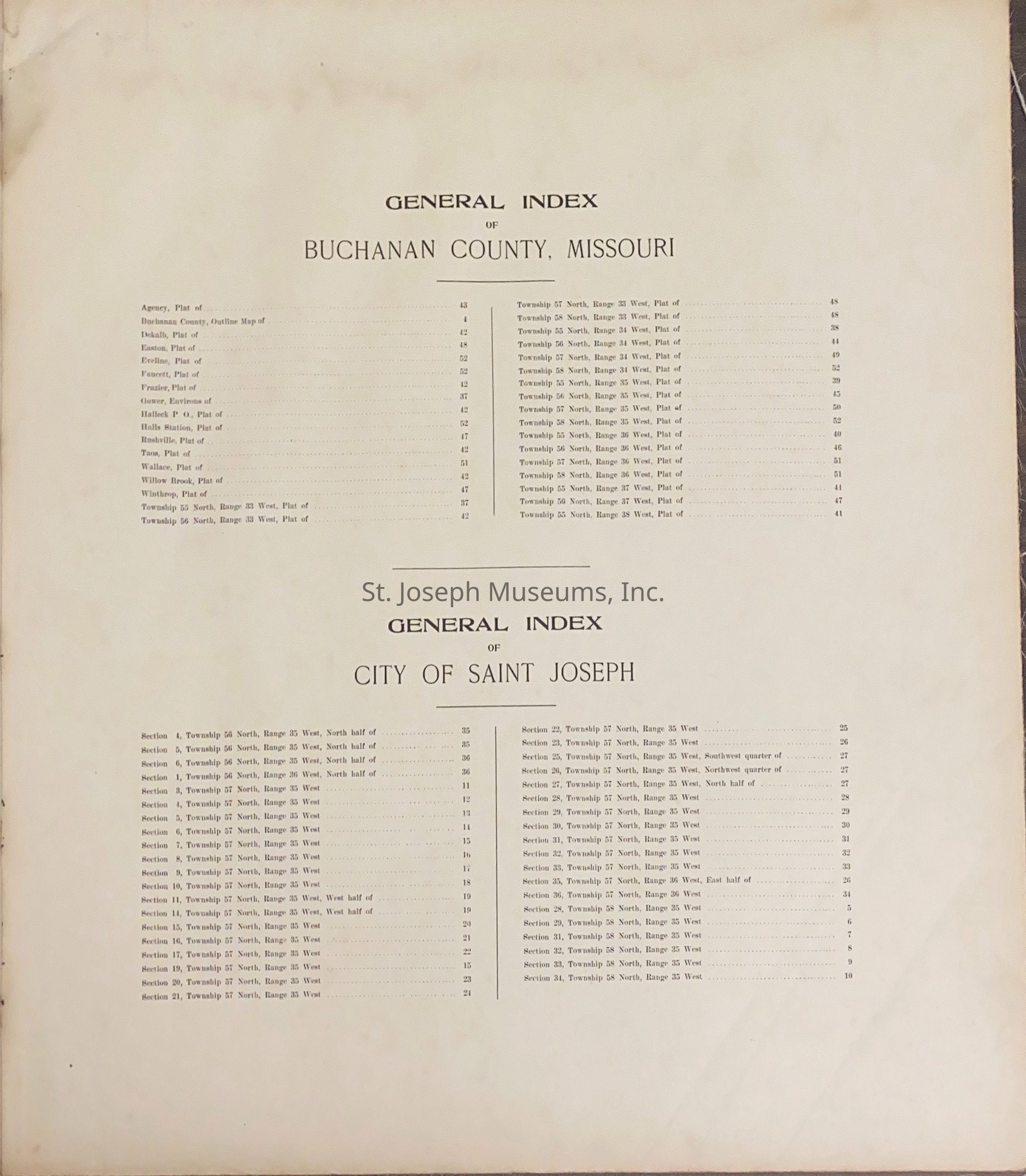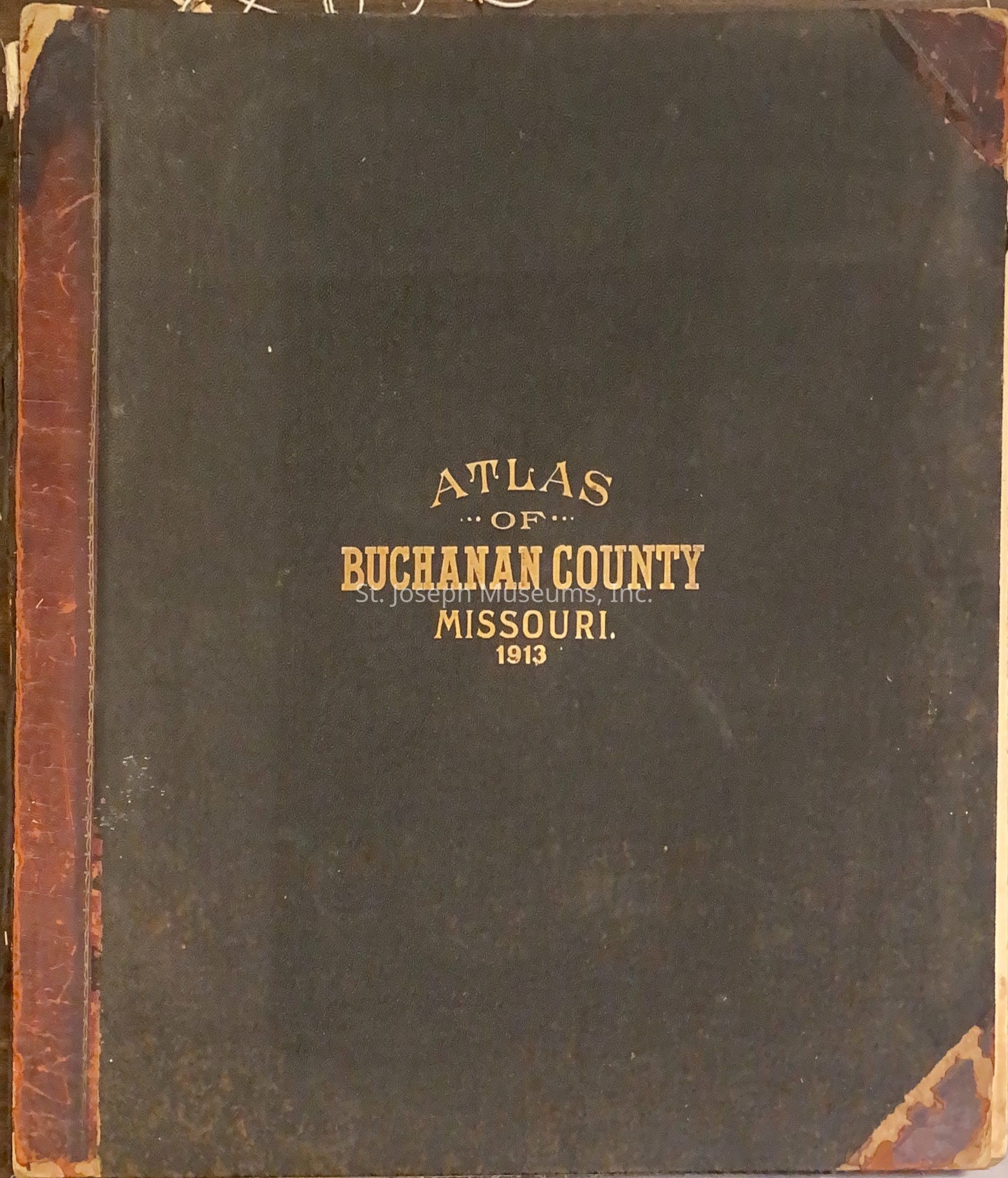 Atlas of Buchanan County, Missouri is an index of Buchanan County by township, section and range. Index of St. Joseph, Missouri by section, township and range and and index for additions and subdivisions of St. Joseph under the direction of Seitz-Peterman Engineering company. J.A. Duncan Jr. stamped on inside front cover. This was donated previously but no number assigned until 2005. 19 1/2 x 21 Poor condition - front and back cover are loose. 52/Hardbound/Maps.