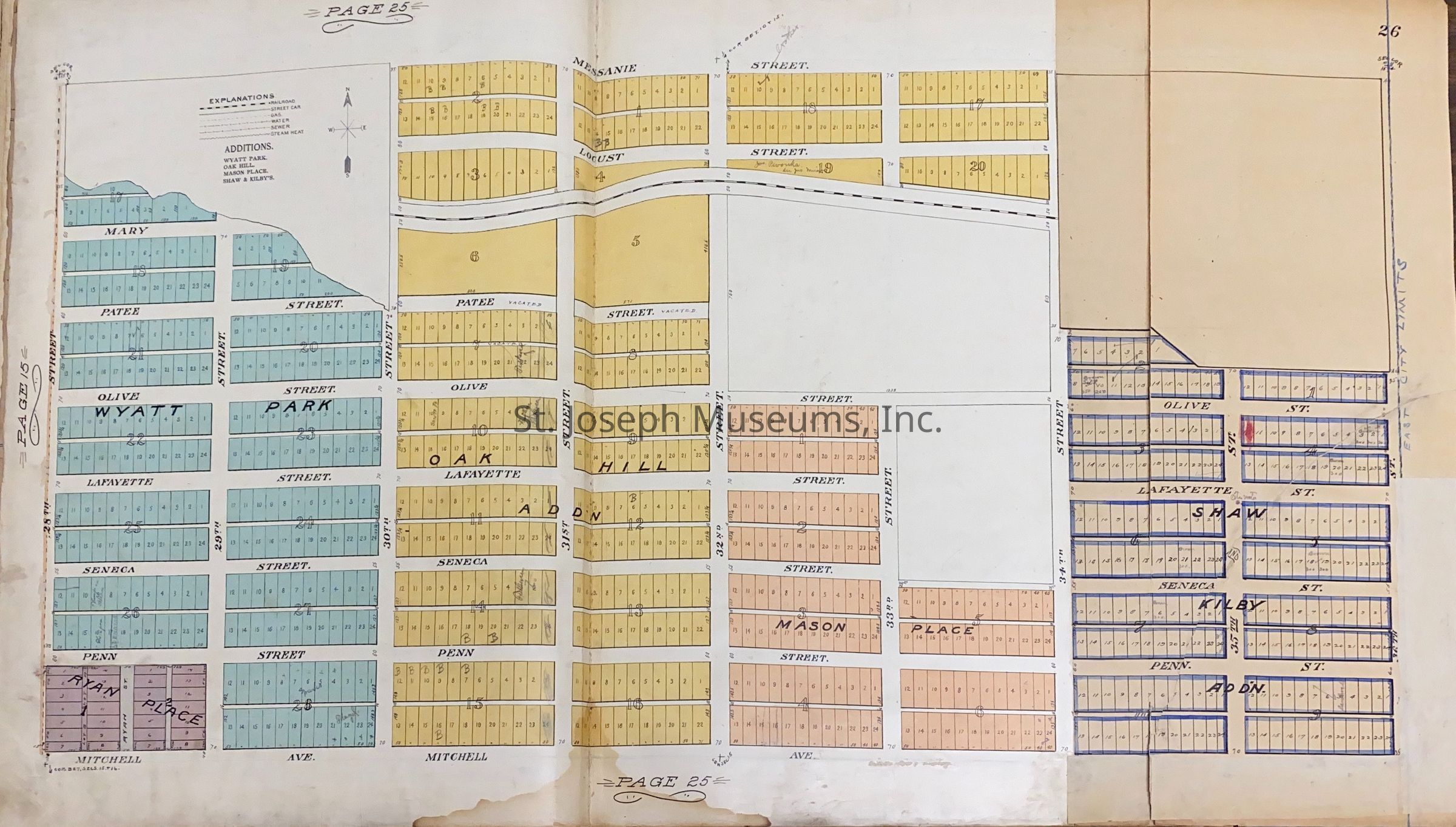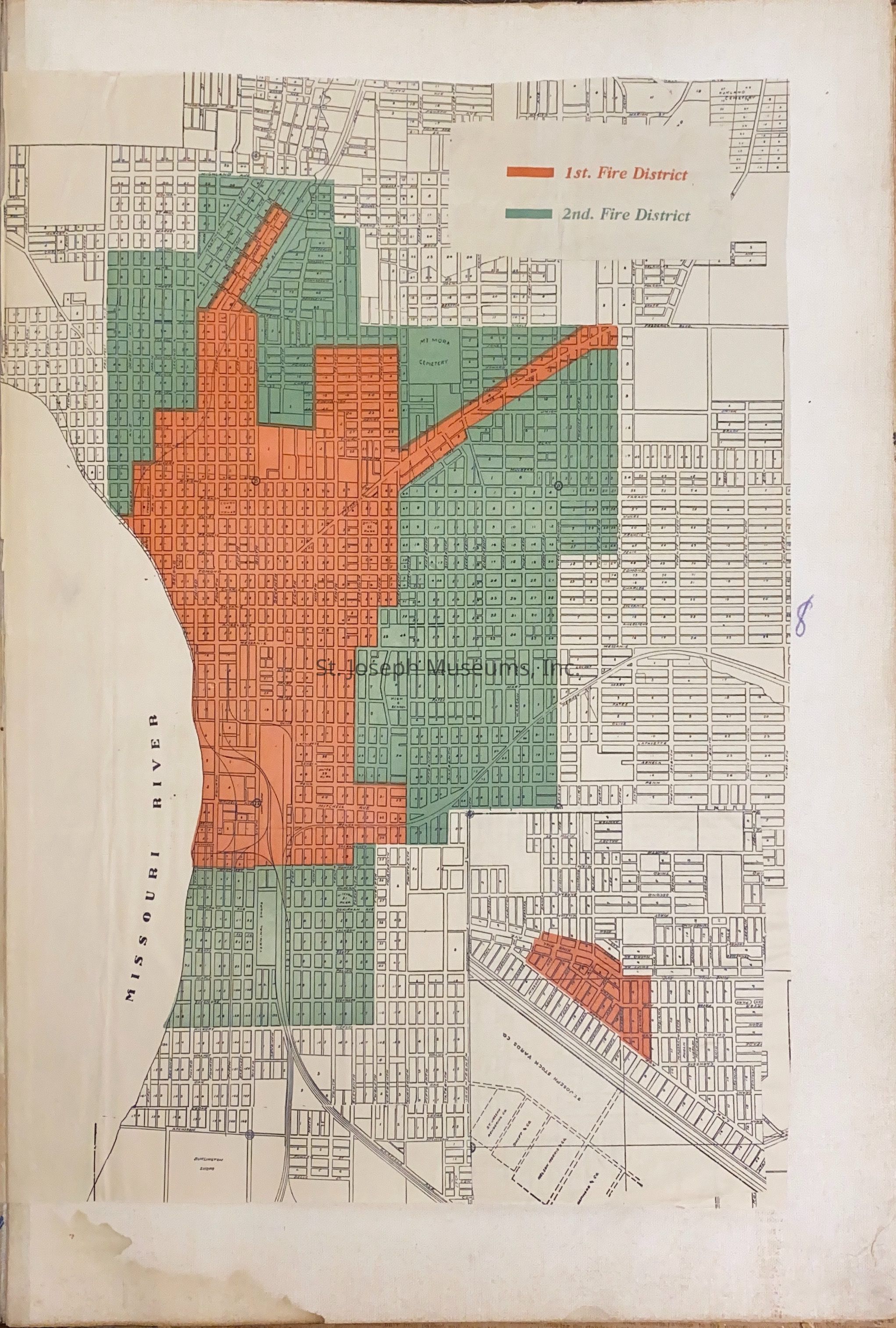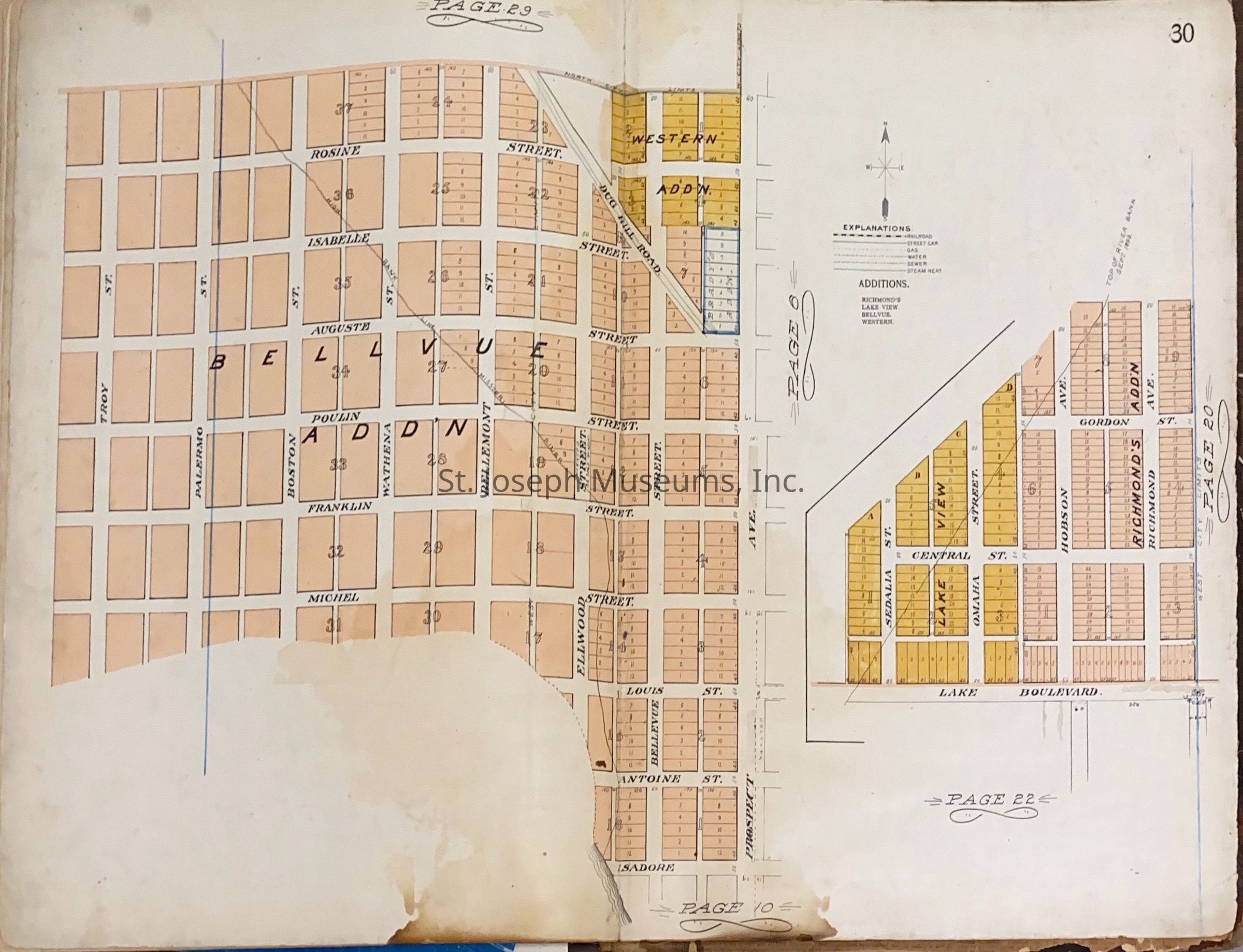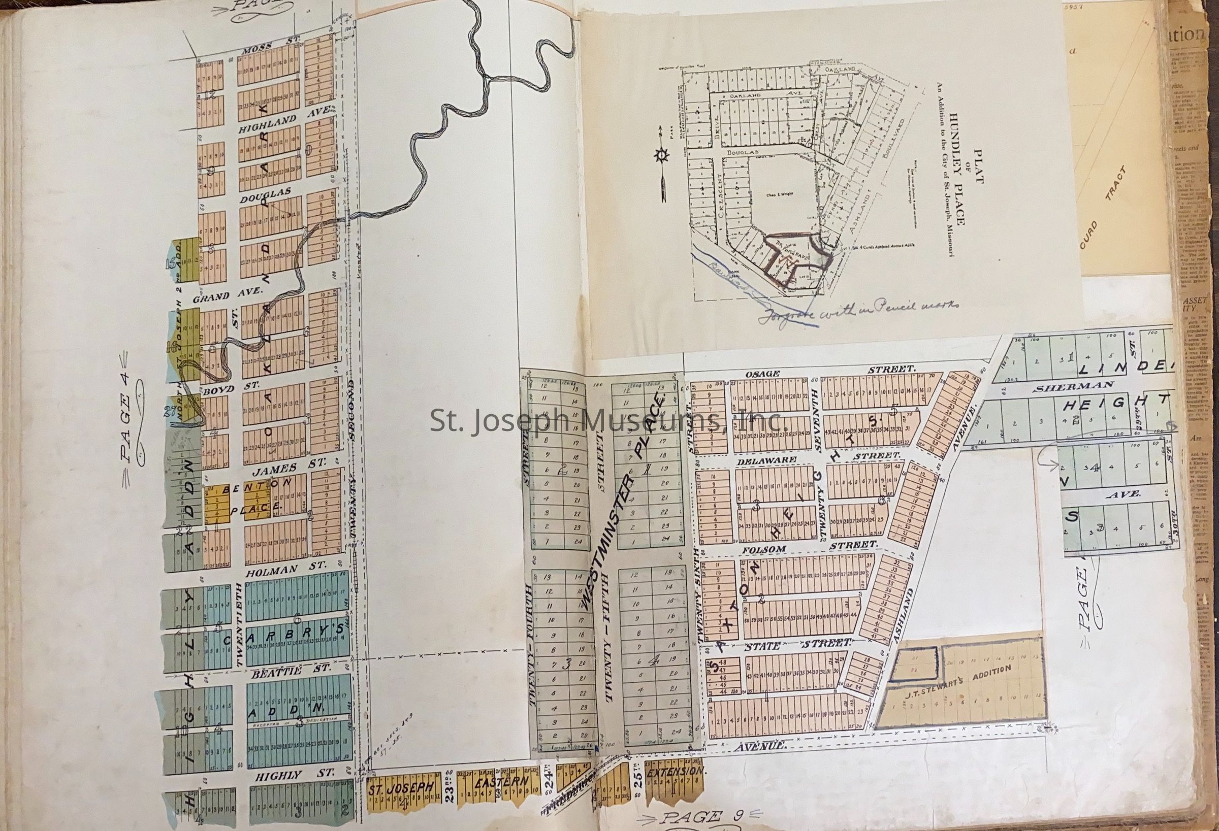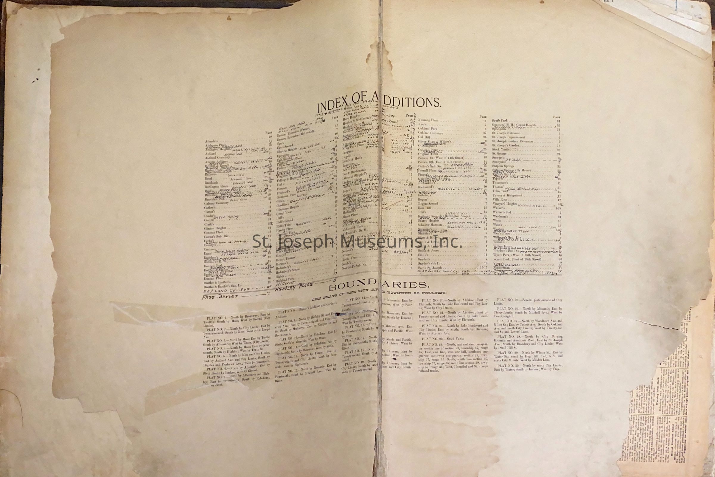 Atlas of the Cityof St. Joseph has index of additions and boundaries - Plat #1 thru Plat #30. Also in pages is a copy of Sept. 9, 1936 St. Joseph News-Press which shows voting precinct maps and a copy August 14, 1927St. Joseph Gazette of architects drawing of Country Club Place. Book has pages on additions to the city up to approximately 1920.