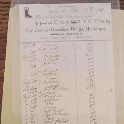 Auxier, Calista Bill From E. M. Yates And Co.,Dry Goods, Groceries, Drugs, Medicines, 1877