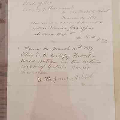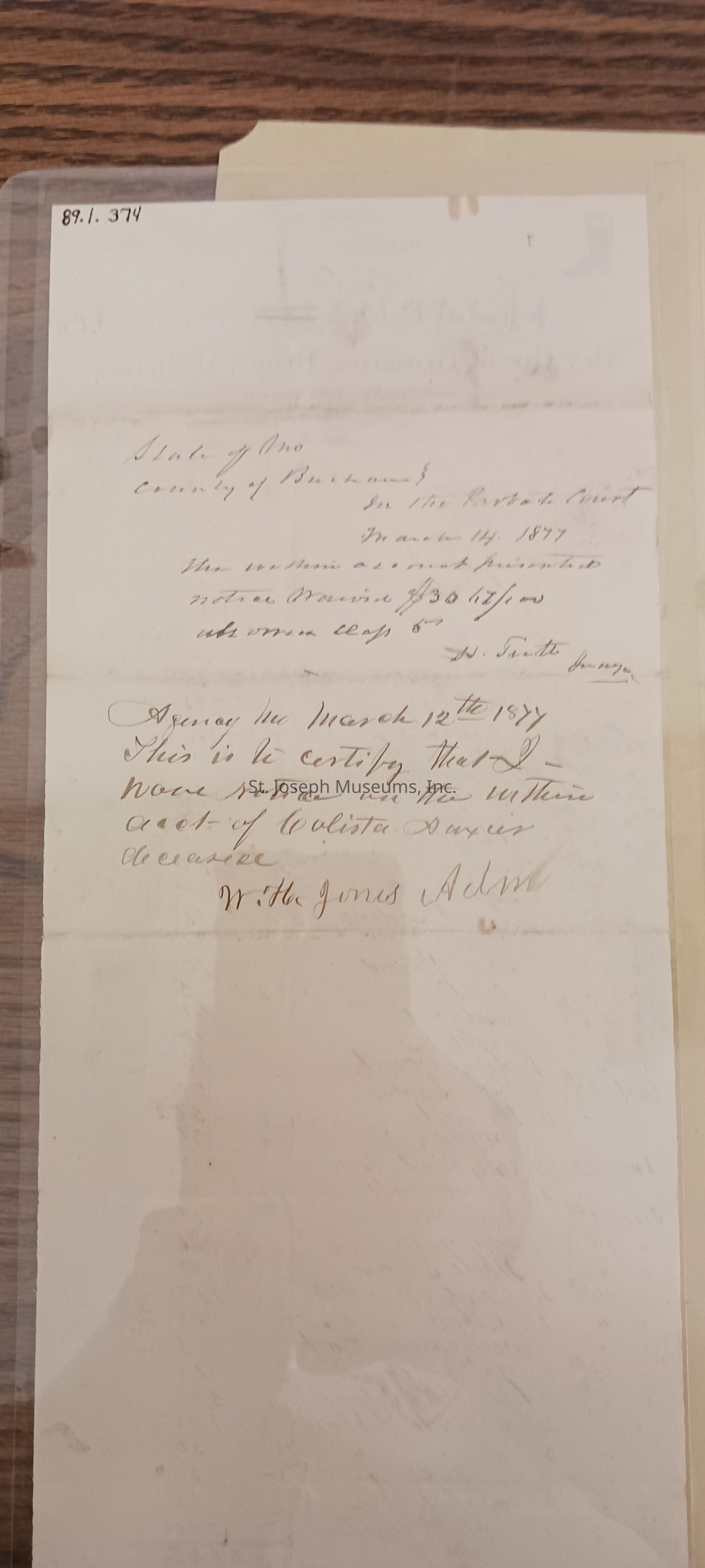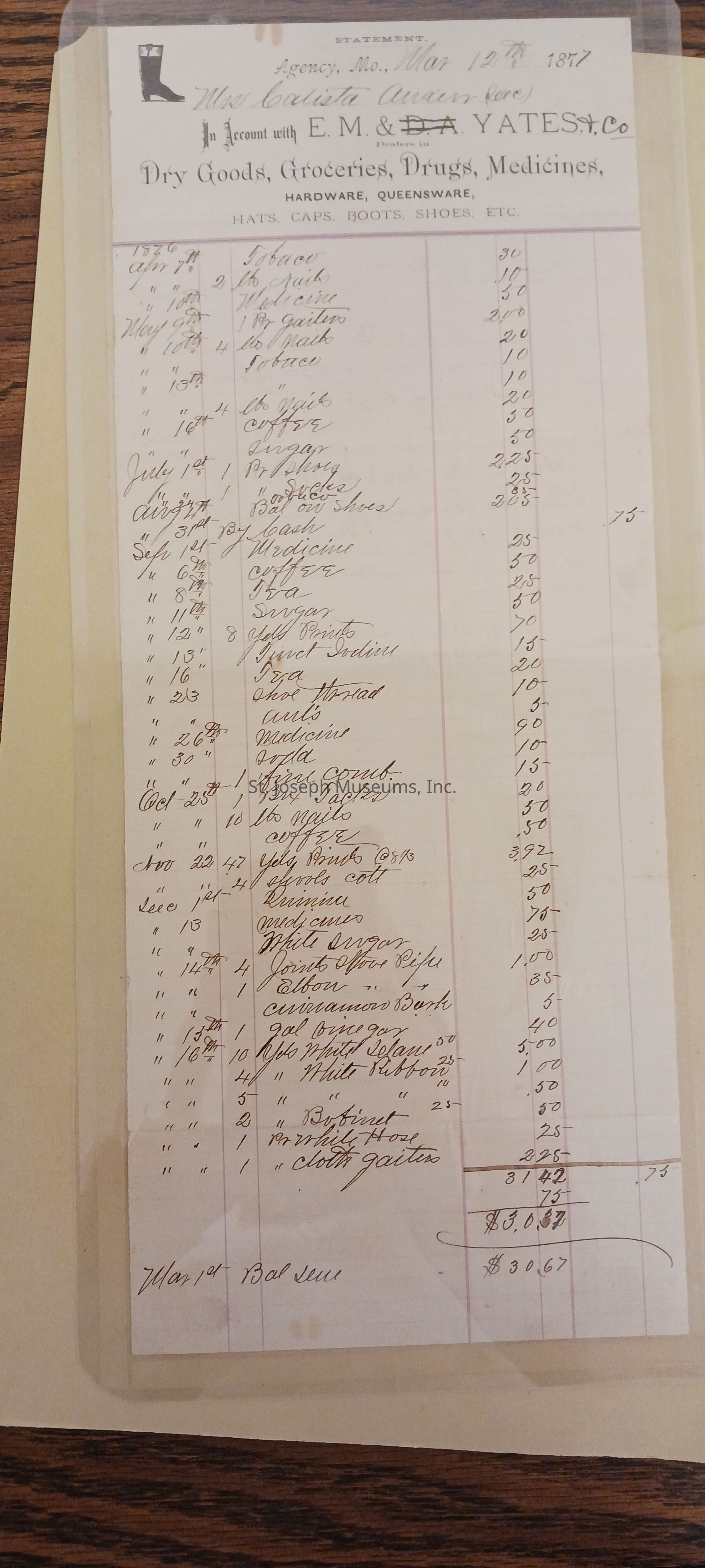 Auxier, Calista Bill from E. M. Yates and Co., Dry Goods, Groceries, Drugs, Medicines, 1877. The business is located at Agency, Missouri. The amount was $30.67 for various goods due March 1. In Probate Court March 14, 1877, the within account presented notice waiver. Signed by H. Tutt, Judge. Agency Mo. March 12, 1877. This is to certify that I have notice on the within account of Calista, Auxier, deceased. Signed W. Jones Administrator. Dated March 12, 1877.