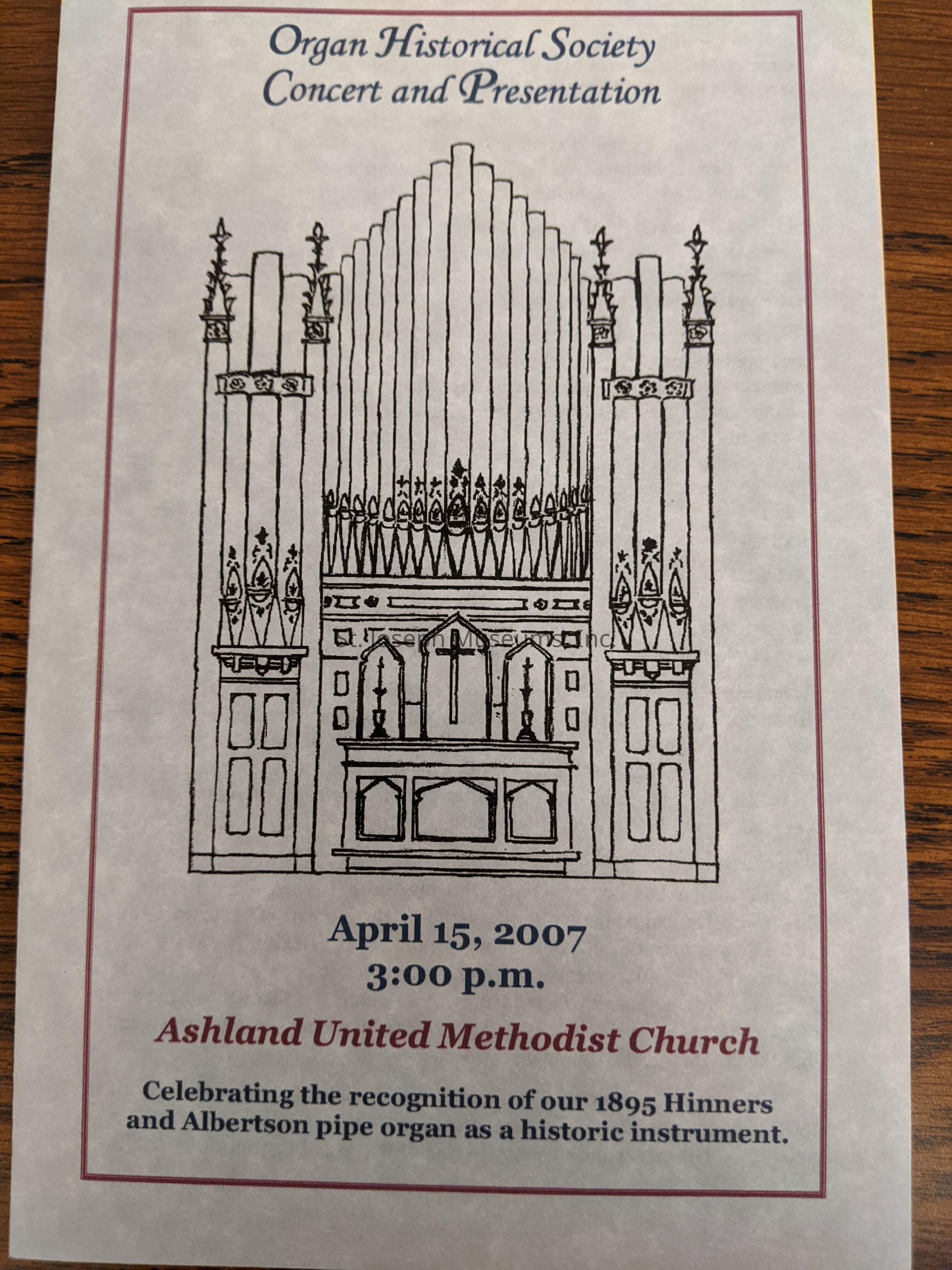 A pamphlet containing information on a concert and presentation for the Organ Historical Society hosted by Ashland United Methodist Church in honor of their organ being labeled a historic instrument.