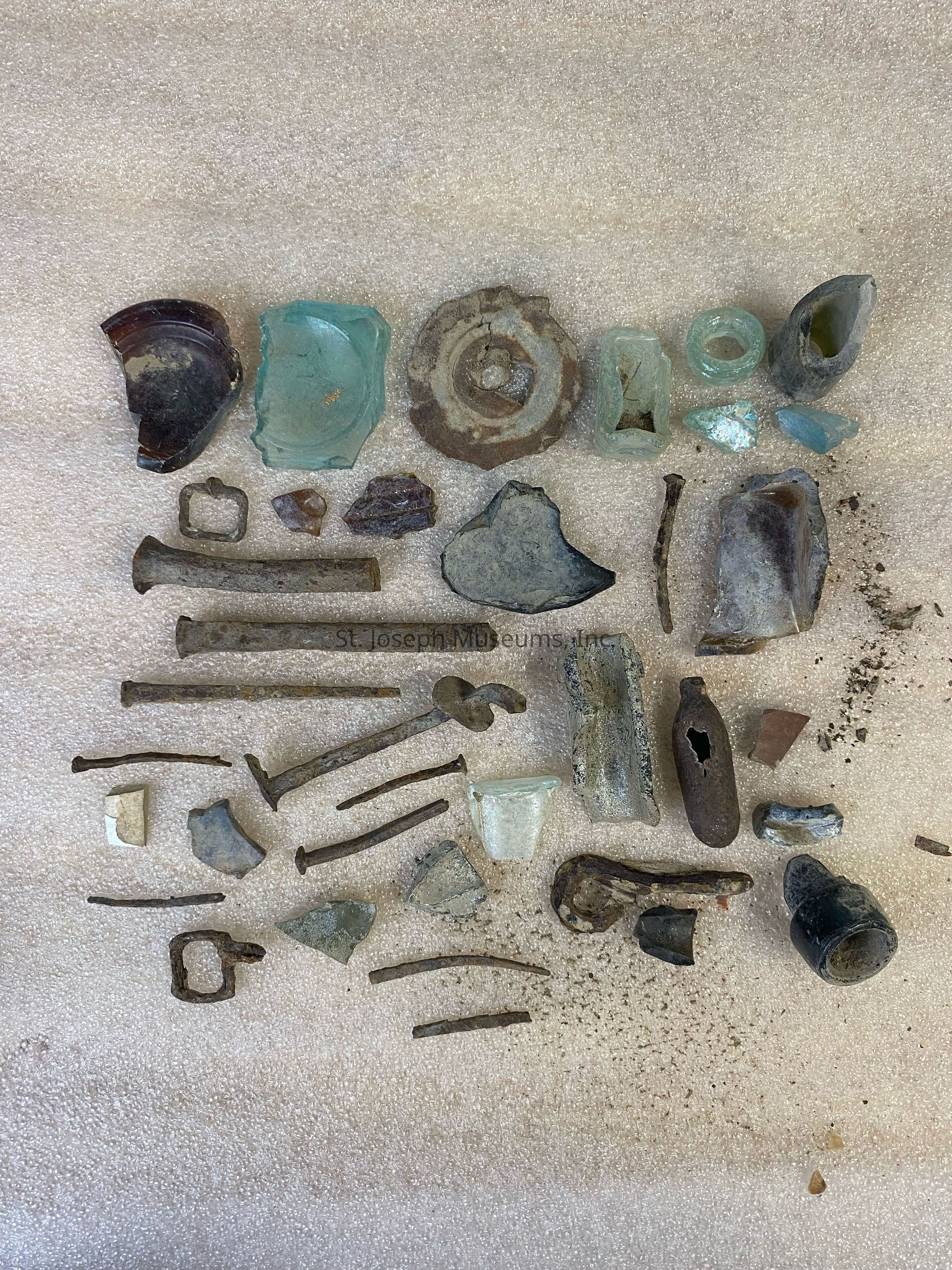 Artifacts/collection/metal, glass/screws, nails, hardware, buckle, part of a can, and pieces from a green glass bottleCollection
