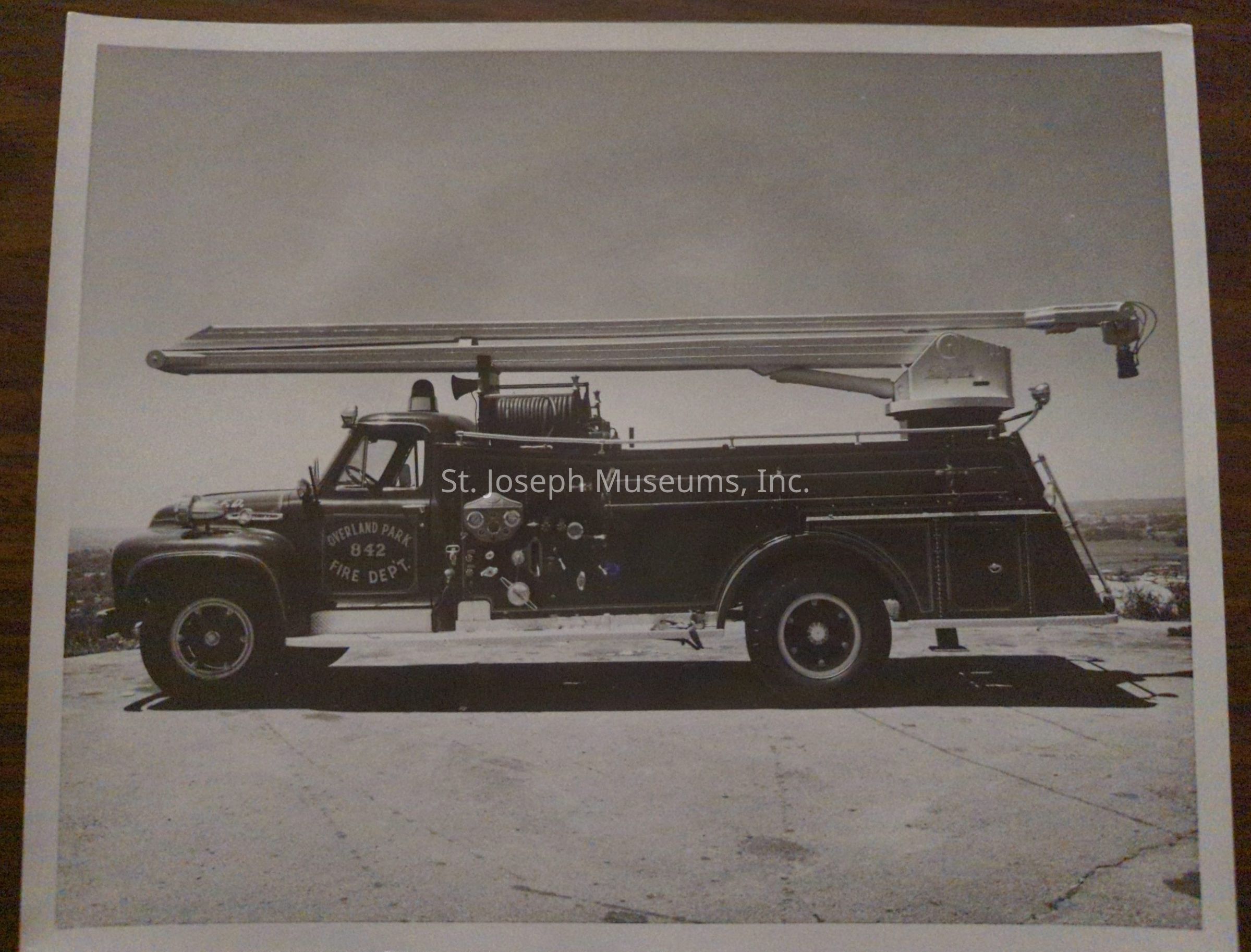 Black-and-white photograph depicting fire truck 842 from the Overland Park Fire Department.