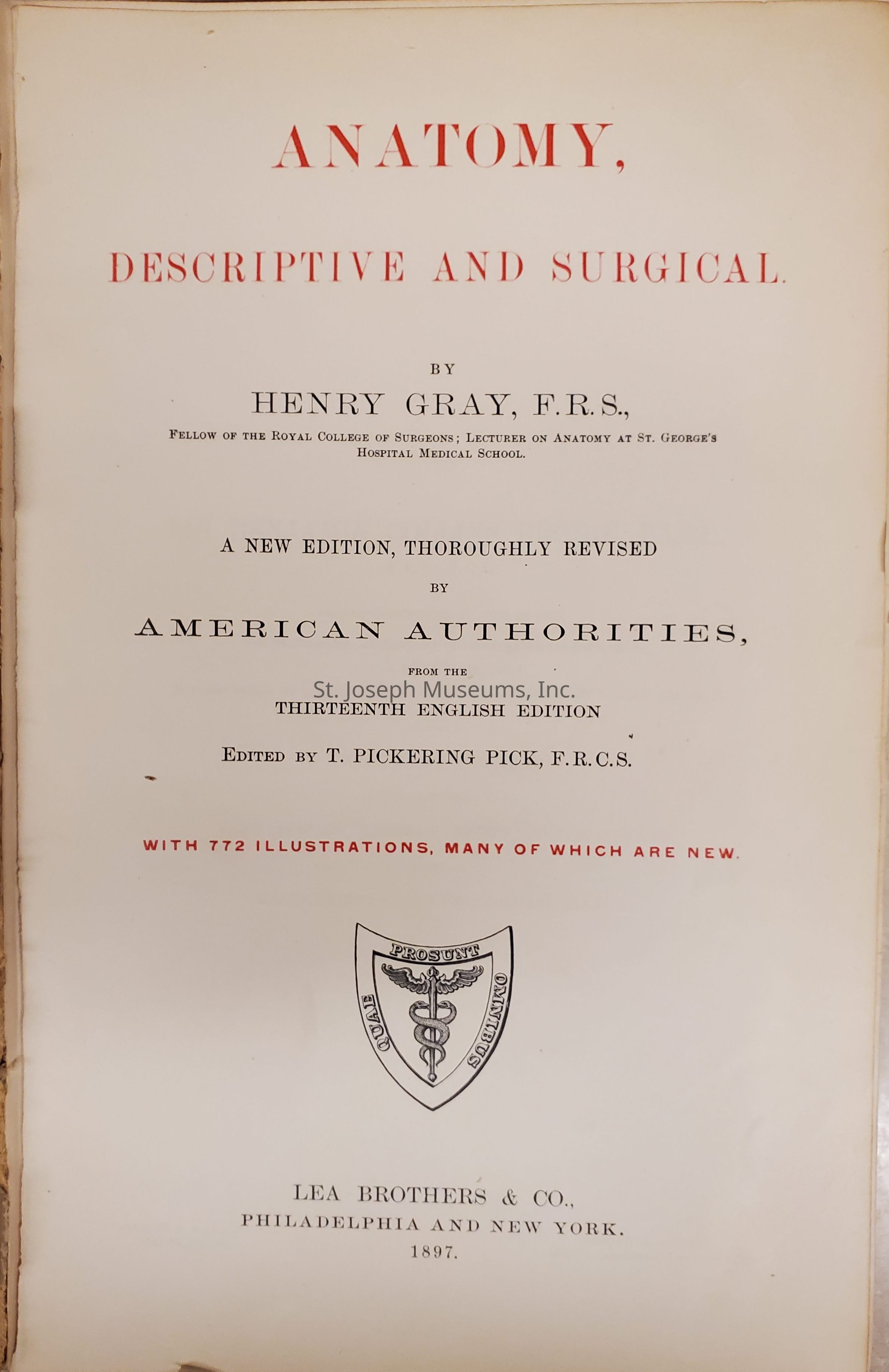 Anatomy, Descriptive and Surgical is by Henry Gray, F. R. S. (Gray's Anatomy) is a text book. This is a a New Edition, Thoroughly Revised by American Authorities, from the thirteenth English Edition. Edited by T. Pickering Pick, F.R. C. S. with 772 illustrations, many of which are new. Copyright 1897.