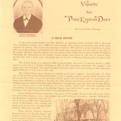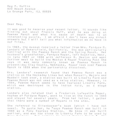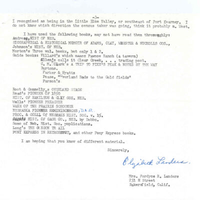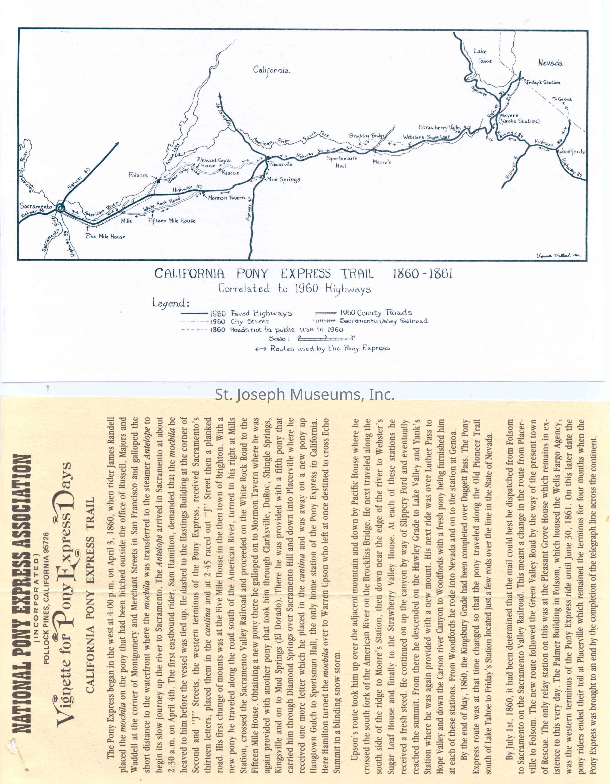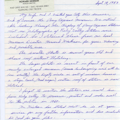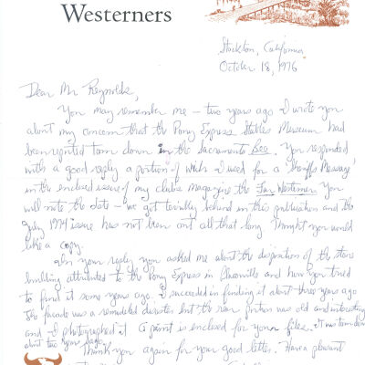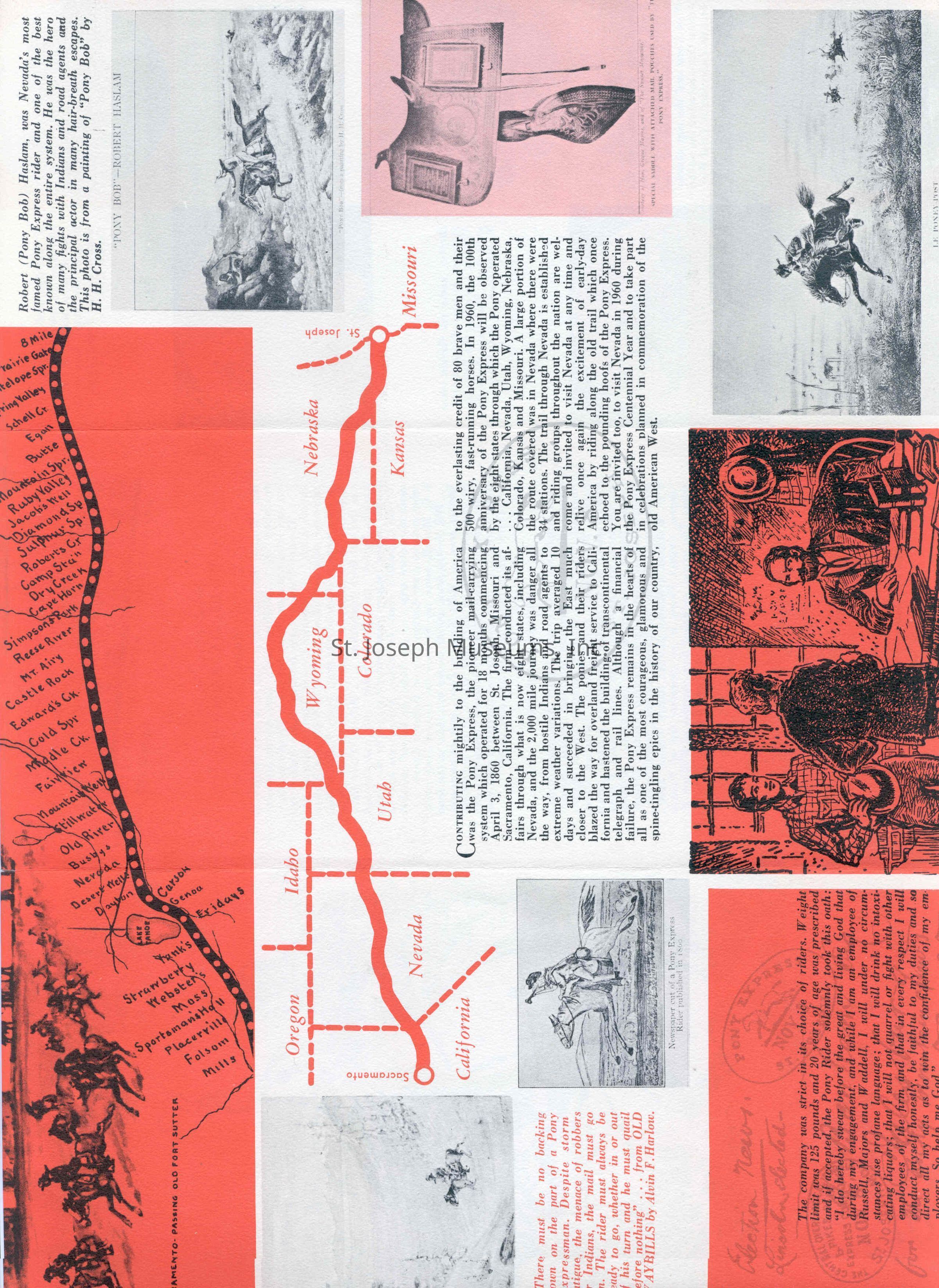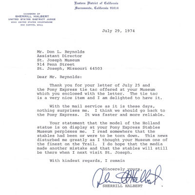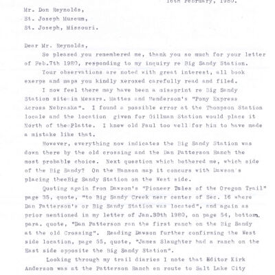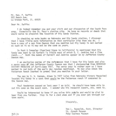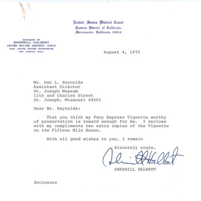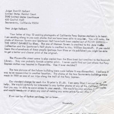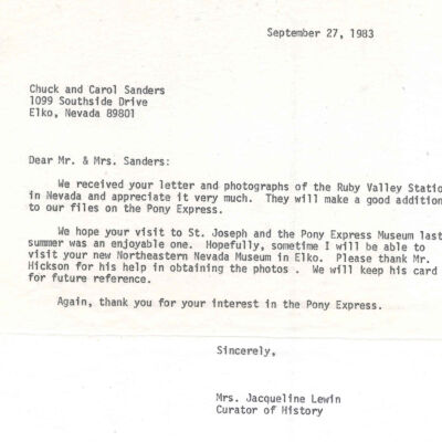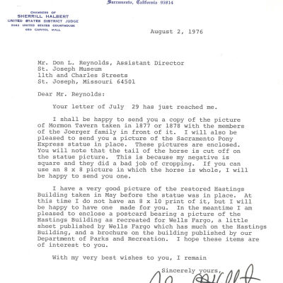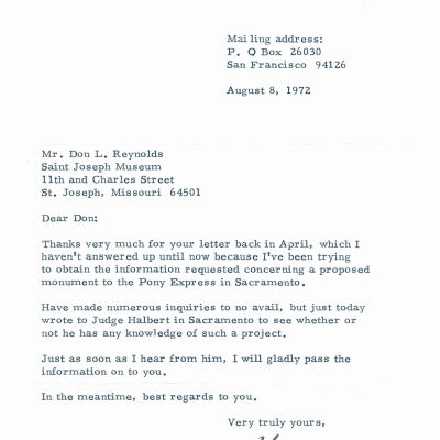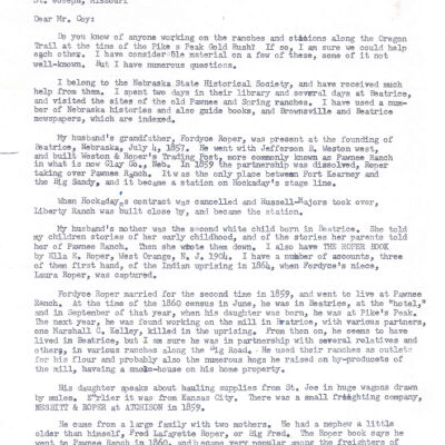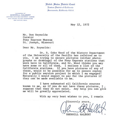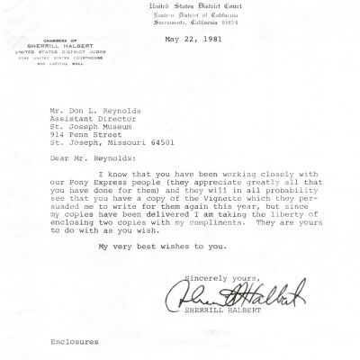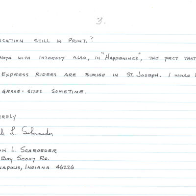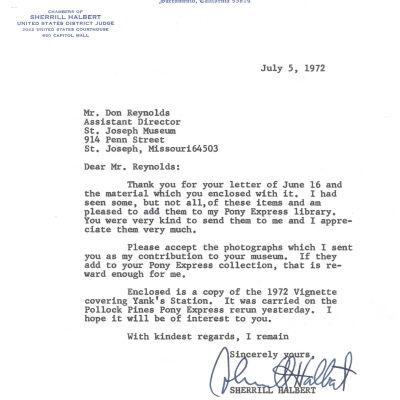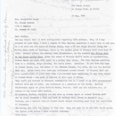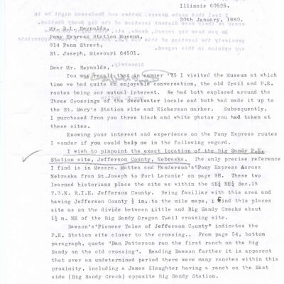 Files contain correspondence with Pony Rider descendants, Pony Express rider biographies, newspaper clippings related to the Pony Express, and miscellaneous records, photos, and documents collected from major private and University libraries among other sources. NOTE ABOUT ORIGIN OF LIBRARIES FILE. Prior to the opening of the renovated Pony Express Museum in 1993, St. Joseph Museum staff did extensive research on the Pony Express. All of the libraries in this folder were visited and copies of all material related to the Pony Express were made. This was done from 1991 to 1993. Information from this research was used in the new exhibits of the Pony Express Museum and in preparation of the book On the Winds of Destiny. In 2015, the file from the Pony Express Museum was added. Jackie Lewin 7/27/15 CD containing scans of actual documents found in Pony Express Research Files located in file cabinets in Document Storage II area.