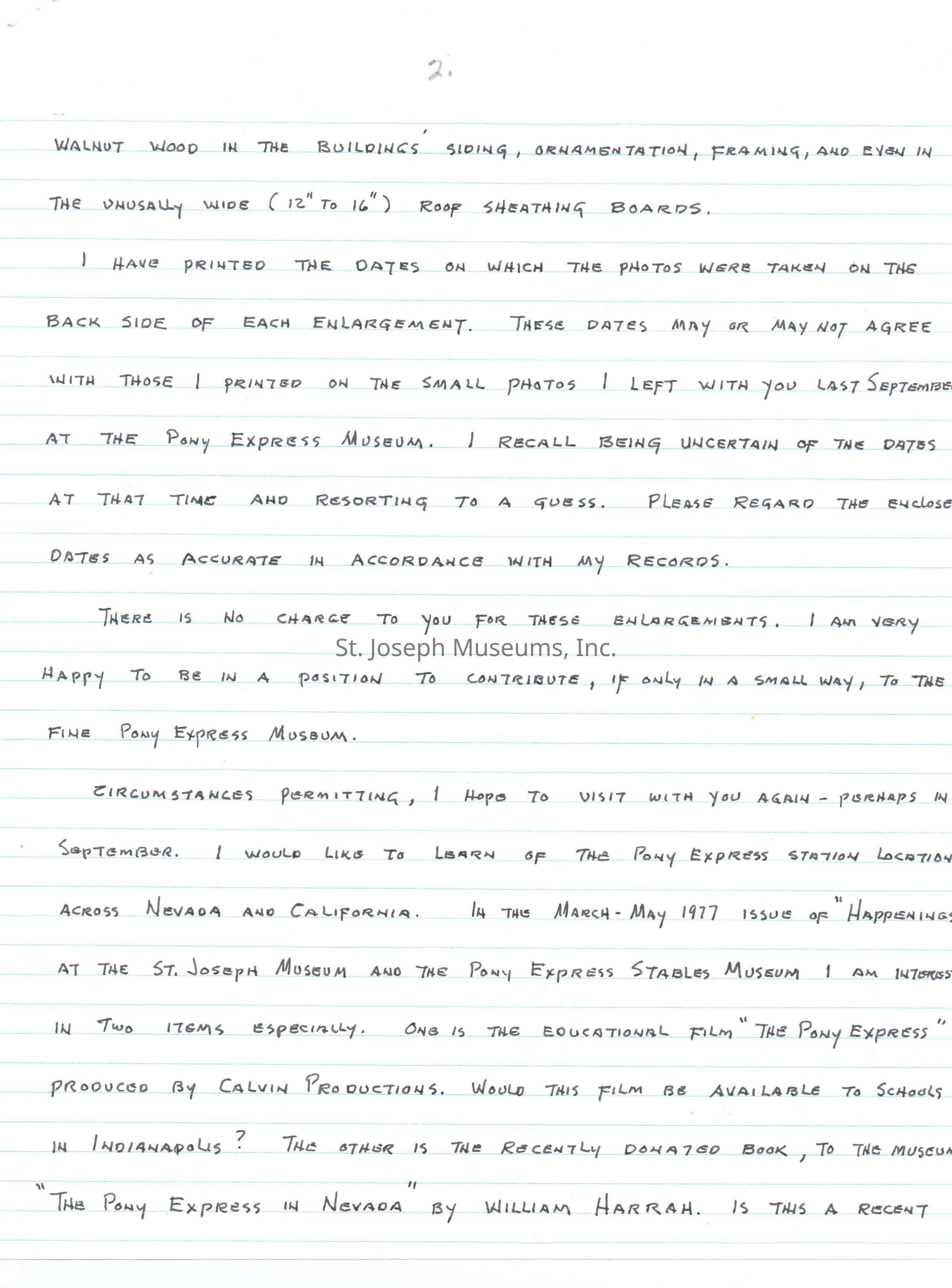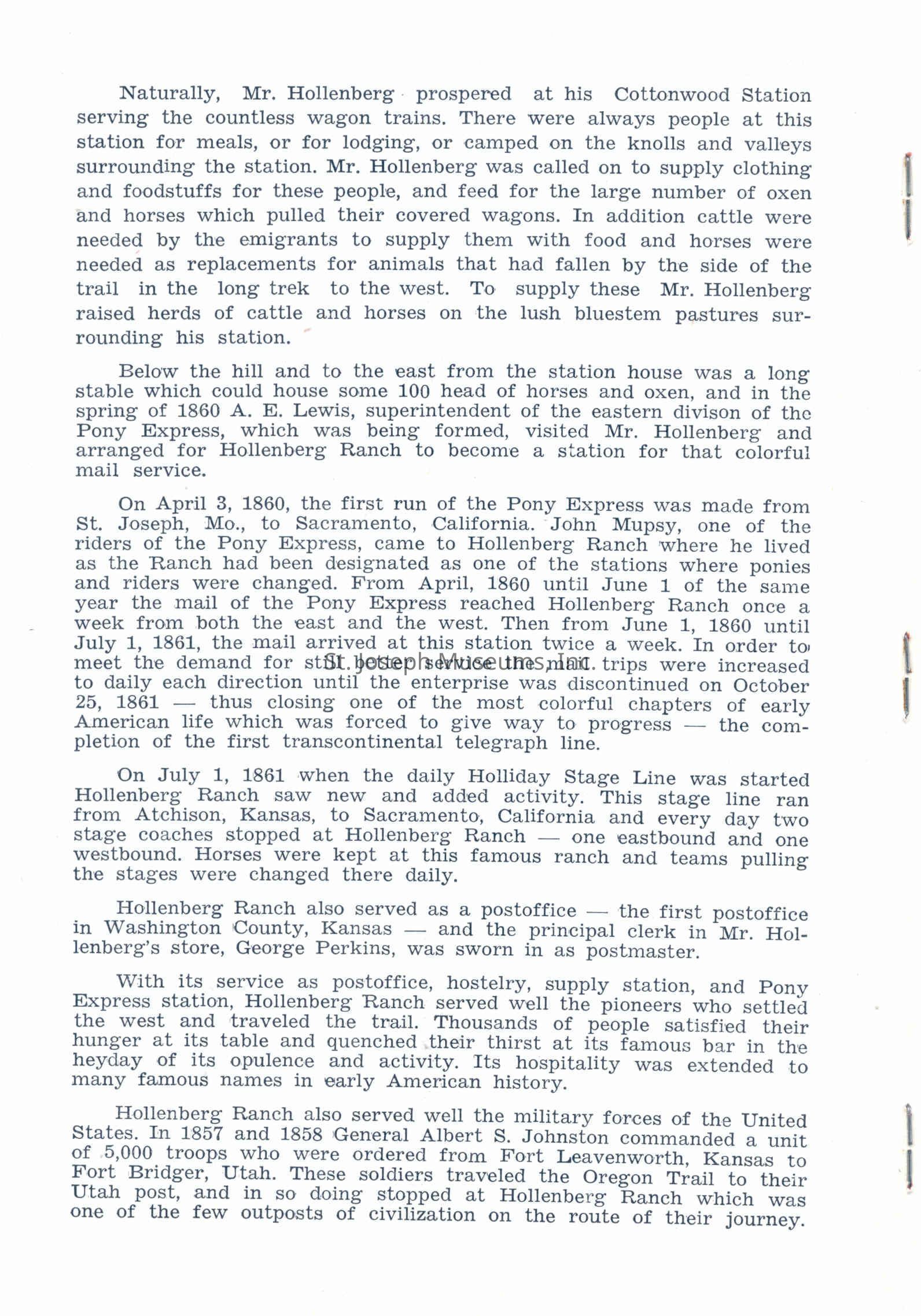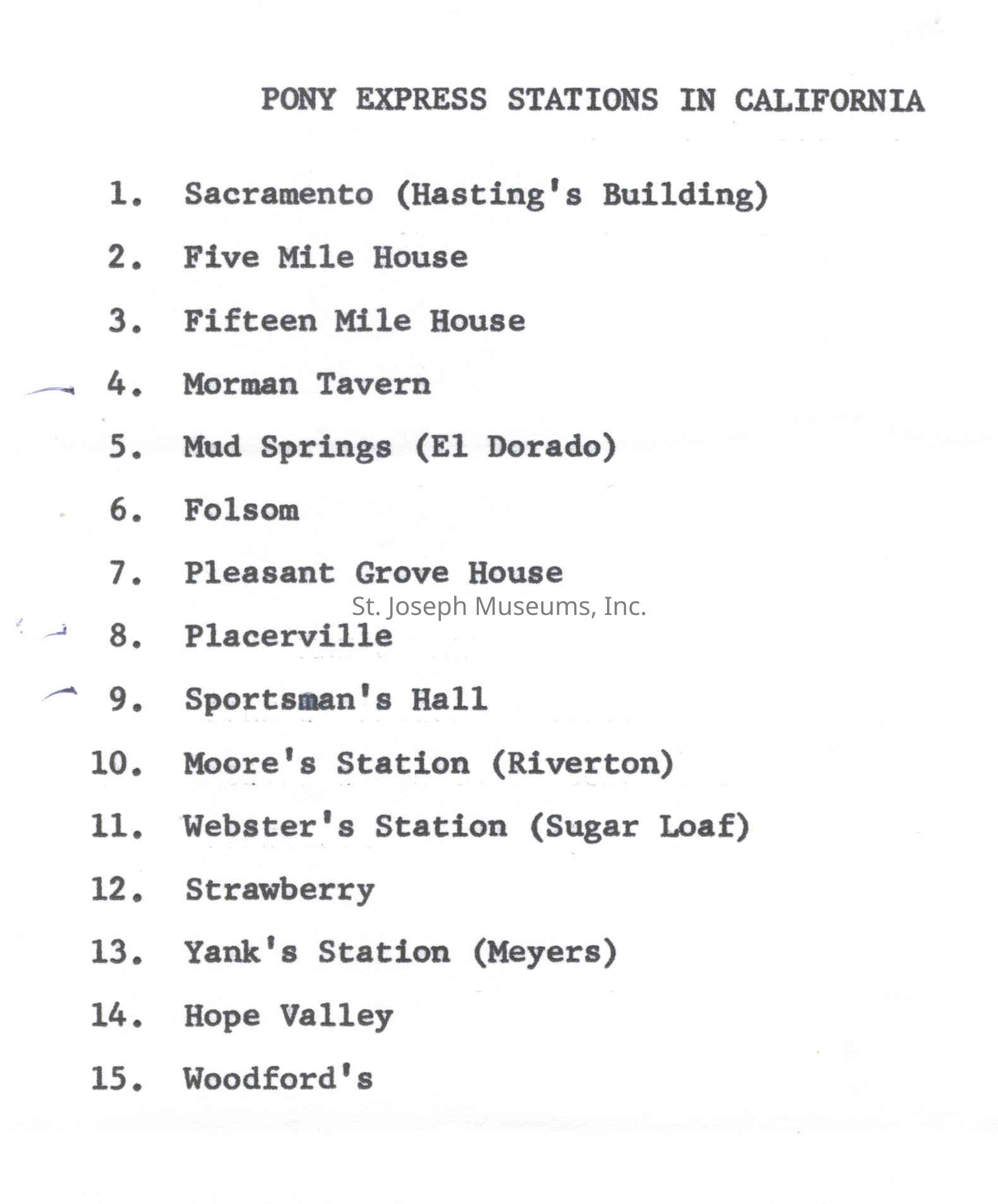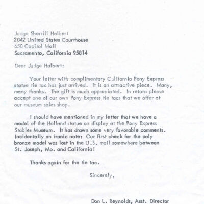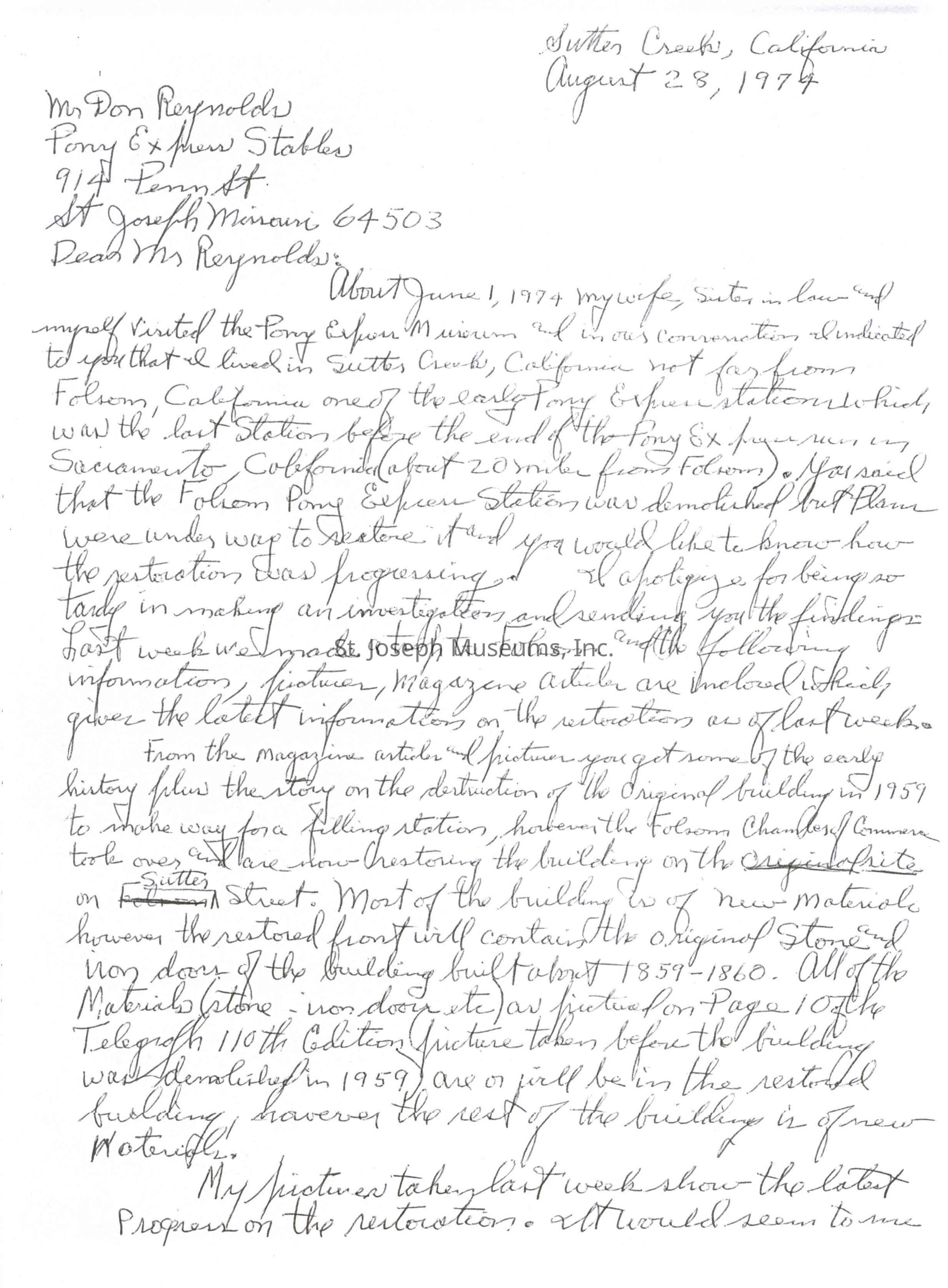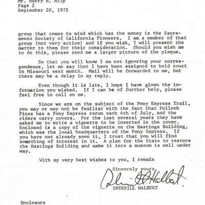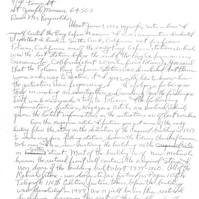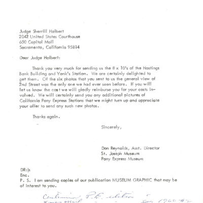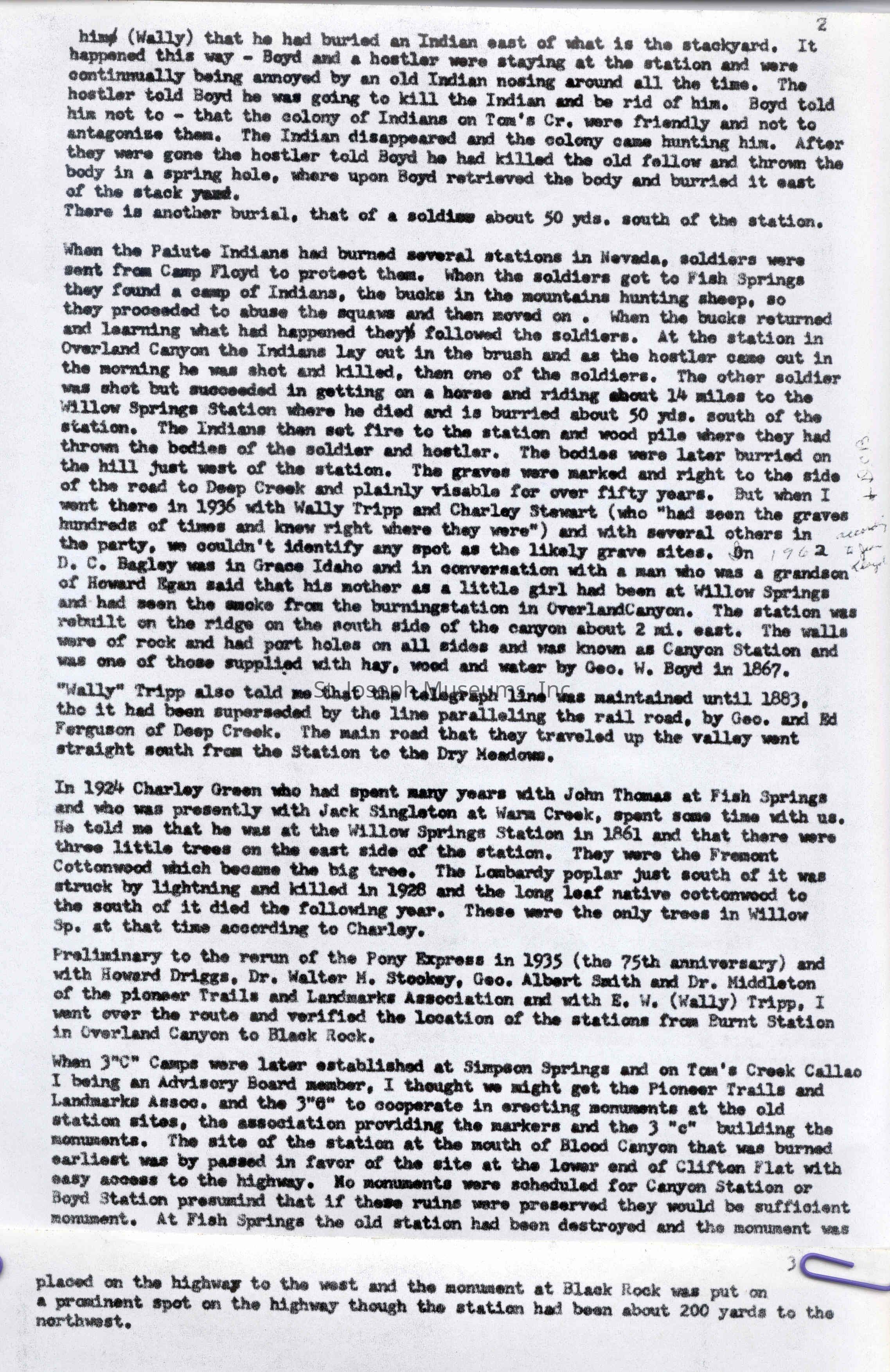 Files contain correspondence with Pony Rider descendants, Pony Express rider biographies, newspaper clippings related to the Pony Express, and miscellaneous records, photos, and documents collected from major private and University libraries among other sources. NOTE ABOUT ORIGIN OF LIBRARIES FILE. Prior to the opening of the renovated Pony Express Museum in 1993, St. Joseph Museum staff did extensive research on the Pony Express. All of the libraries in this folder were visited and copies of all material related to the Pony Express were made. This was done from 1991 to 1993. Information from this research was used in the new exhibits of the Pony Express Museum and in preparation of the book On the Winds of Destiny. In 2015, the file from the Pony Express Museum was added. Jackie Lewin 7/27/15 CD containing scans of actual documents found in Pony Express Research Files located in file cabinets in Document Storage II area.