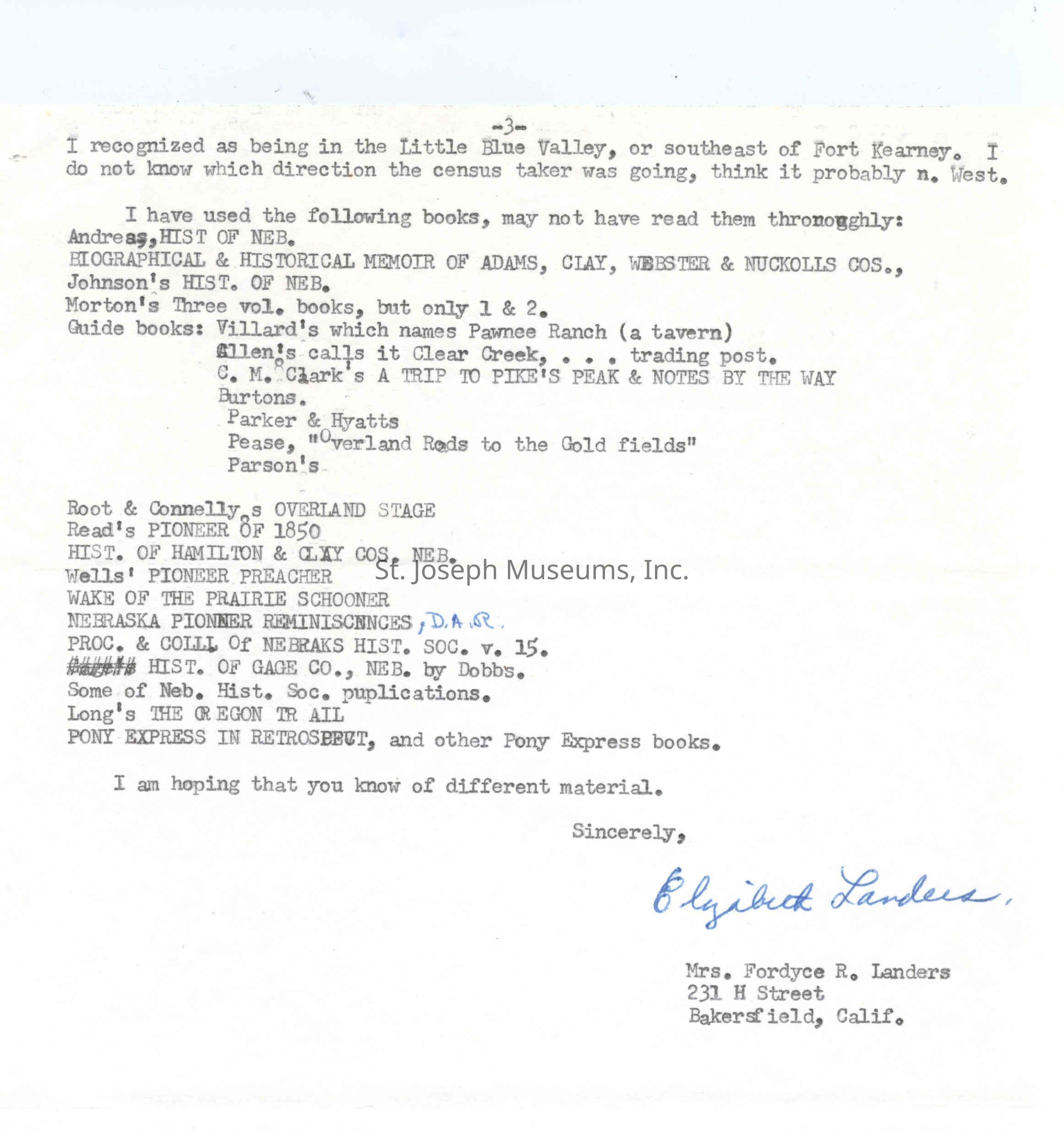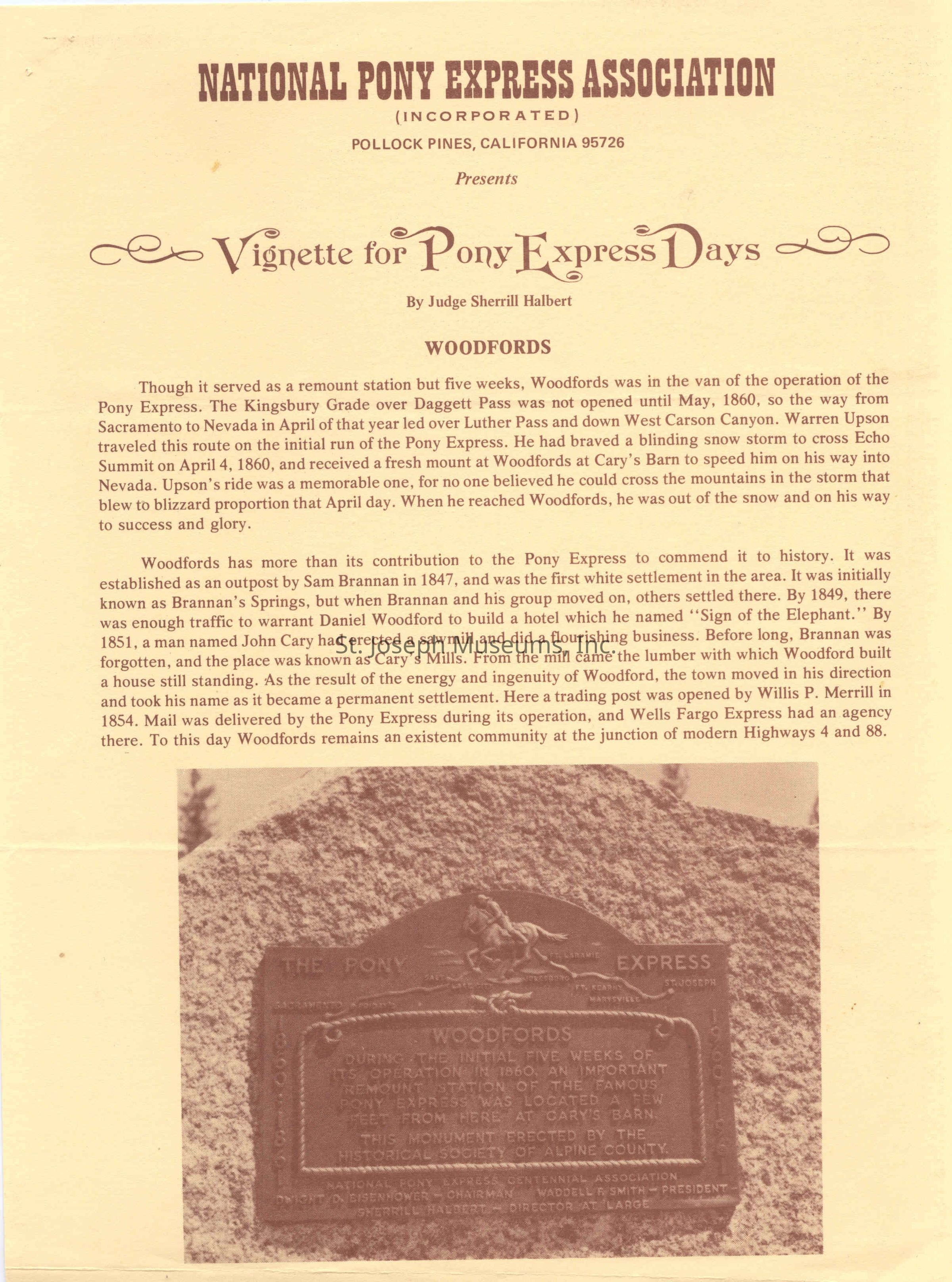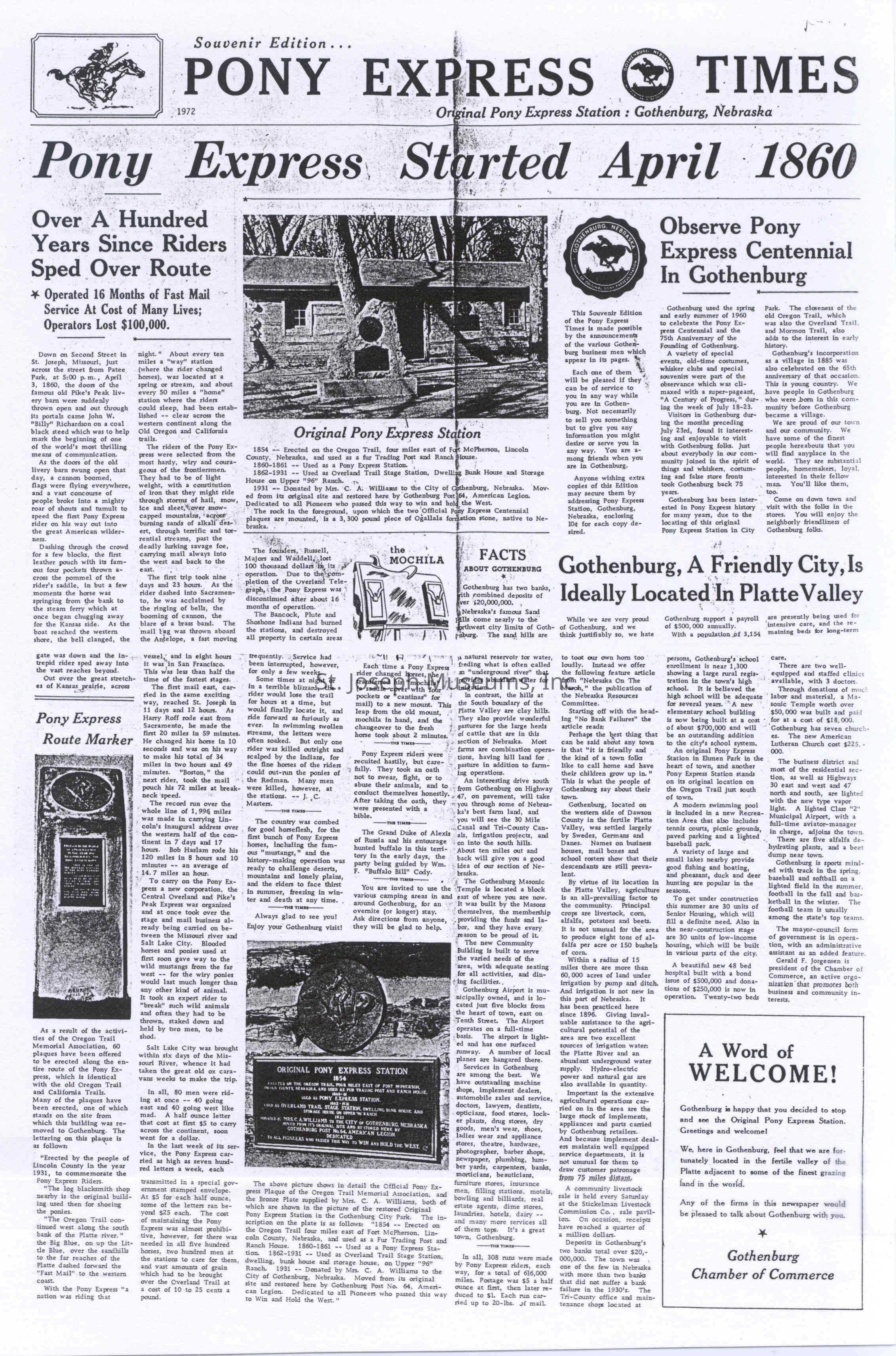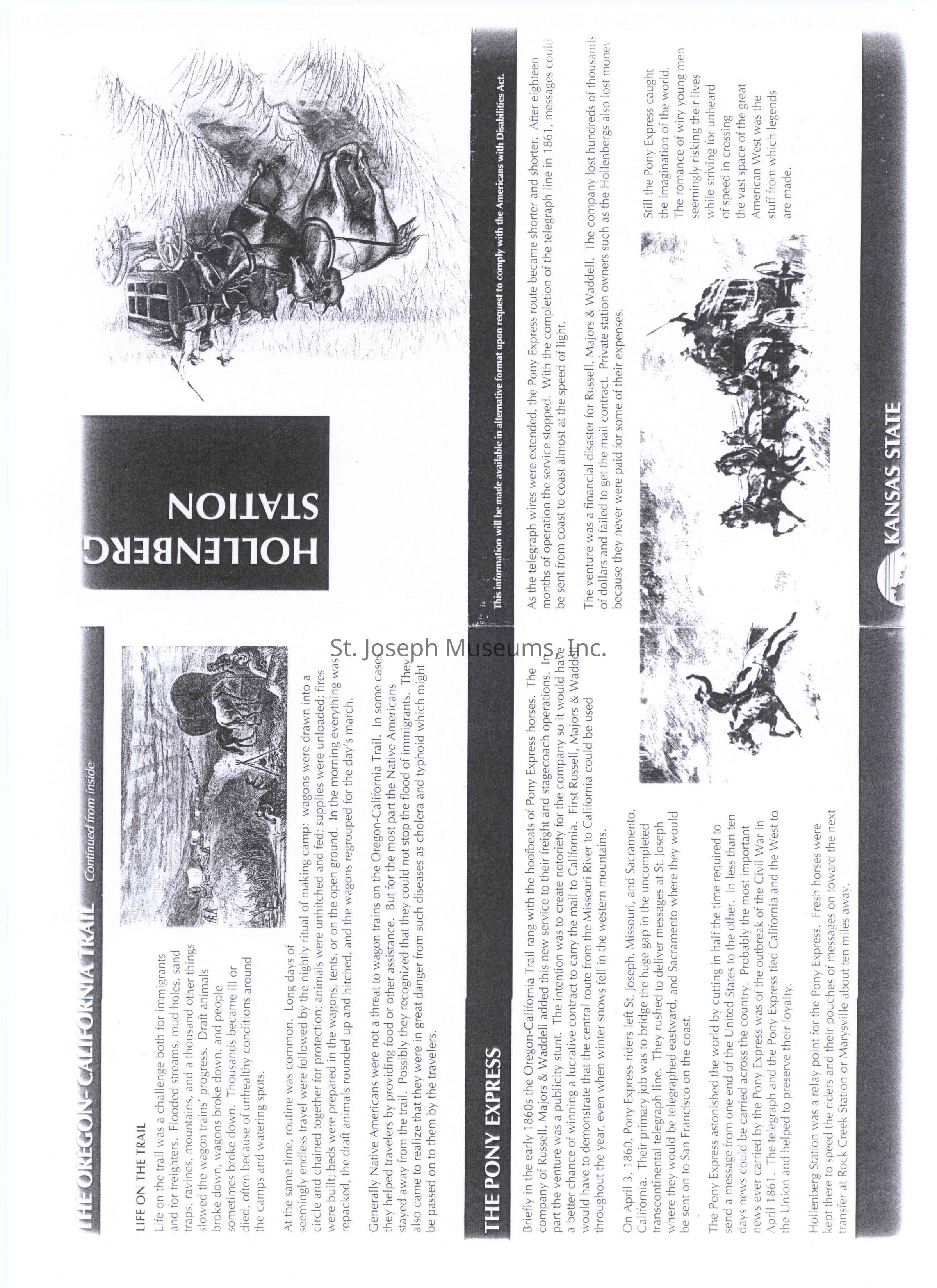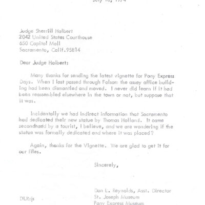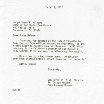 Files contain correspondence with Pony Rider descendants, Pony Express rider biographies, newspaper clippings related to the Pony Express, and miscellaneous records, photos, and documents collected from major private and University libraries among other sources. NOTE ABOUT ORIGIN OF LIBRARIES FILE. Prior to the opening of the renovated Pony Express Museum in 1993, St. Joseph Museum staff did extensive research on the Pony Express. All of the libraries in this folder were visited and copies of all material related to the Pony Express were made. This was done from 1991 to 1993. Information from this research was used in the new exhibits of the Pony Express Museum and in preparation of the book On the Winds of Destiny. In 2015, the file from the Pony Express Museum was added. Jackie Lewin 7/27/15 CD containing scans of actual documents found in Pony Express Research Files located in file cabinets in Document Storage II area.