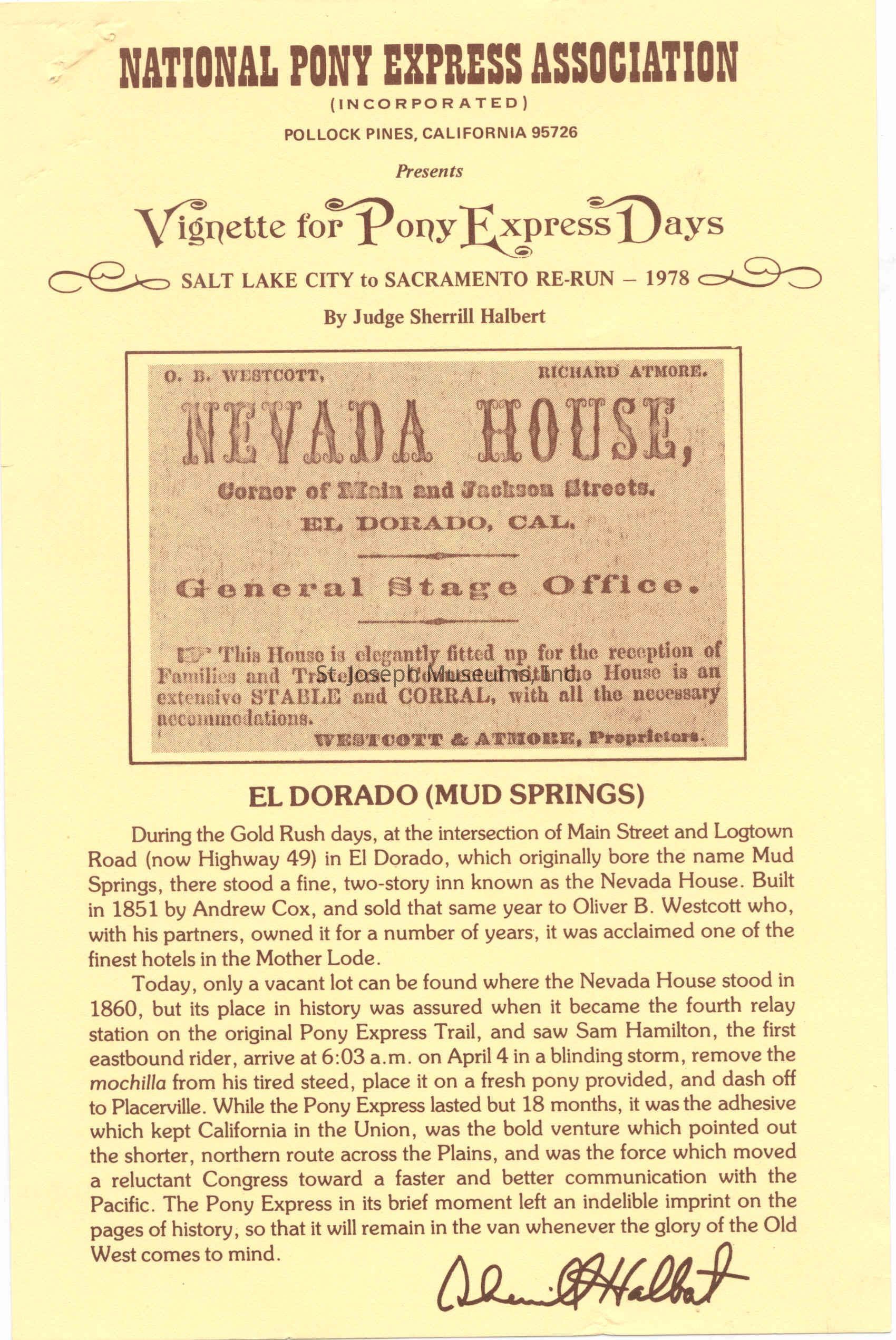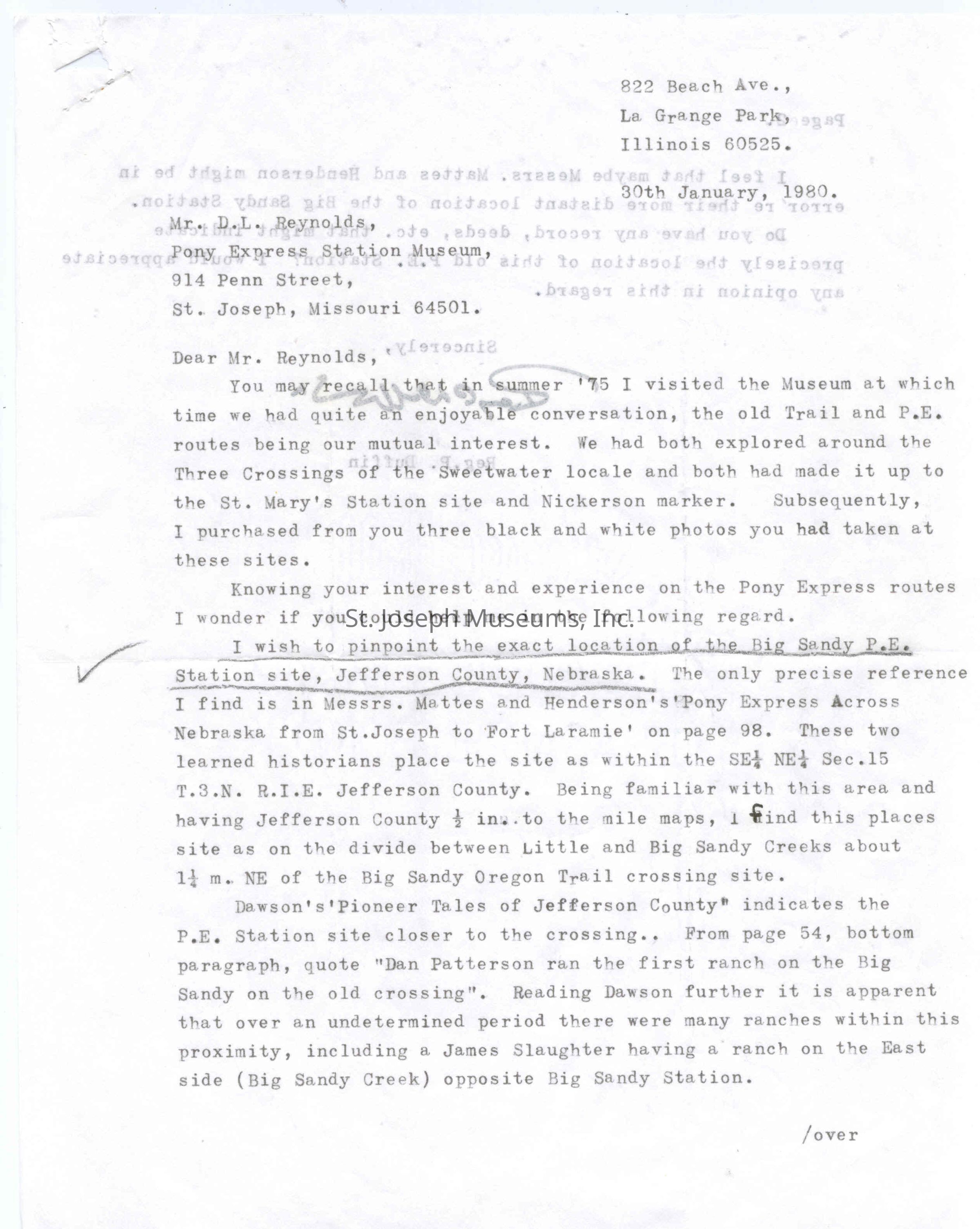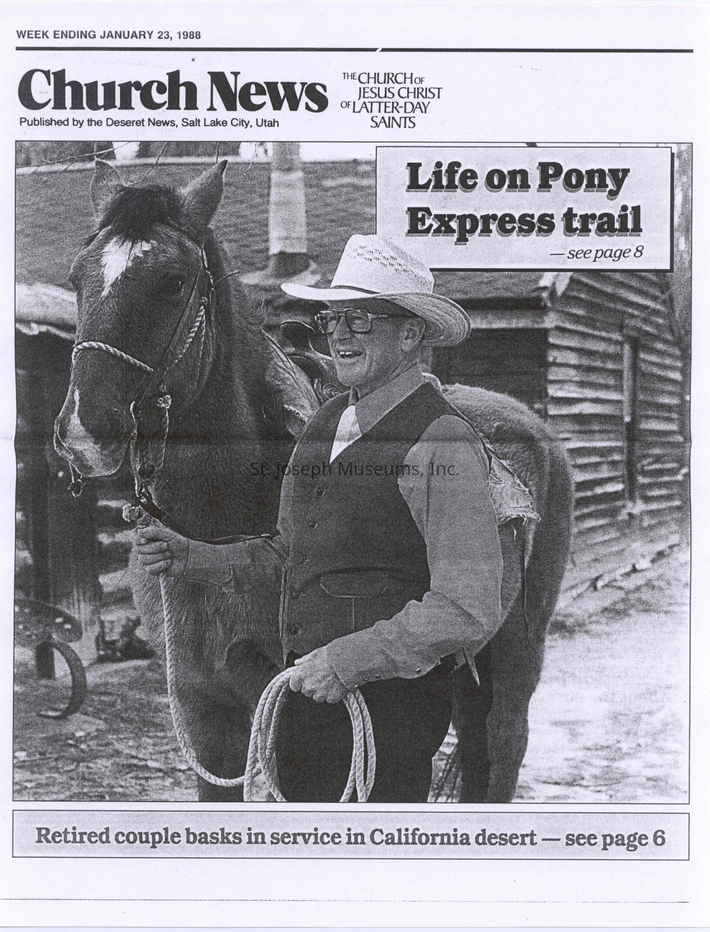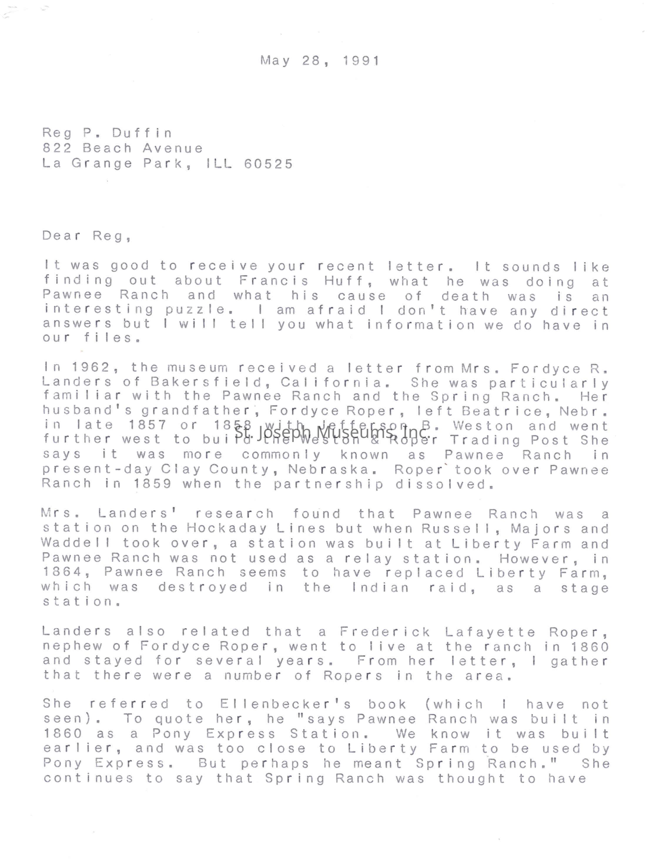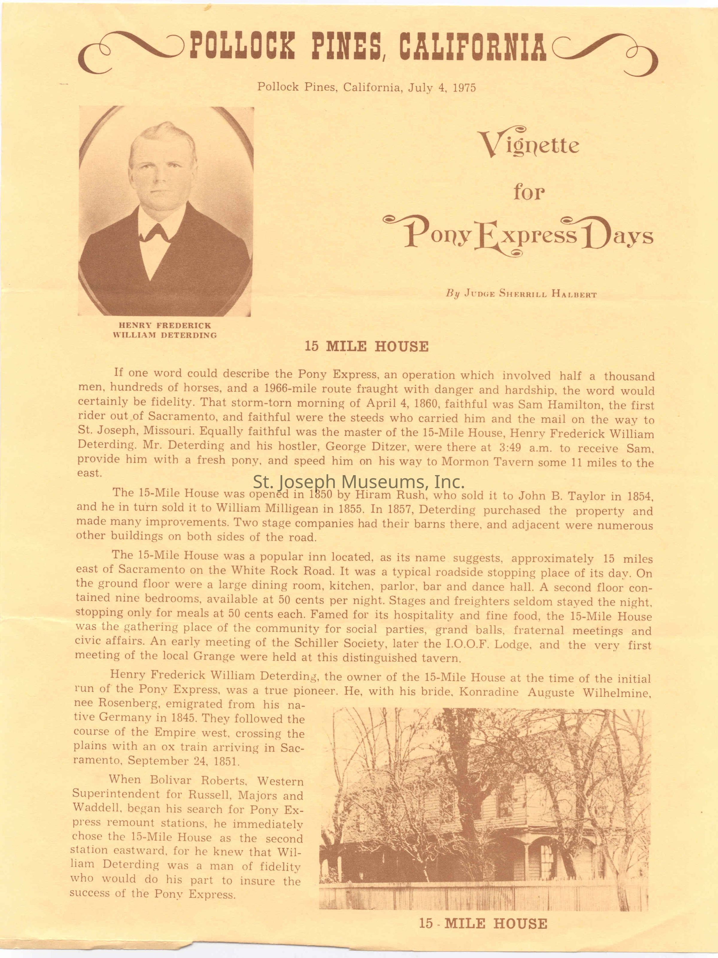 Files contain correspondence with Pony Rider descendants, Pony Express rider biographies, newspaper clippings related to the Pony Express, and miscellaneous records, photos, and documents collected from major private and University libraries among other sources. NOTE ABOUT ORIGIN OF LIBRARIES FILE. Prior to the opening of the renovated Pony Express Museum in 1993, St. Joseph Museum staff did extensive research on the Pony Express. All of the libraries in this folder were visited and copies of all material related to the Pony Express were made. This was done from 1991 to 1993. Information from this research was used in the new exhibits of the Pony Express Museum and in preparation of the book On the Winds of Destiny. In 2015, the file from the Pony Express Museum was added. Jackie Lewin 7/27/15 CD containing scans of actual documents found in Pony Express Research Files located in file cabinets in Document Storage II area.