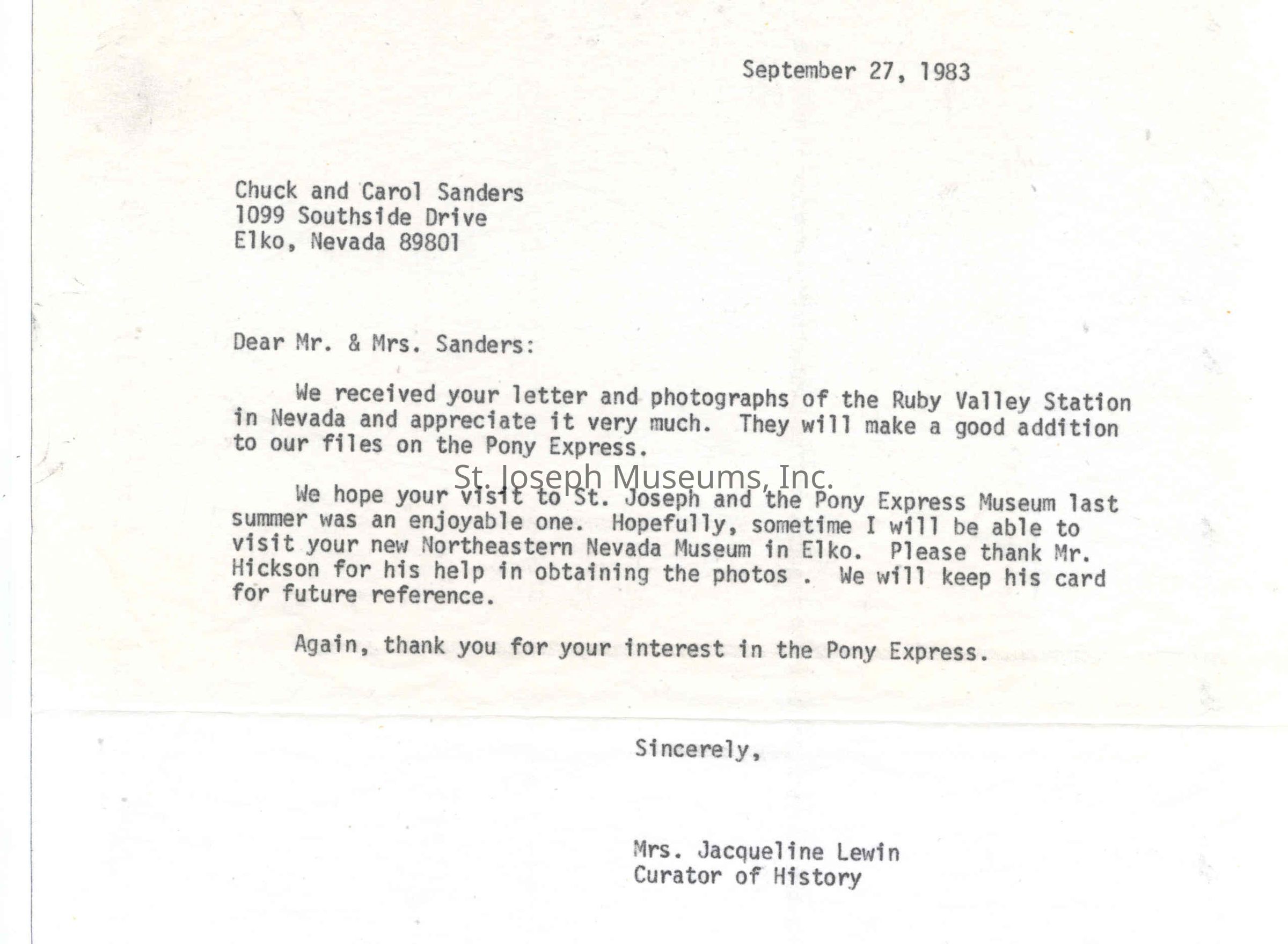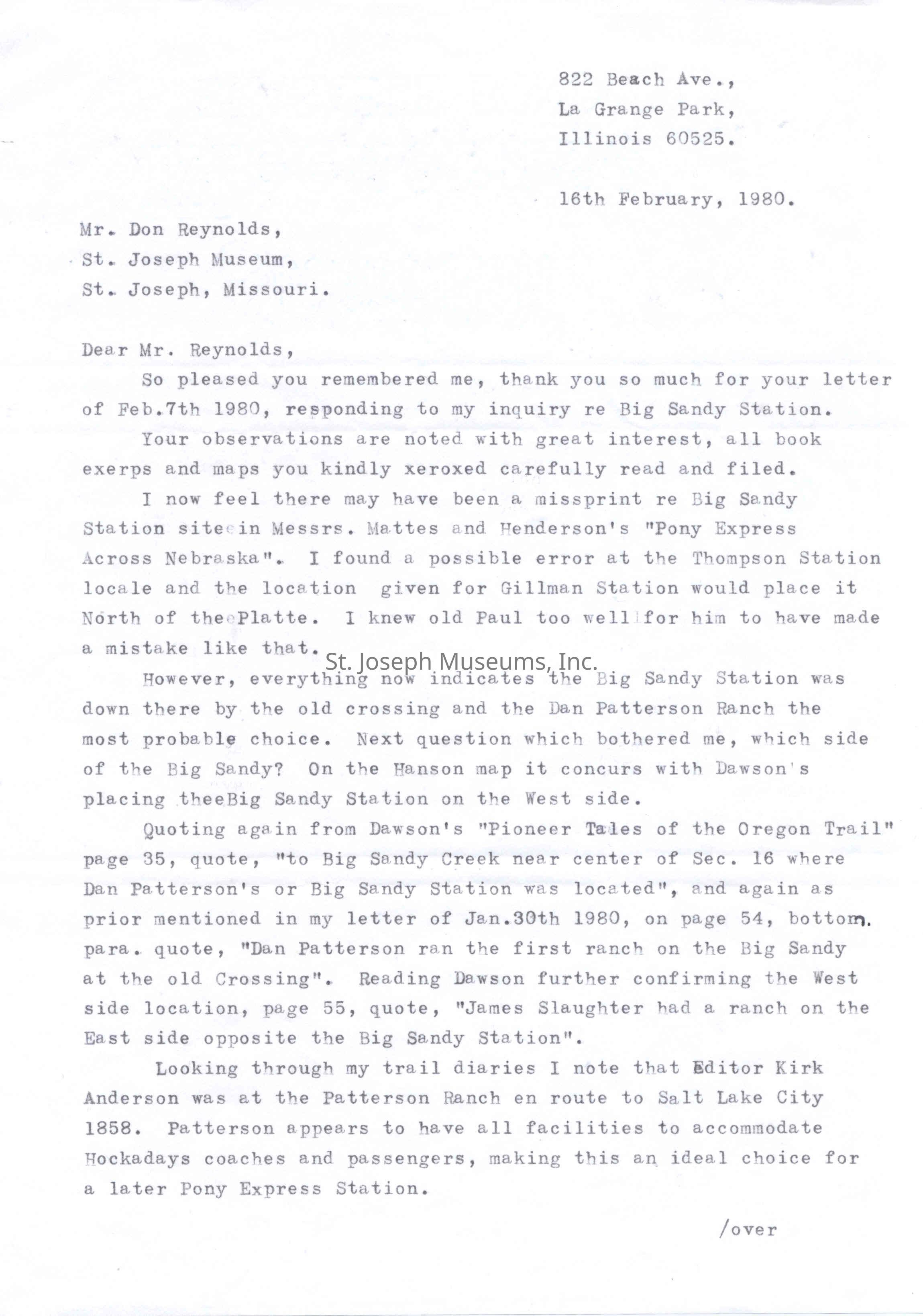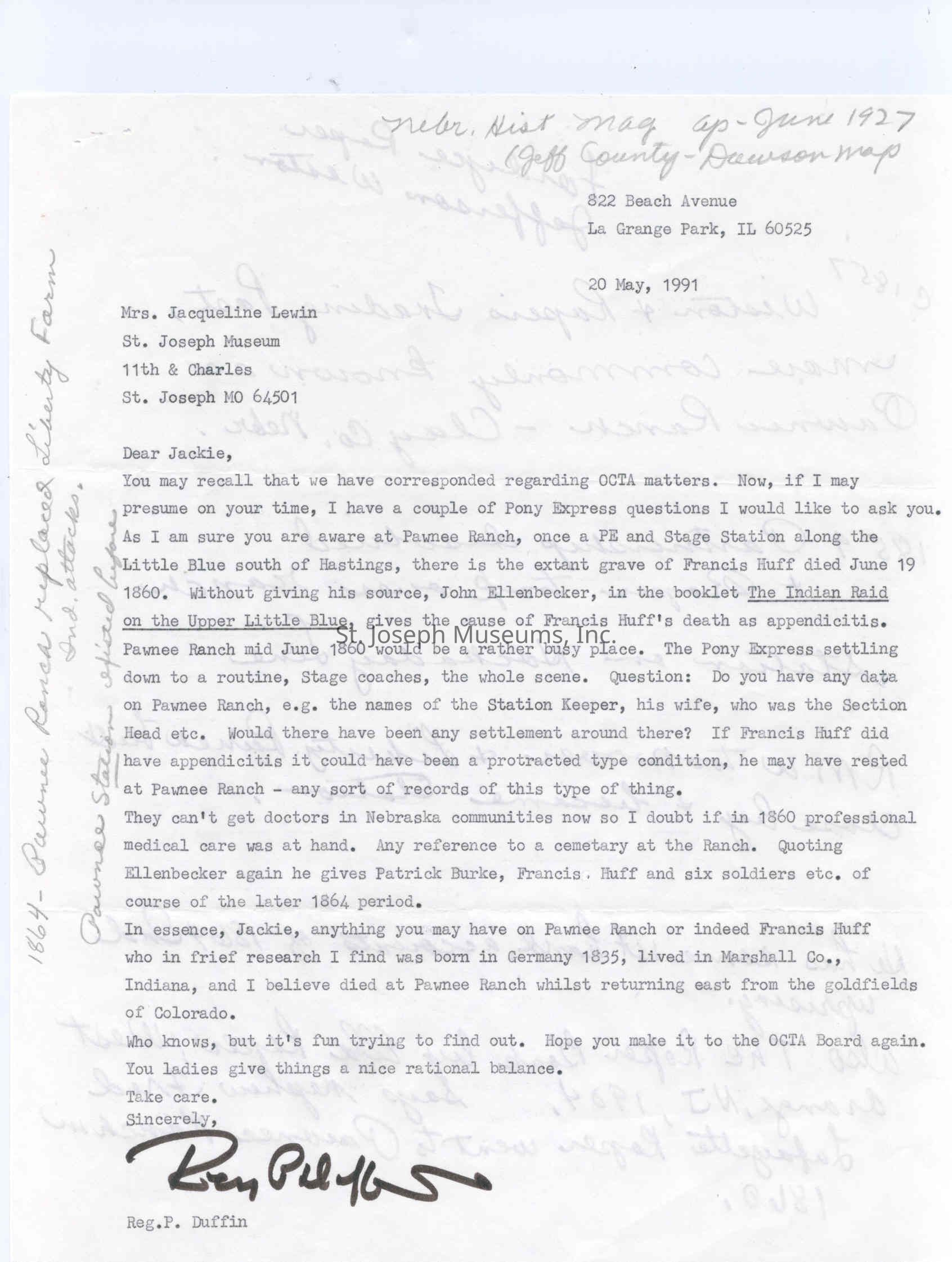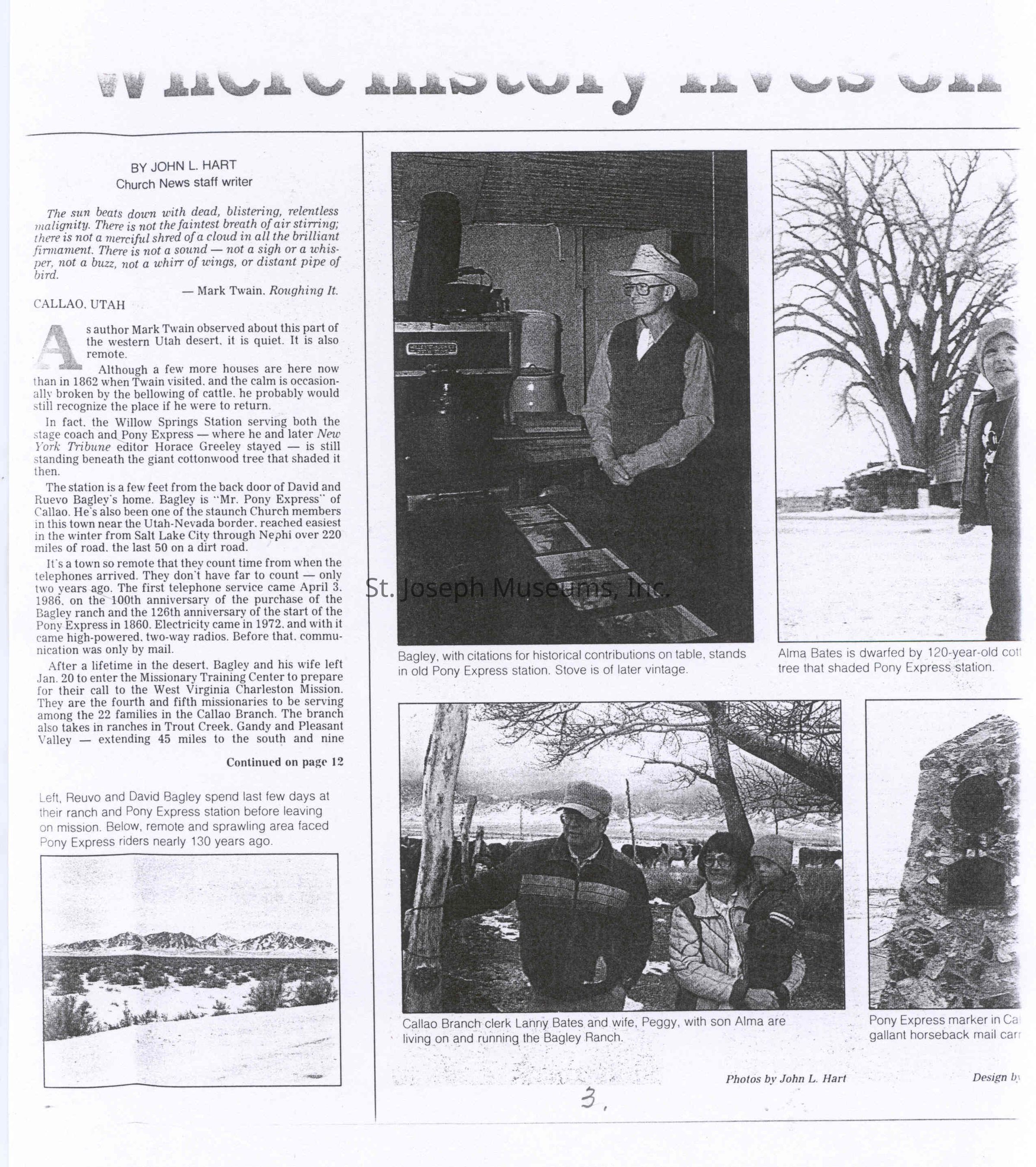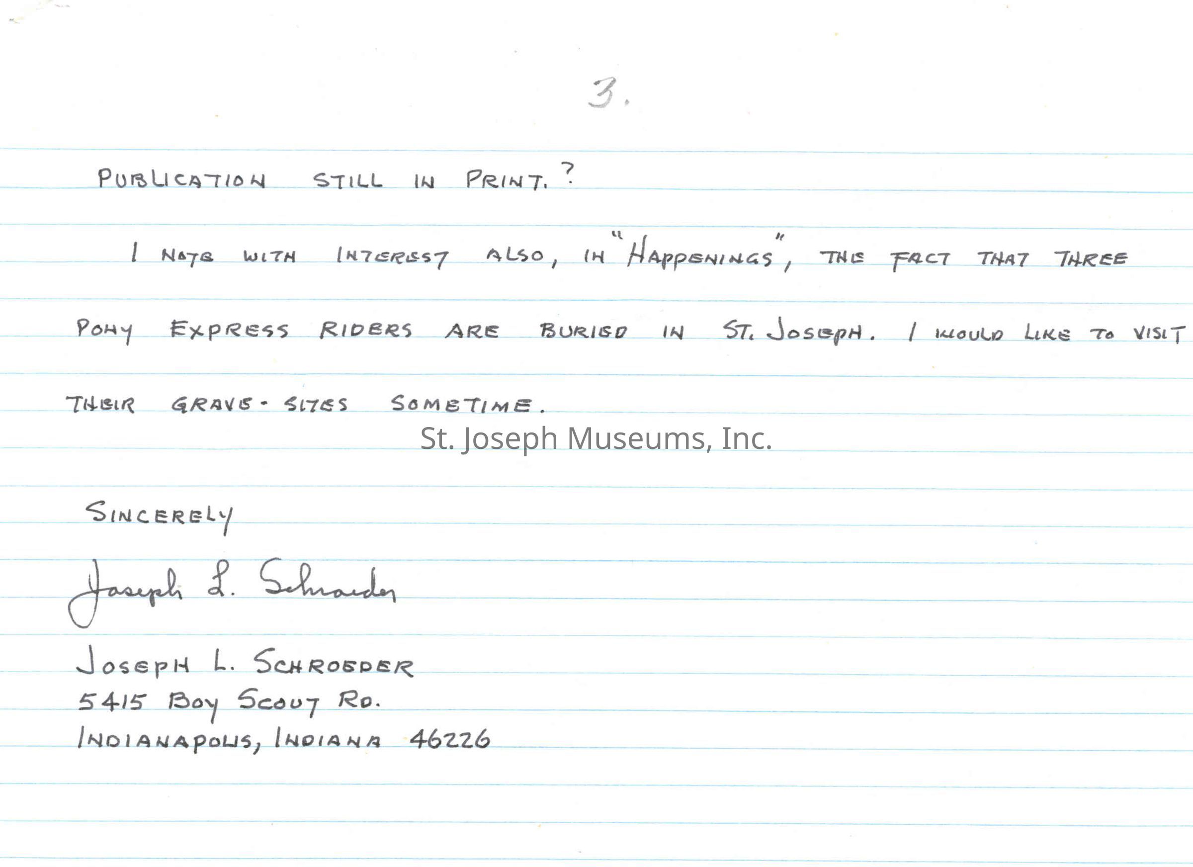 Files contain correspondence with Pony Rider descendants, Pony Express rider biographies, newspaper clippings related to the Pony Express, and miscellaneous records, photos, and documents collected from major private and University libraries among other sources. NOTE ABOUT ORIGIN OF LIBRARIES FILE. Prior to the opening of the renovated Pony Express Museum in 1993, St. Joseph Museum staff did extensive research on the Pony Express. All of the libraries in this folder were visited and copies of all material related to the Pony Express were made. This was done from 1991 to 1993. Information from this research was used in the new exhibits of the Pony Express Museum and in preparation of the book On the Winds of Destiny. In 2015, the file from the Pony Express Museum was added. Jackie Lewin 7/27/15 CD containing scans of actual documents found in Pony Express Research Files located in file cabinets in Document Storage II area.