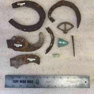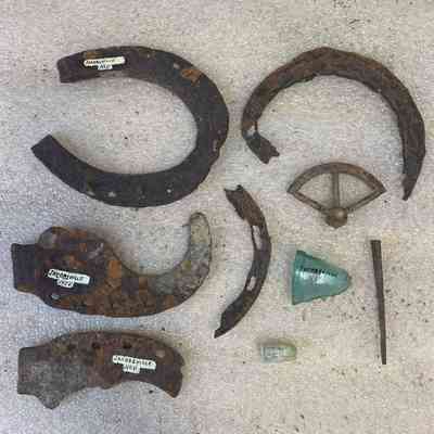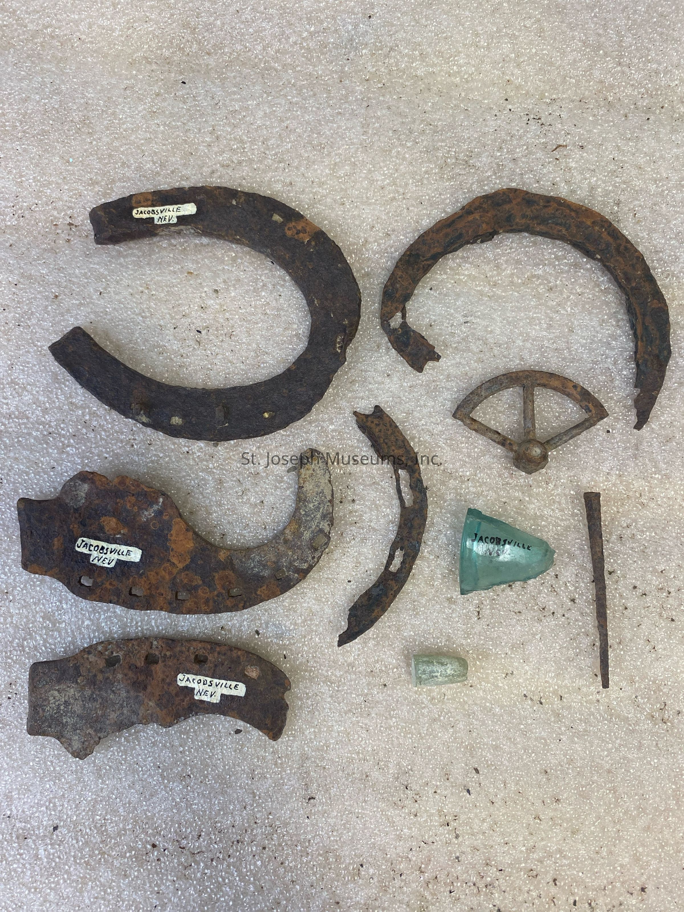 Artifacts/collection/metal, glass/horseshoe, ox shoe, metal ring, bullet, nail, small wire, shards of glass.