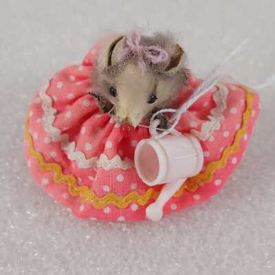 Grey fur mouse with a pink dress and holding a light pink watering can.