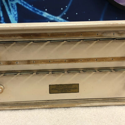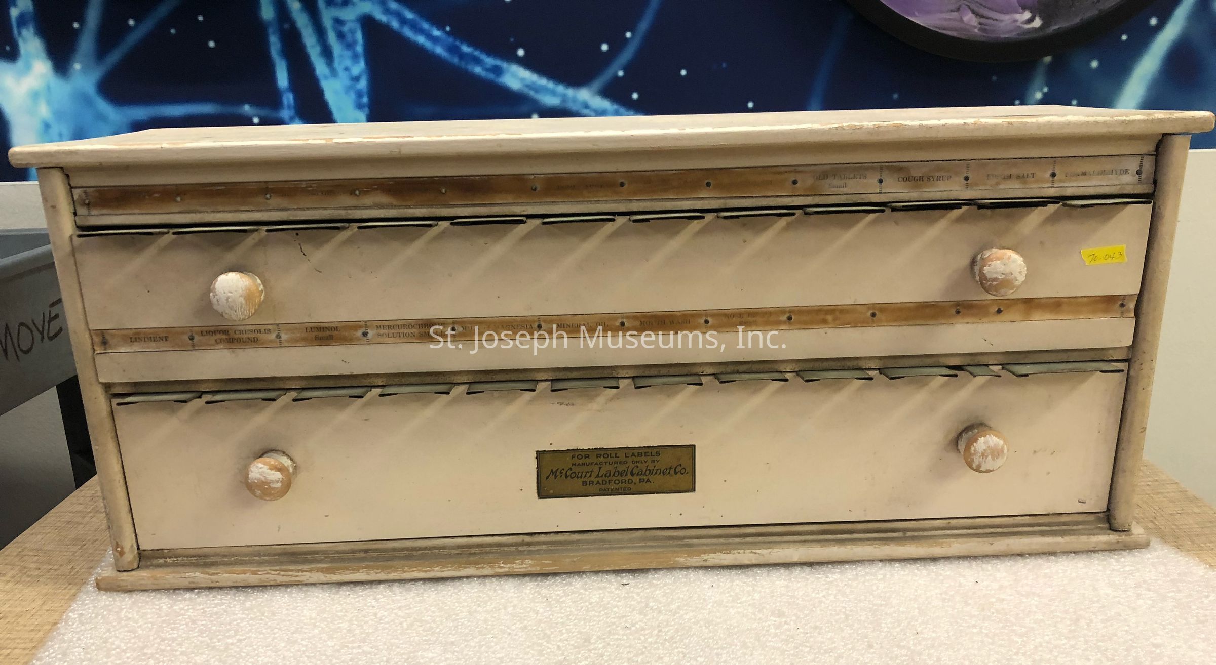 Large Pharmacy Lable Cabinet/ used for storing and despencing lables for medicines/ Wooden painted white, two drawers each with 12 compartments for storing rolls of lables that would have been feed thou the copper fins at the top of the drawer to be pulled an town off. Gold and black lable on front of bottom Drawer "For Roll Lables Manufactured only by McCourt Lable Cabinet Co. Bradford Pa"Collection