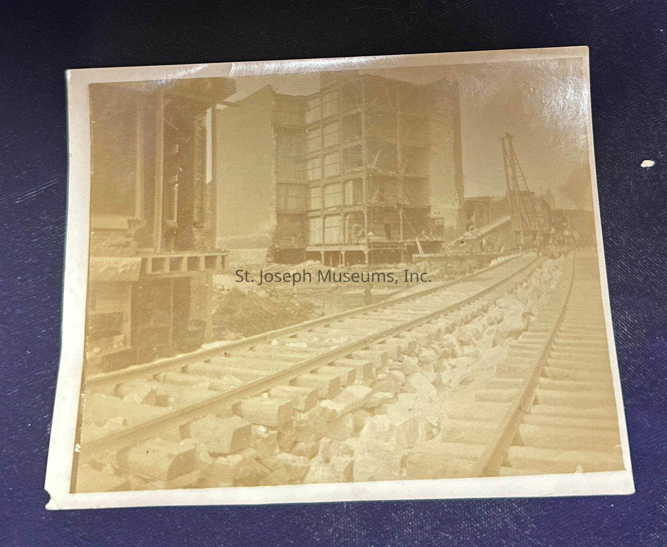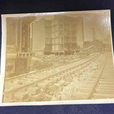 Sepia photograph of a railway and building under construction.