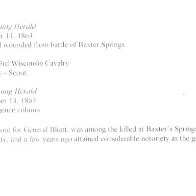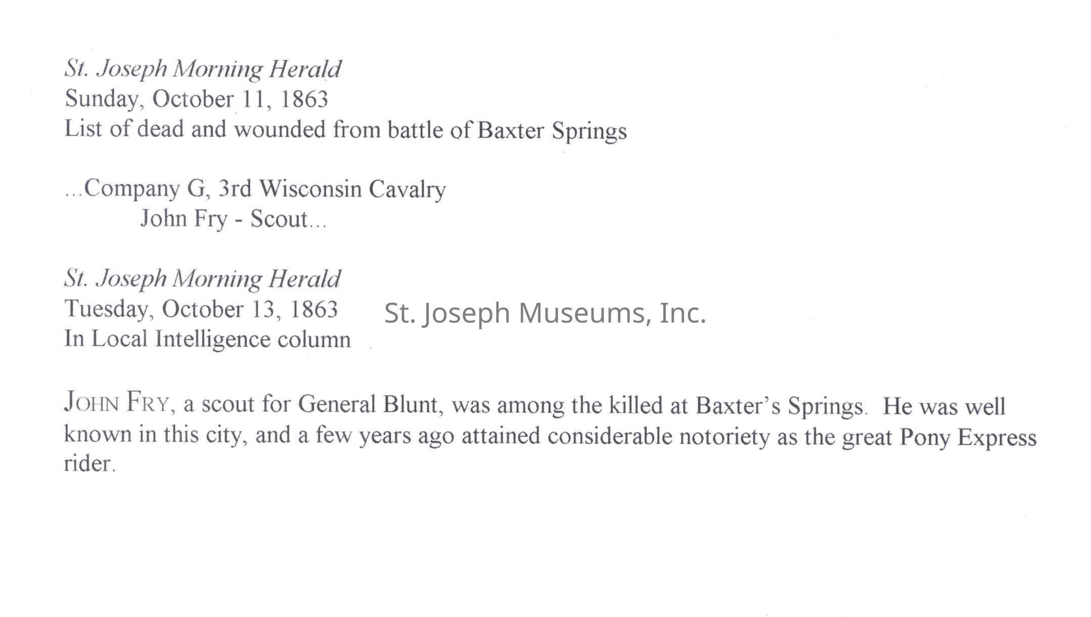 Files contain correspondence with Pony Rider descendants, Pony Express rider biographies, newspaper clippings related to the Pony Express, and miscellaneous records, photos, and documents collected from major private and University libraries among other sources. NOTE ABOUT ORIGIN OF LIBRARIES FILE. Prior to the opening of the renovated Pony Express Museum in 1993, St. Joseph Museum staff did extensive research on the Pony Express. All of the libraries in this folder were visited and copies of all material related to the Pony Express were made. This was done from 1991 to 1993. Information from this research was used in the new exhibits of the Pony Express Museum and in preparation of the book On the Winds of Destiny. In 2015, the file from the Pony Express Museum was added. Jackie Lewin 7/27/15 CD containing scans of actual documents found in Pony Express Research Files located in file cabinets in Document Storage II area.
