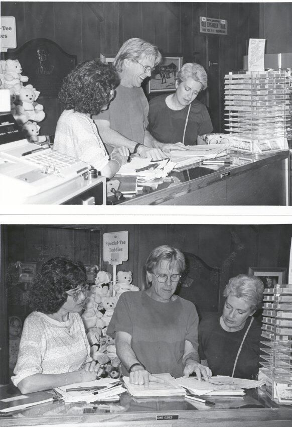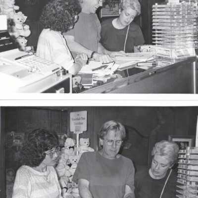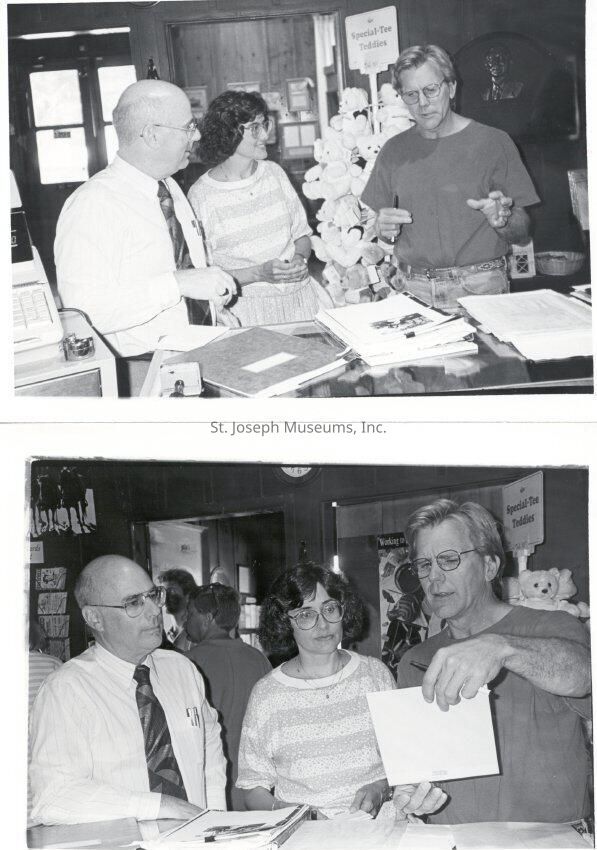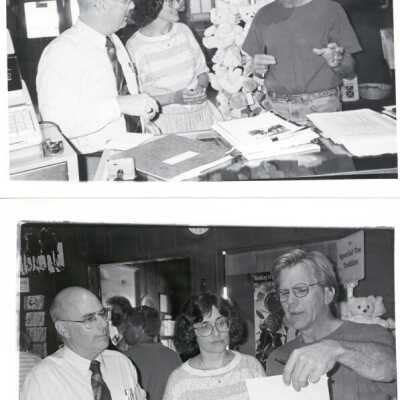 Ritter, D/wight, Museum Consultant, Pony Express Museum, Photos (5), 1992. b/w. Photos taken of Ritter during his assignment at Pony Express Museum. He had held a Strategic Planning Session, (See 97.1P.379-384). In these photos he is shown at the gift shop counter meeting with various Museum staff persons as below: