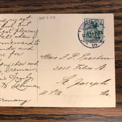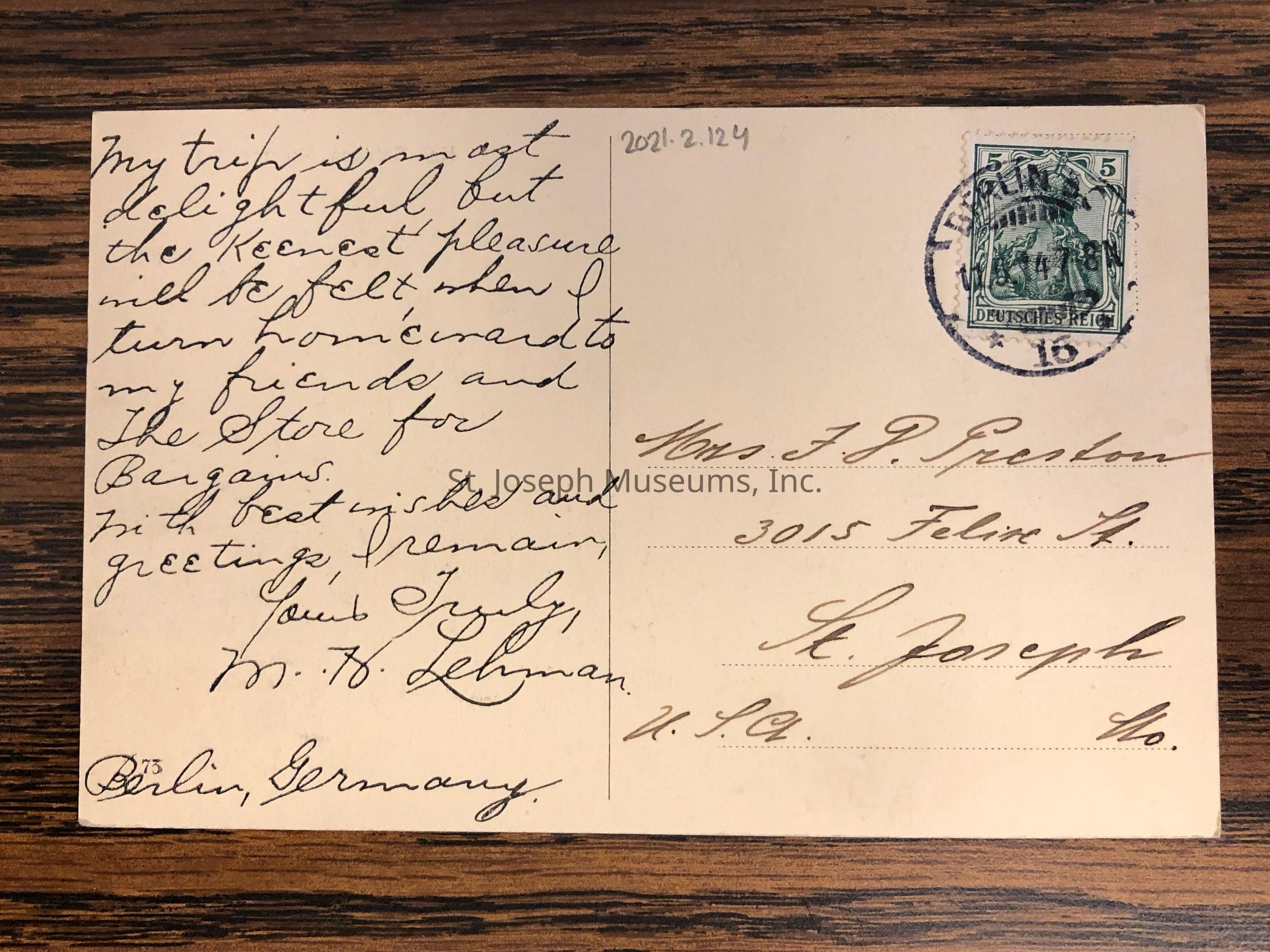 On the front of the postcard is a handwritten address and message from M. N. Lehman, one in stamp, and one physical stamp.