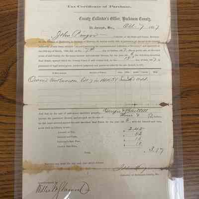 Tax Certificate of Purchase, Land Sales in St. Joseph 1867, Tax Purchases, Buchanan County, St. Joseph Merchants, Durfee & BartlettLegacy Lexicon