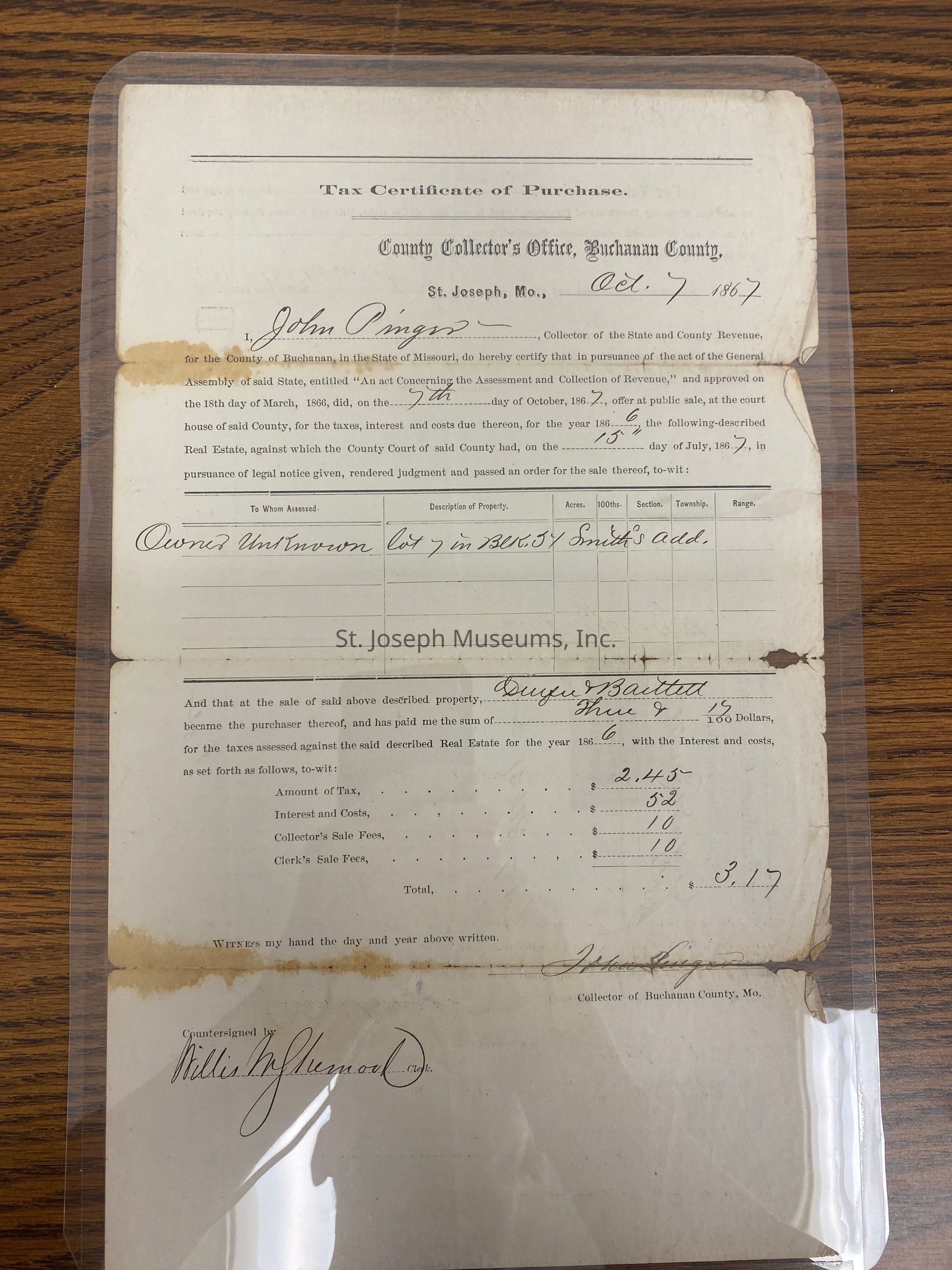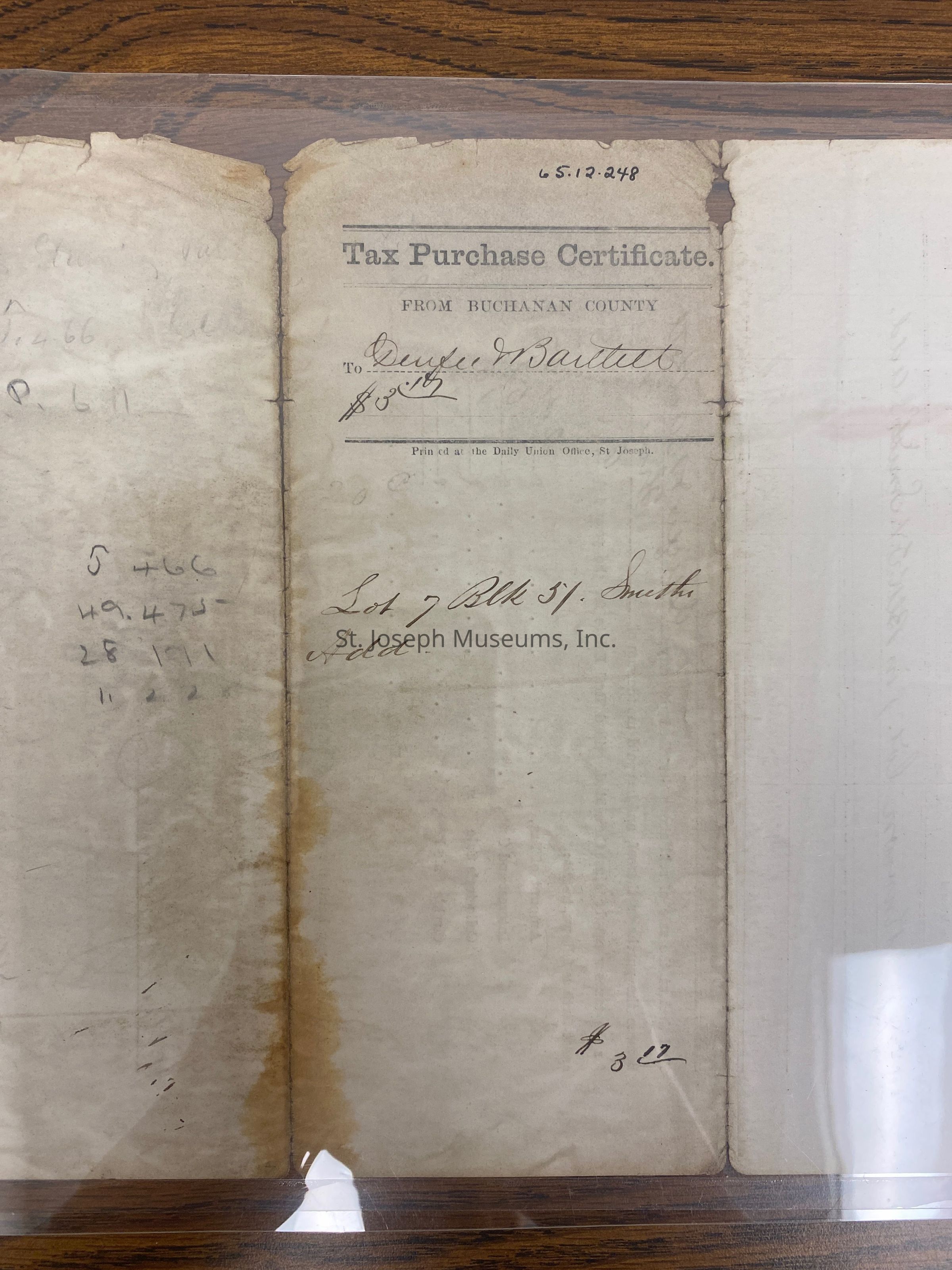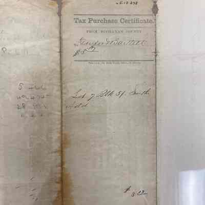 Tax Purchase Certificate to Durfee and Bartlett on October 7, 1867 lot 7 in block 54 of Smith's Addition was sold at public sale at the court house of Buchanan County for the taxes, interest and cost due thereon for the year 1866 . The owner was unknown. The price paid for the land was $3.17.Lexicon