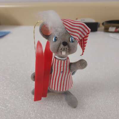 A grey mouse ornament wearing red and white striped pajamas with a matching nightcap carrying red skies in his right paw.