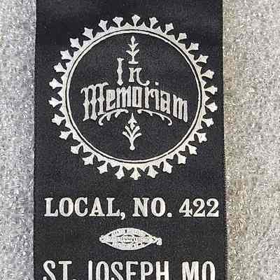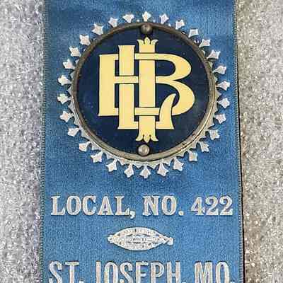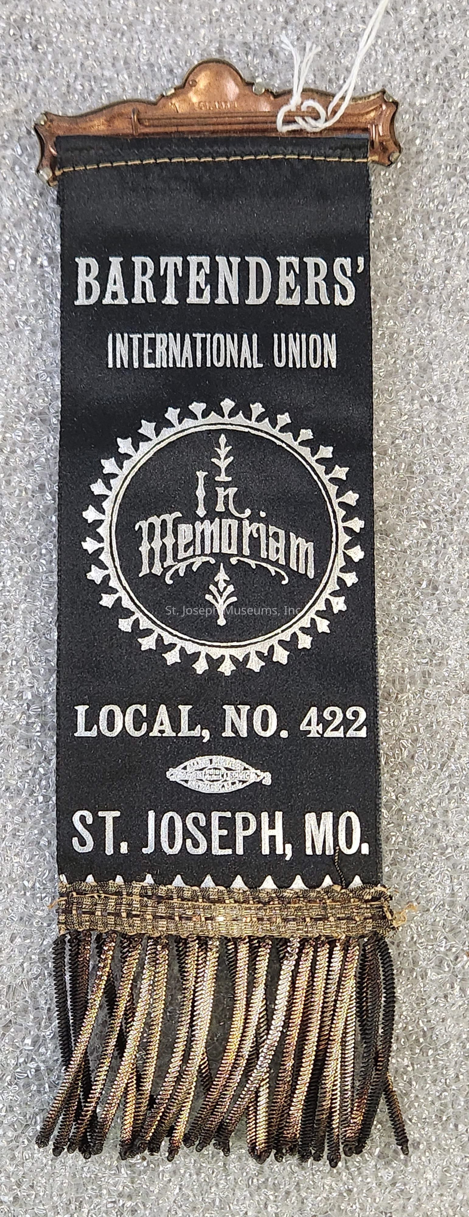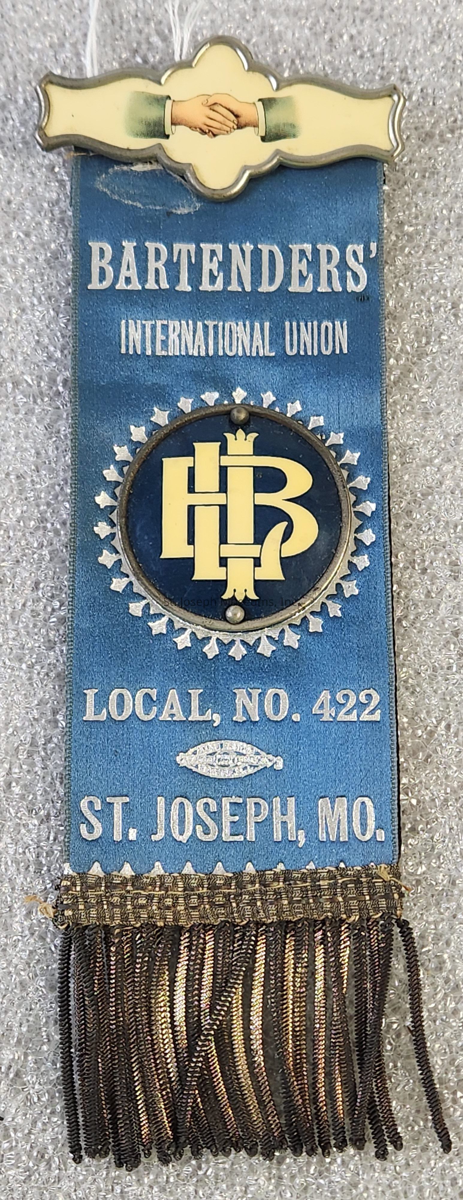 Ribbon/Blue/Silver Print/ "Bartenders' International Union Local, No. 422 St. Joseph, Mo."/Metal and Plastic Pin and Centerpiece/Image of Two Hands Shaking/Interlocking "BIL"/8 ¼"x3"x ½"/Paper Envelope with String/9 ½"x3 ½".Collection