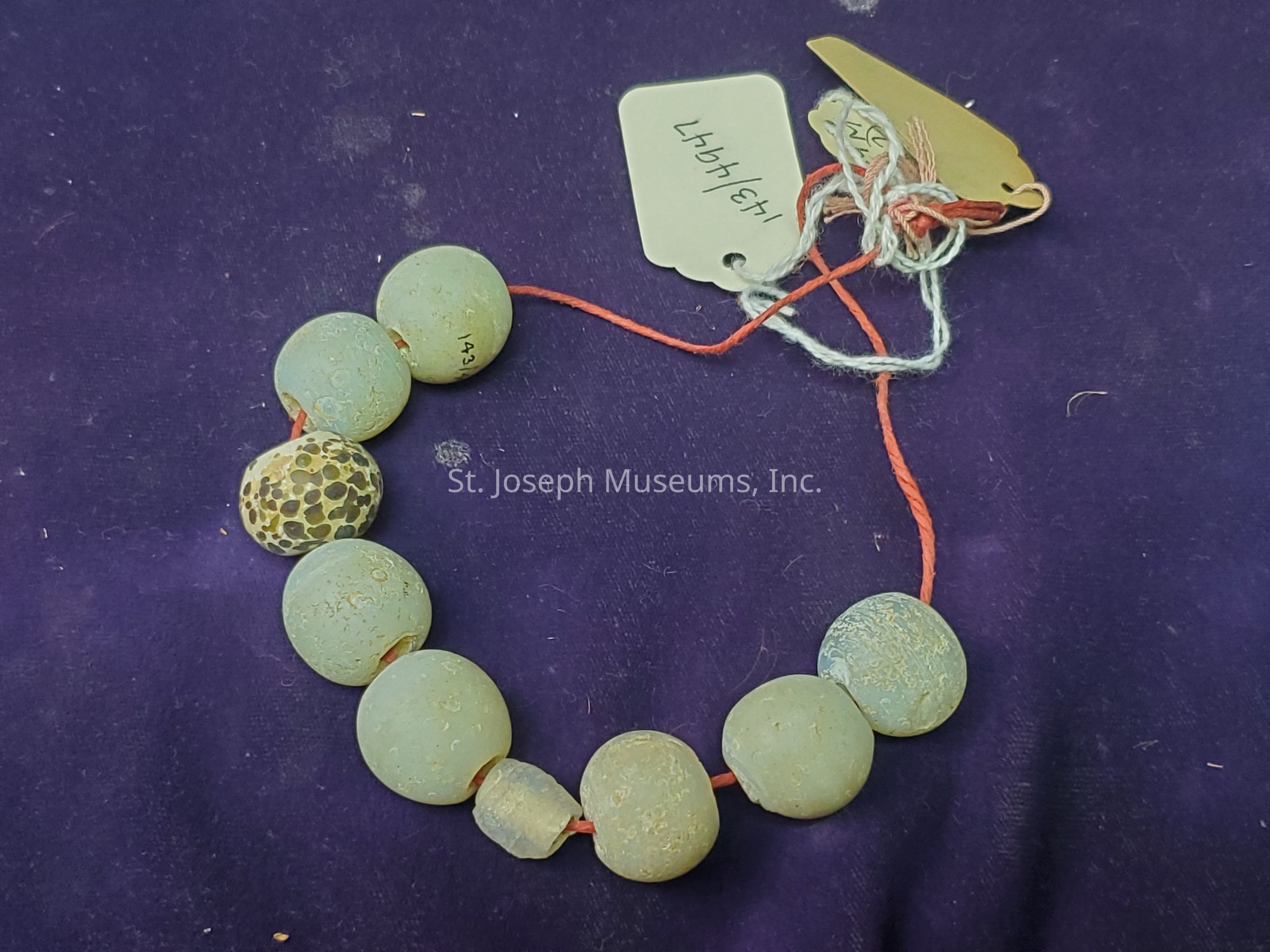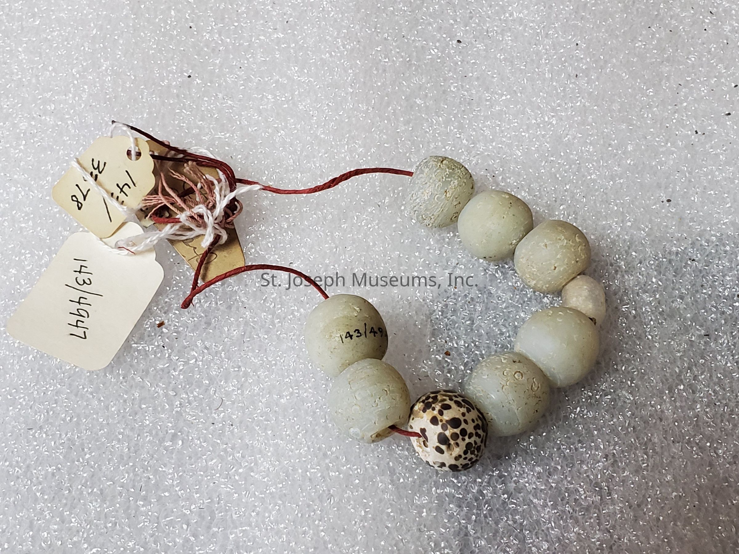 BEADS/9 BEADS STRUNG ON RED TWINE/ONE BEAD BROWN SPECKLED/NECKLACE/APPROX. 1/2 X 3/4 INCH BEAD