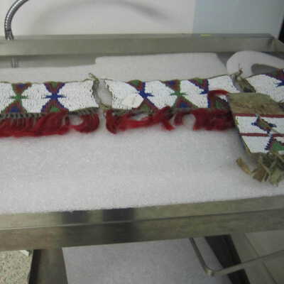 BELT AND PURSE/HORSEHAIR TASSELS/4 PIECES OF SOLID BEAD WORK, JOINED WITH THONGS/PURSE ATTACHED/WTH BELLS