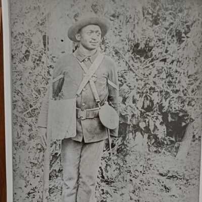 Black-and-white photograph depicting a Black soldier from the Spanish-American War standing confidently. He wears a military uniform complete with a wide-brimmed hat and holds a rifle. The soldier has a cross-body strap and a canteen.
