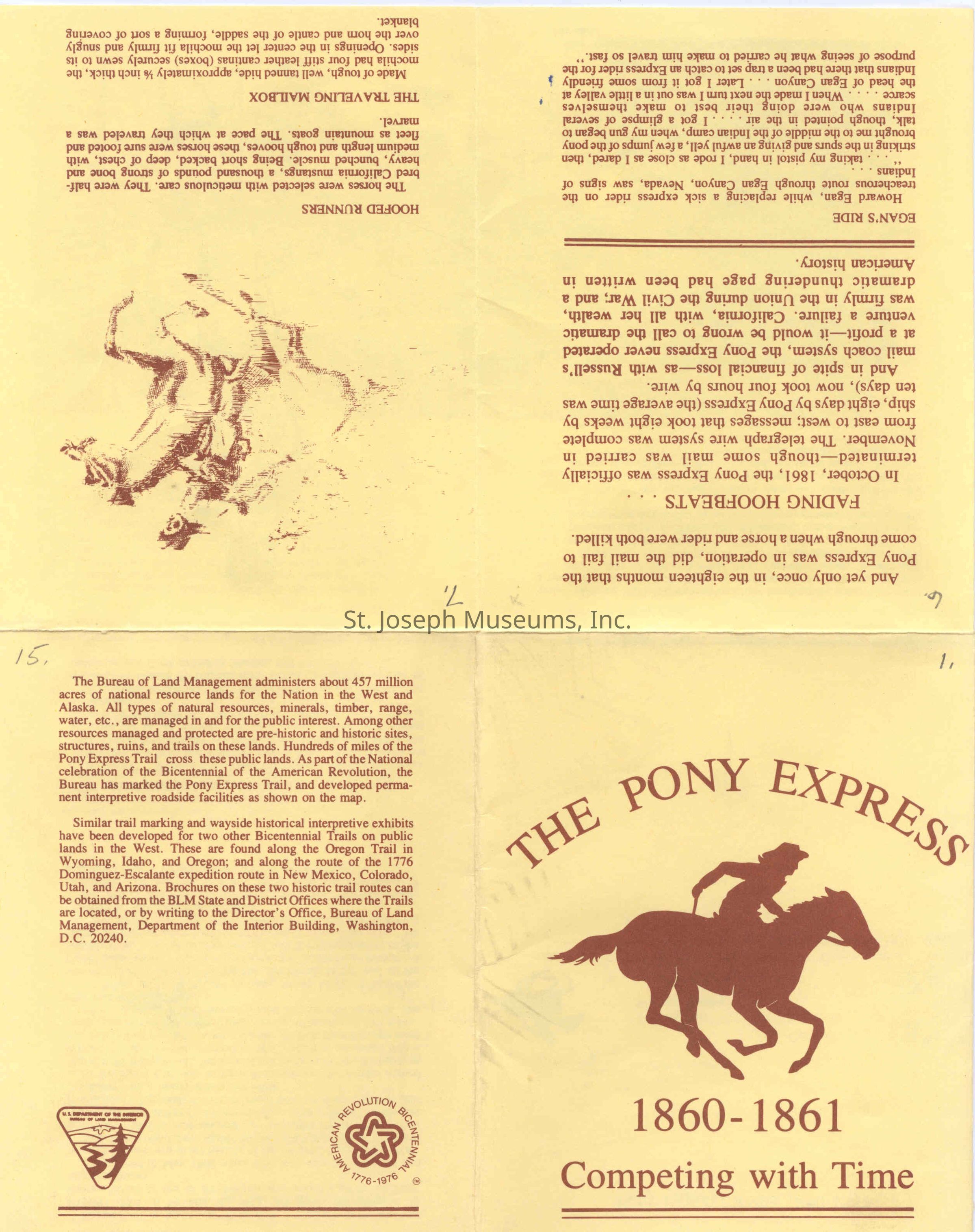 Files contain correspondence with Pony Rider descendants, Pony Express rider biographies, newspaper clippings related to the Pony Express, and miscellaneous records, photos, and documents collected from major private and University libraries among other sources. NOTE ABOUT ORIGIN OF LIBRARIES FILE. Prior to the opening of the renovated Pony Express Museum in 1993, St. Joseph Museum staff did extensive research on the Pony Express. All of the libraries in this folder were visited and copies of all material related to the Pony Express were made. This was done from 1991 to 1993. Information from this research was used in the new exhibits of the Pony Express Museum and in preparation of the book On the Winds of Destiny. In 2015, the file from the Pony Express Museum was added. Jackie Lewin 7/27/15 CD containing scans of actual documents found in Pony Express Research Files located in file cabinets in Document Storage II area.