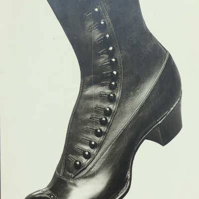 Black-and-white photograph showcasing a vintage-style man's button shoe, elegantly crafted with a high-top design and a series of shiny buttons along the side. The shoe features a slight heel and intricate detailing on the toe cap, reflecting a classic fashion from an earlier era.